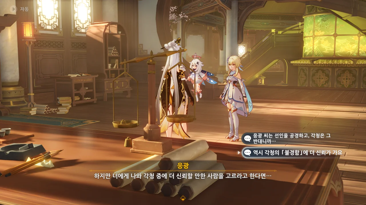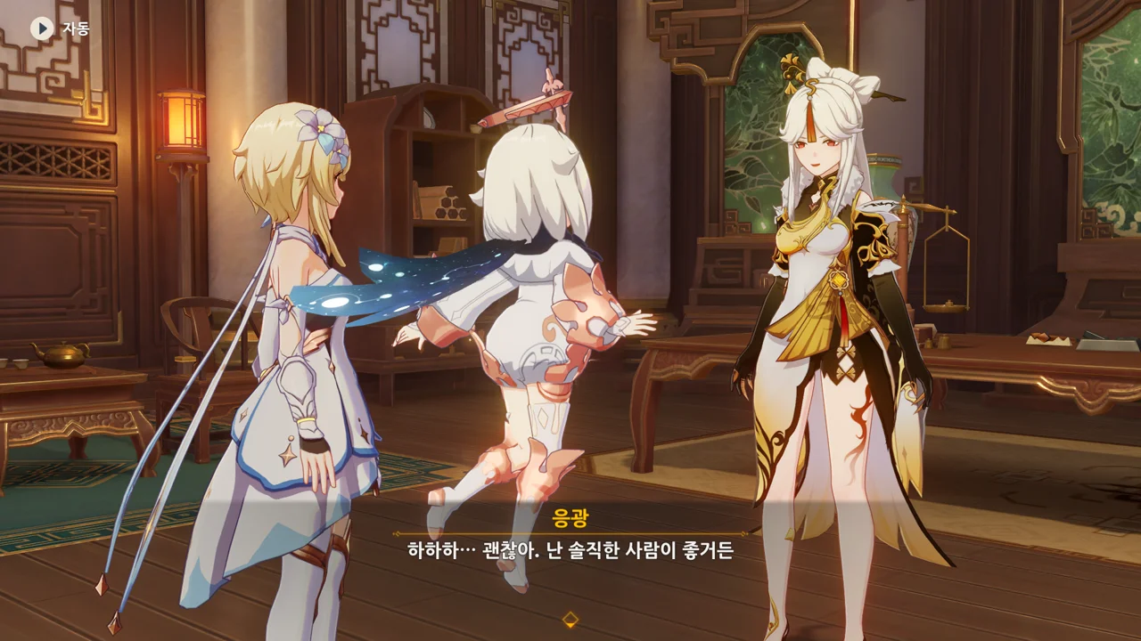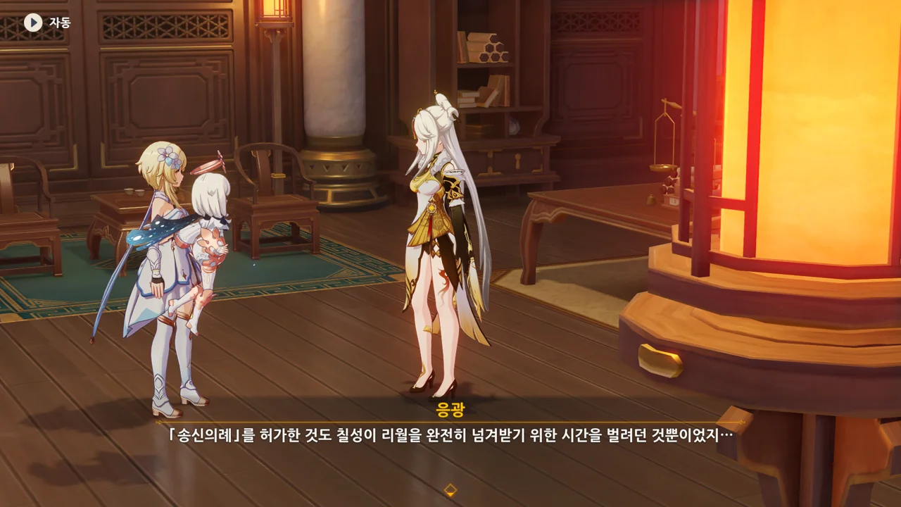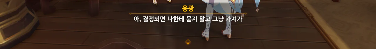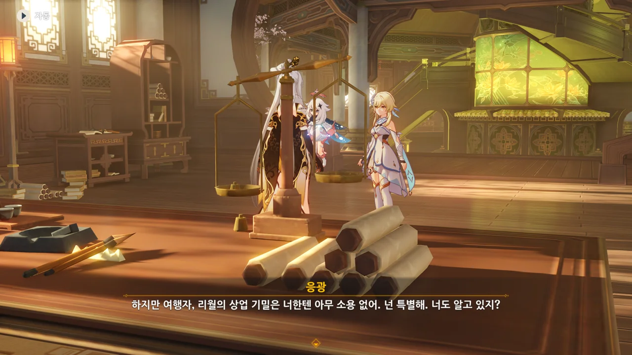 하지만 리월의 상업 기밀은 여행자에게 아무런 쓸모가 없다며, 자신은 여행자의 신뢰를 얻고 싶다고 말하는 응광.