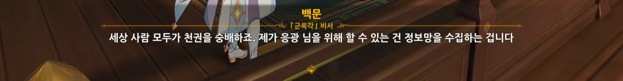 백효는 죄다 '기밀입니다'라고 말하고, 백식은 응광에게 입힐 옷만 머릿속에 가득하지만, 백문은 그래도 실무진이라는 느낌을 준다.