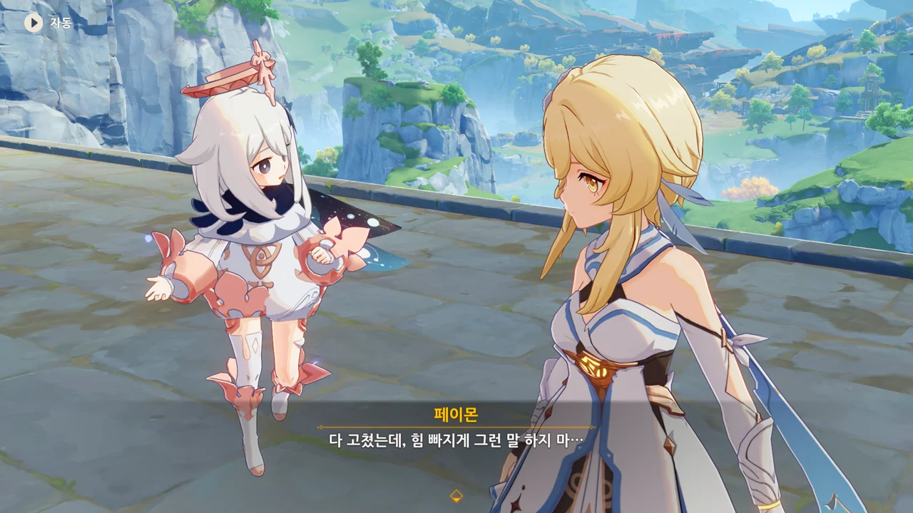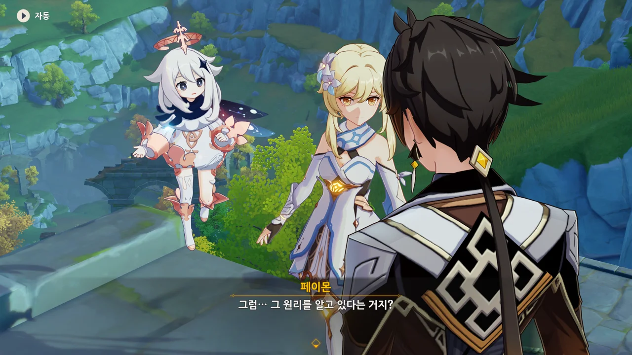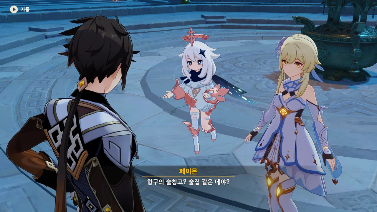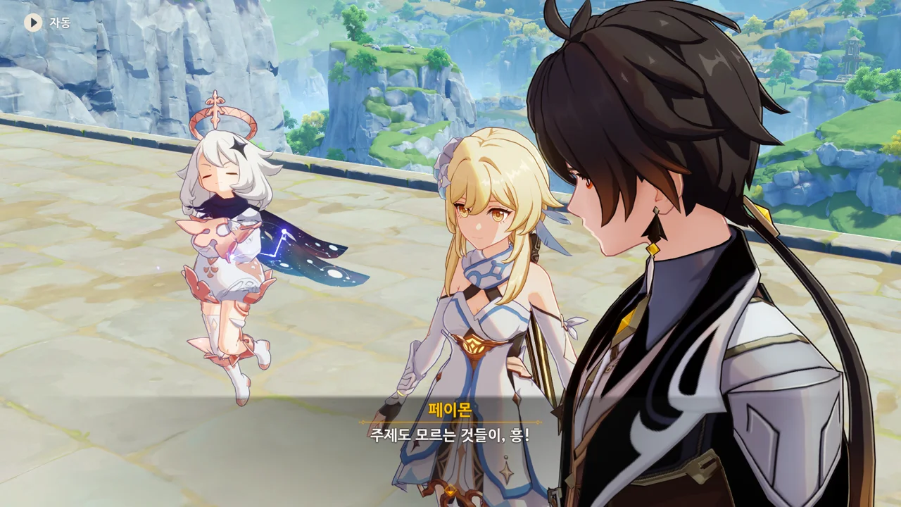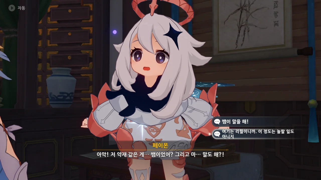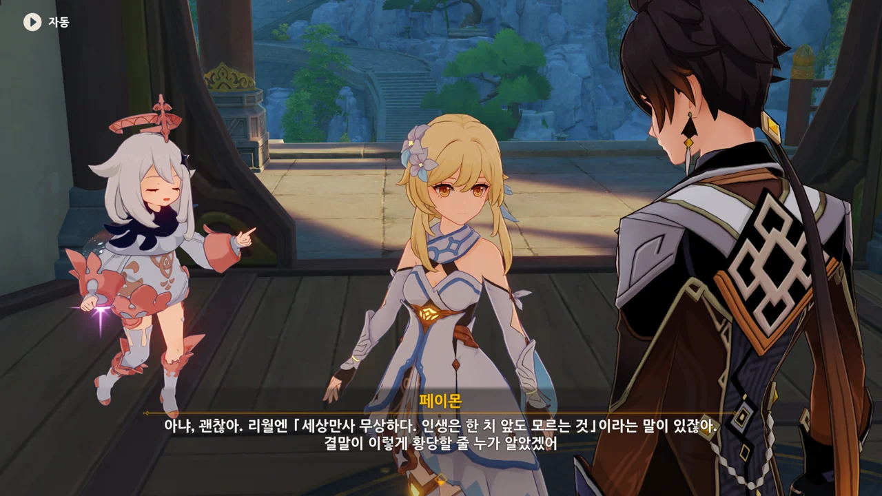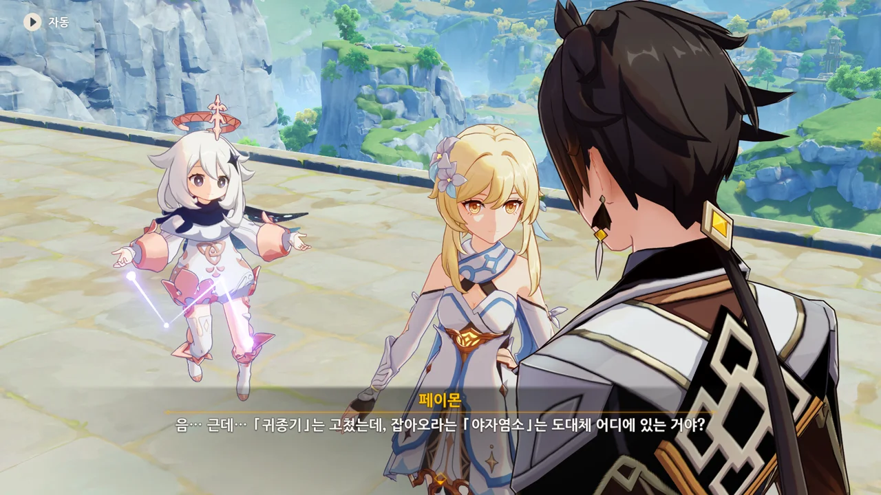 종려와 여행자는 무덤덤하게 서 있는 데에 반해, 페이몬 혼자 화들짝 놀란 모습이 너무 귀엽다.