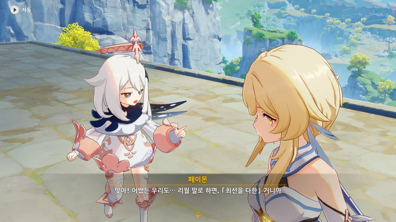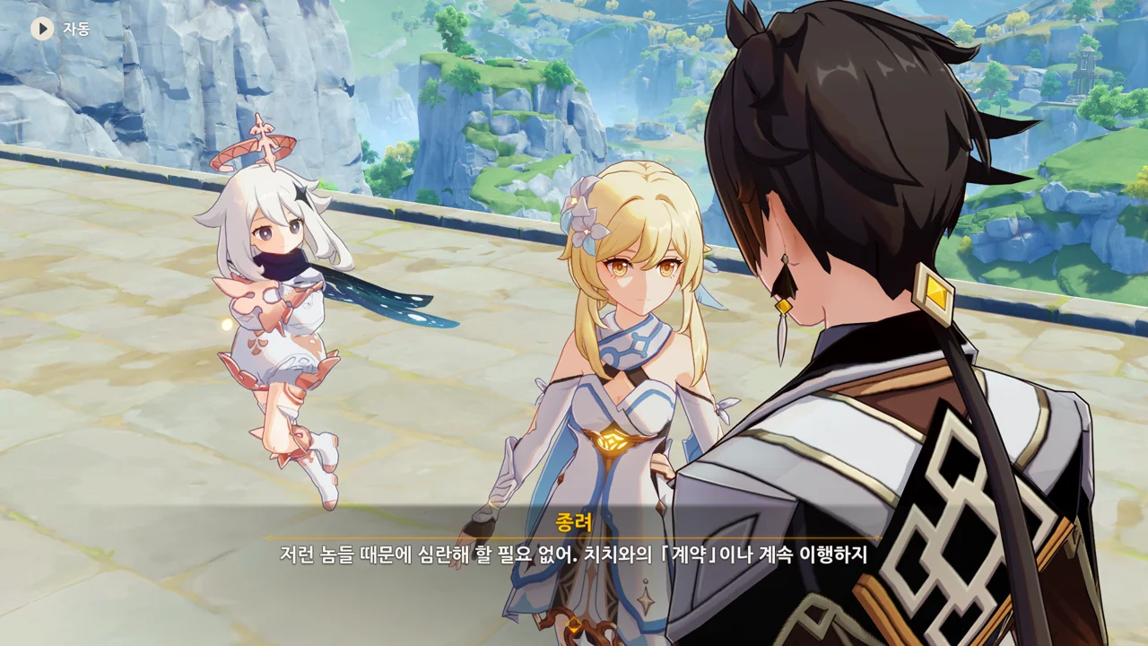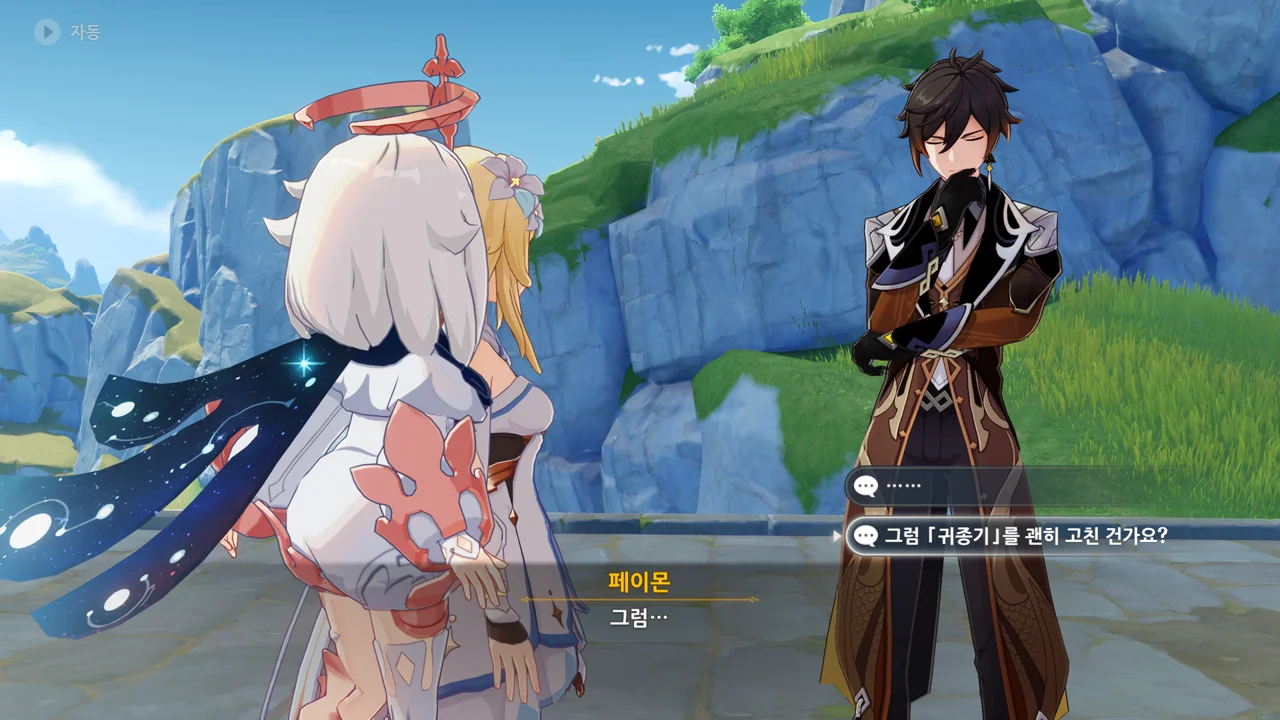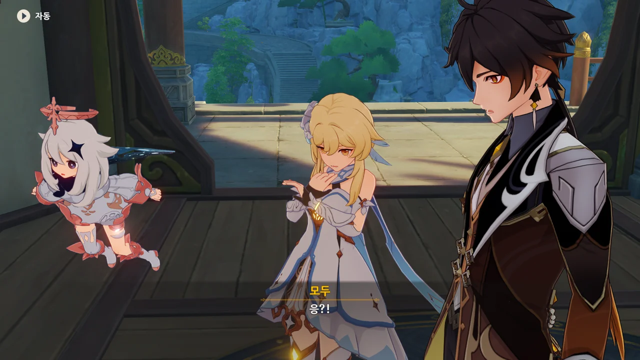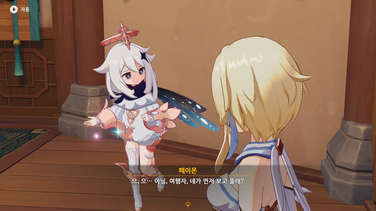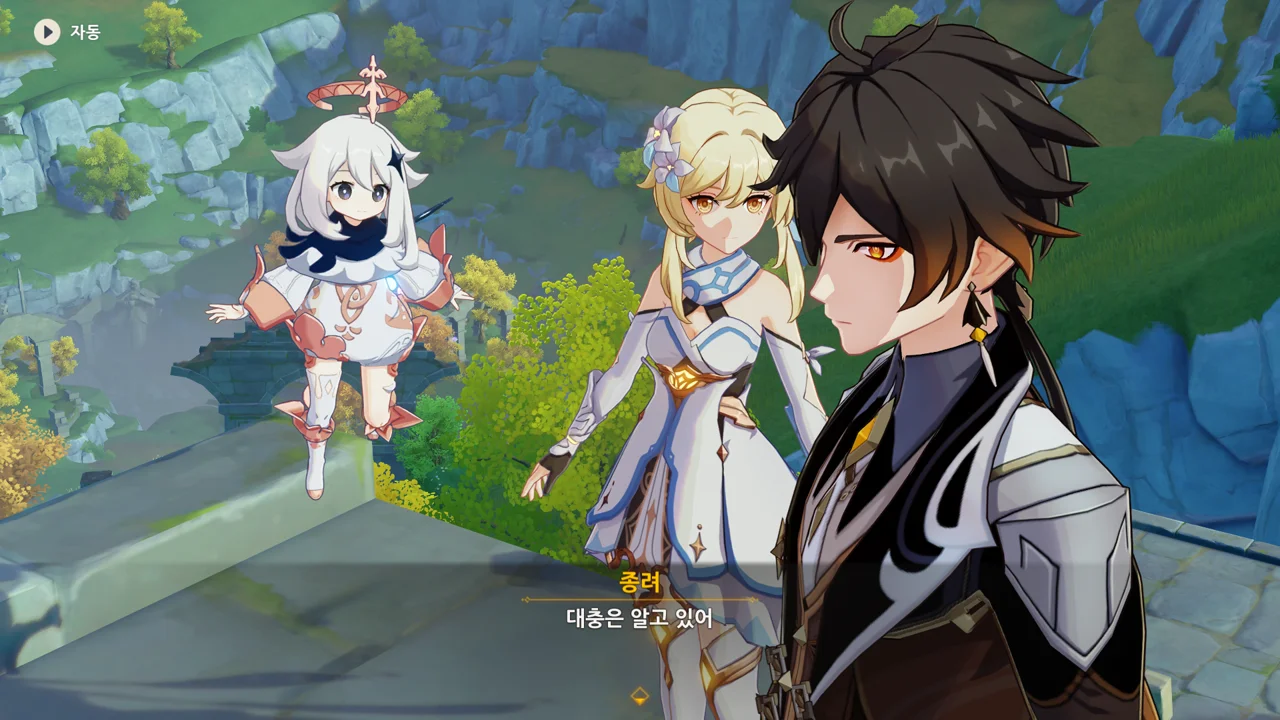 종려와 여행자는 무덤덤하게 서 있는 데에 반해, 페이몬 혼자 화들짝 놀란 모습이 너무 귀엽다.