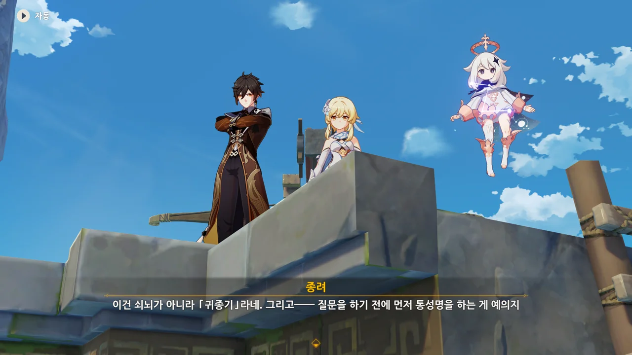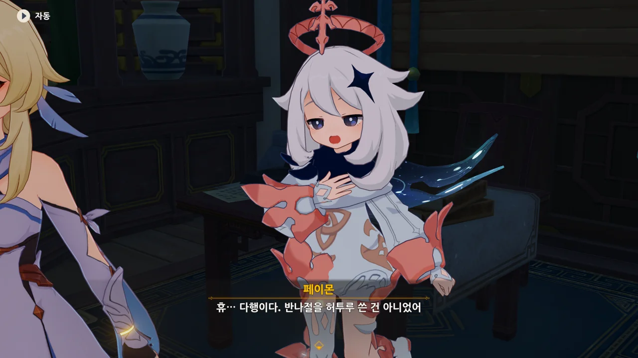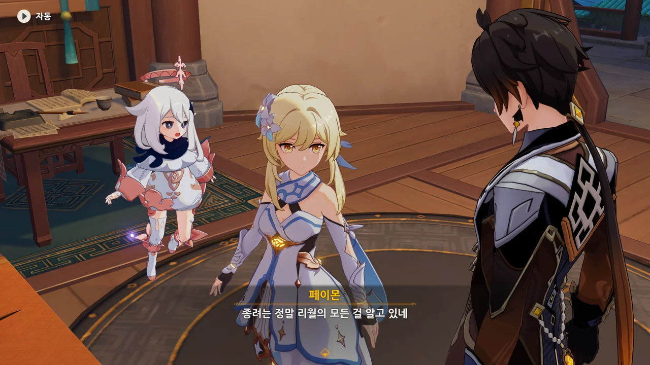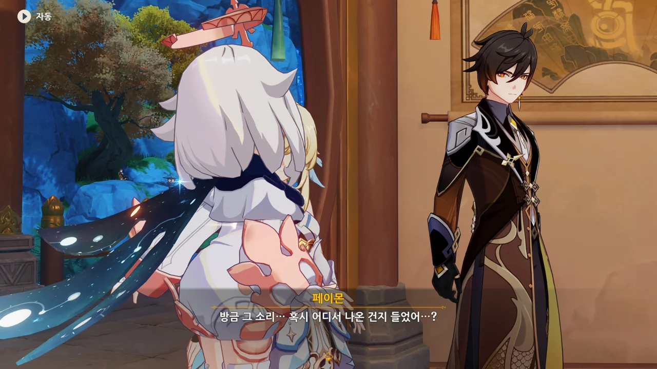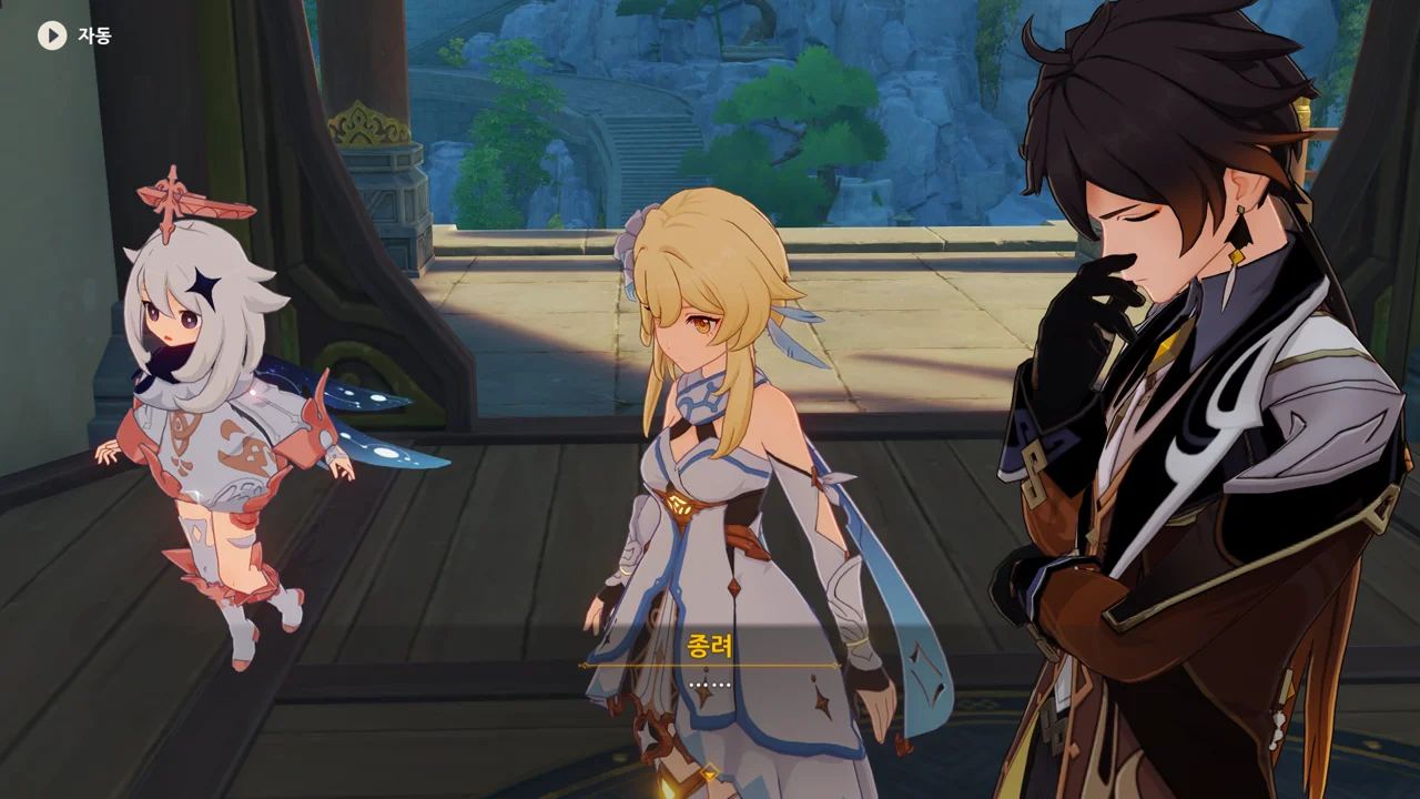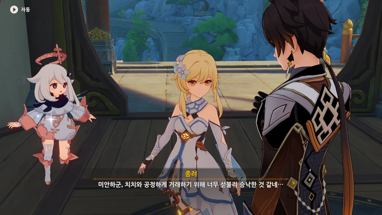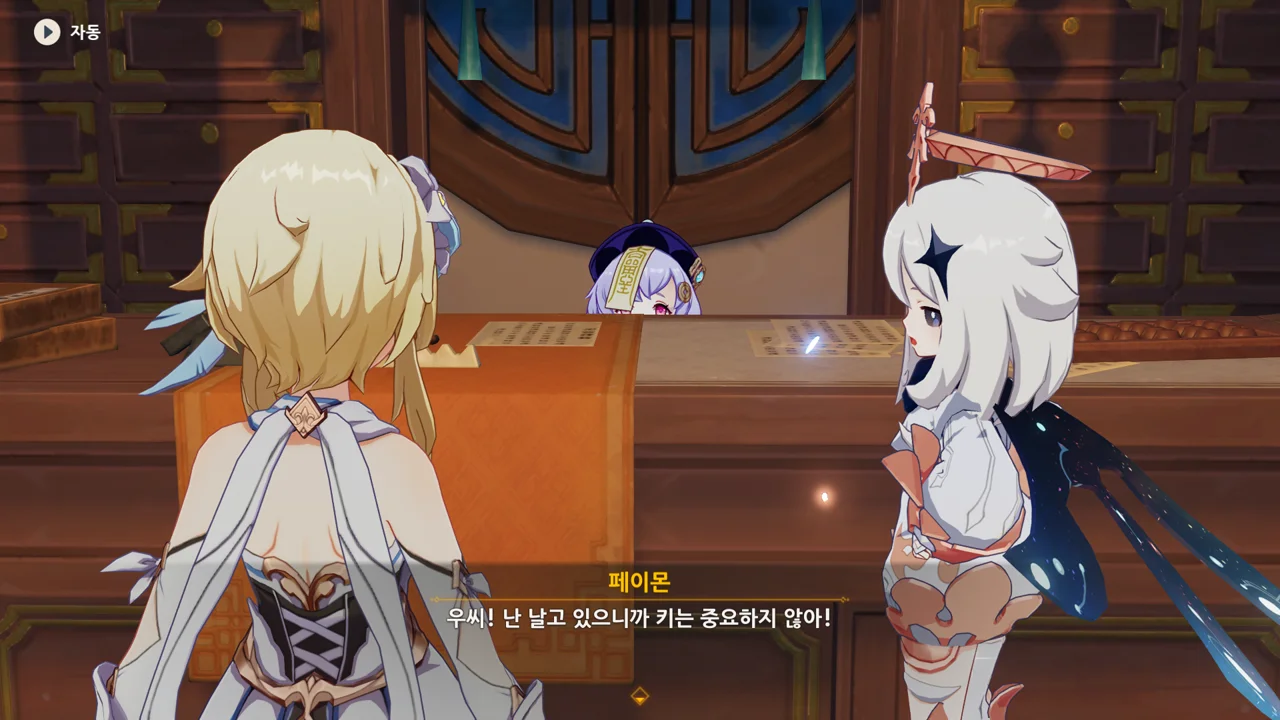 종려와 여행자는 무덤덤하게 서 있는 데에 반해, 페이몬 혼자 화들짝 놀란 모습이 너무 귀엽다.