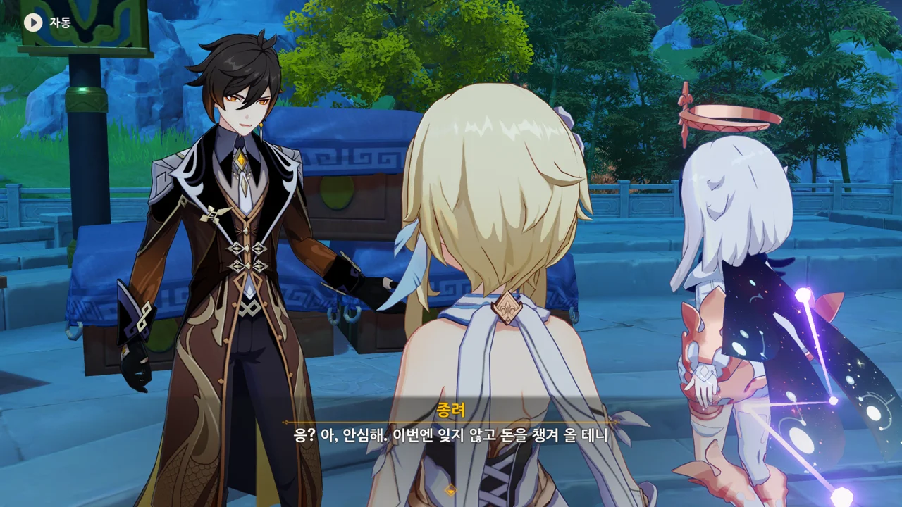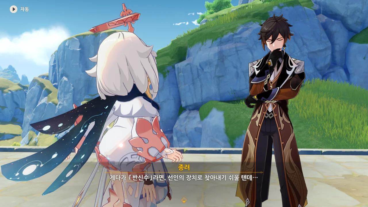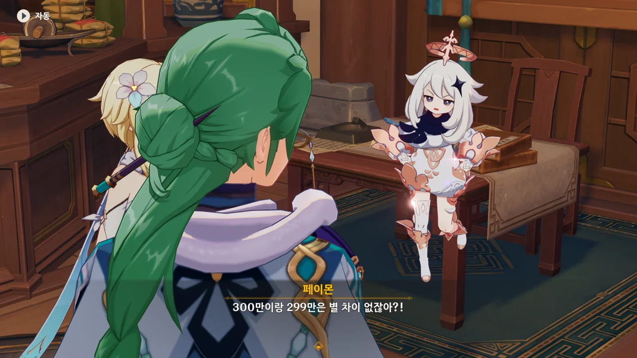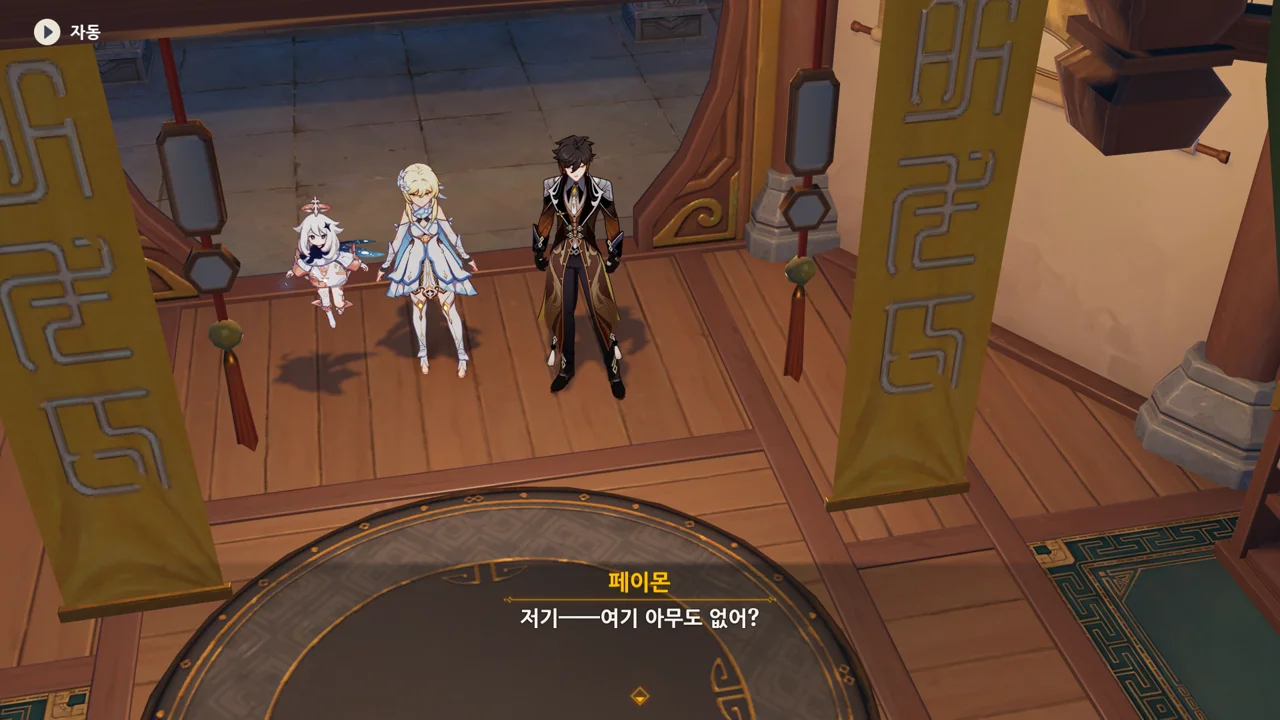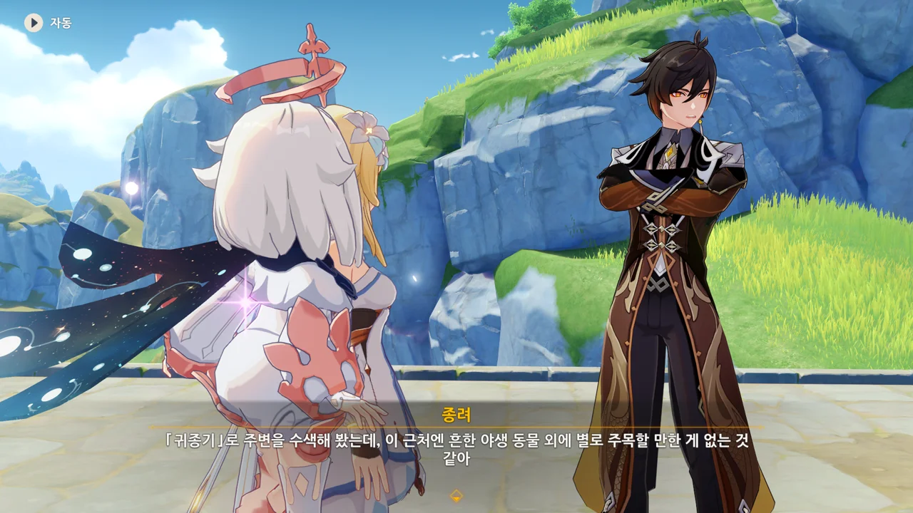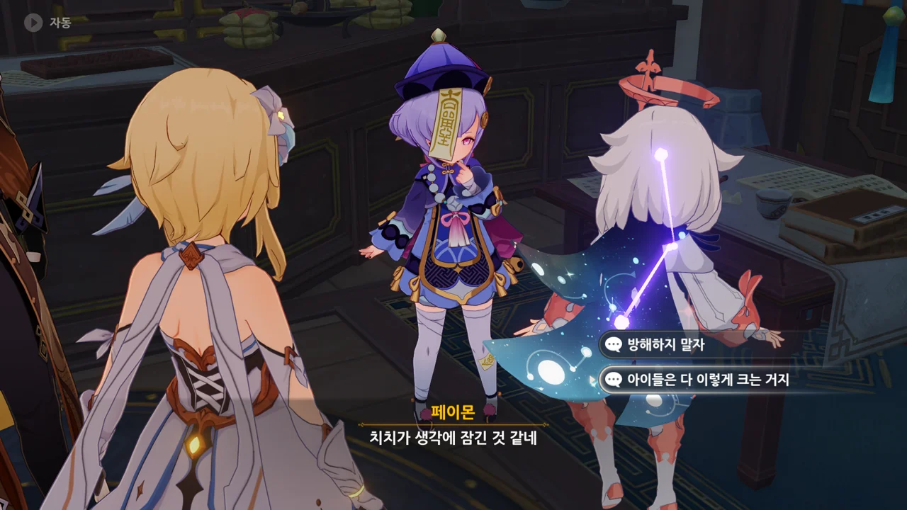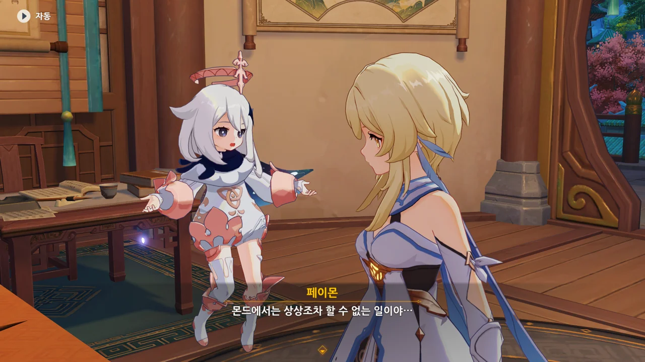 종려와 여행자는 무덤덤하게 서 있는 데에 반해, 페이몬 혼자 화들짝 놀란 모습이 너무 귀엽다.