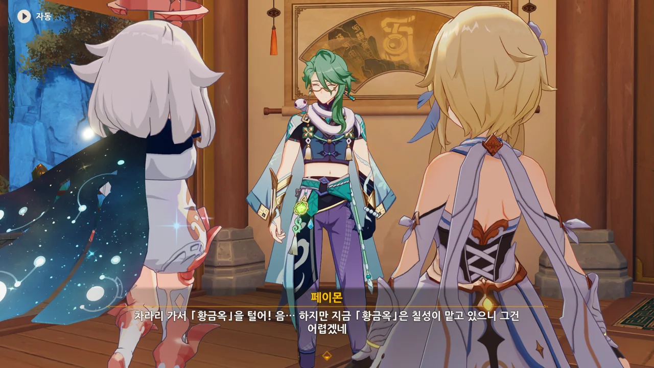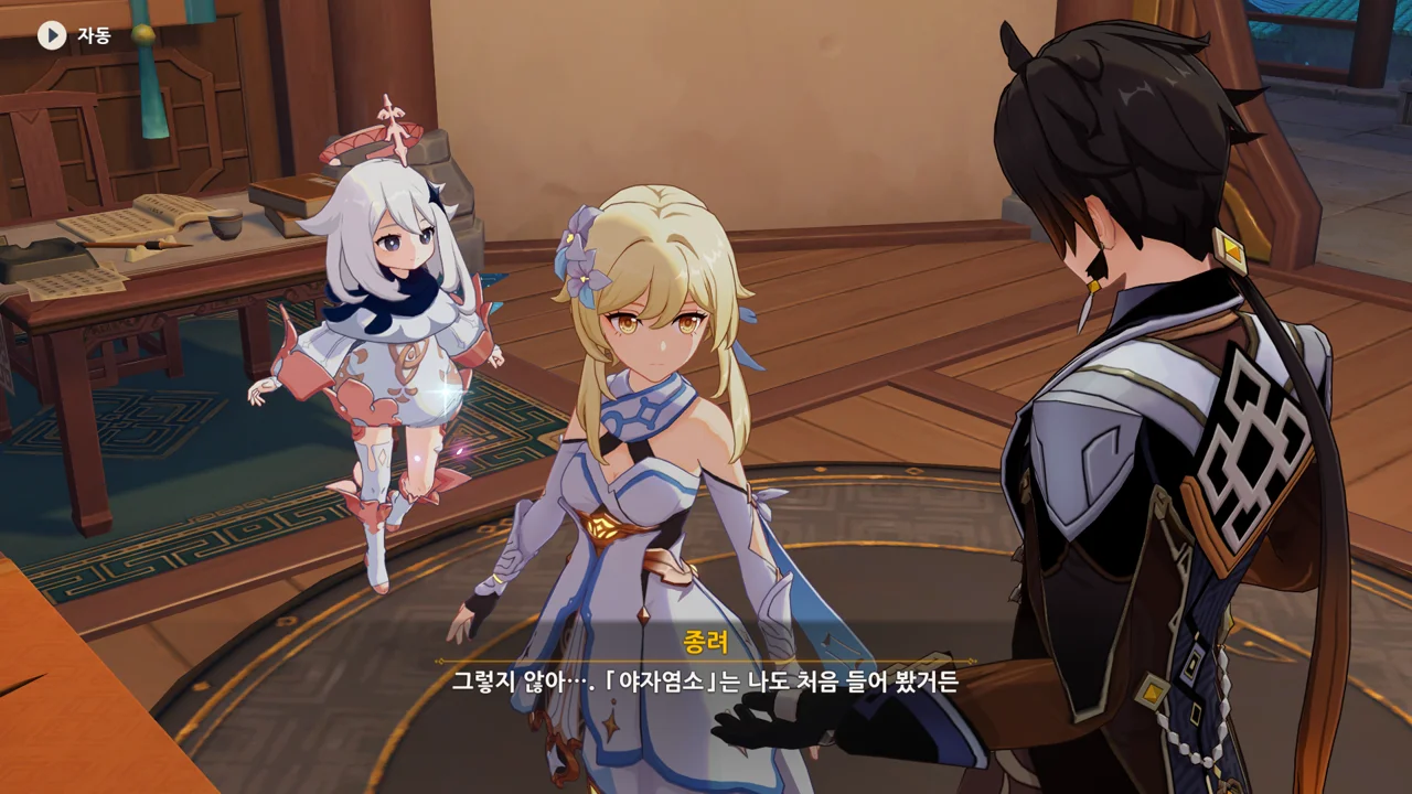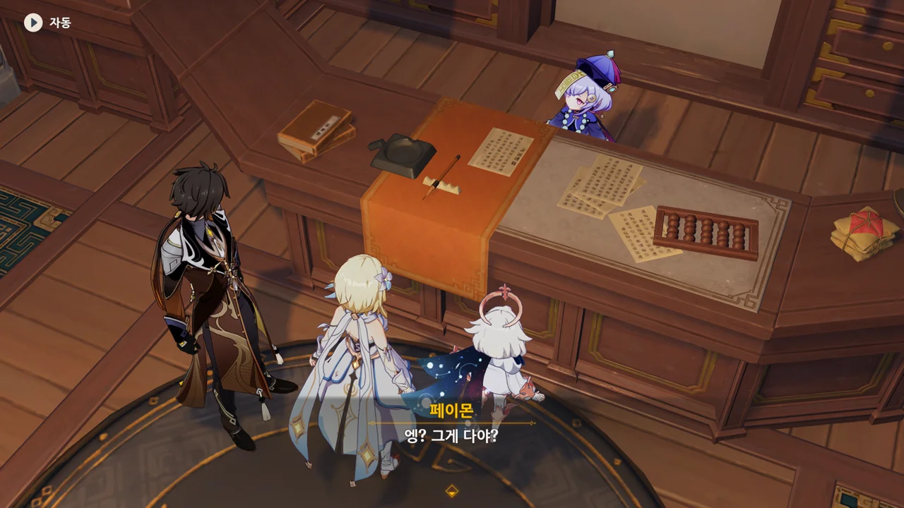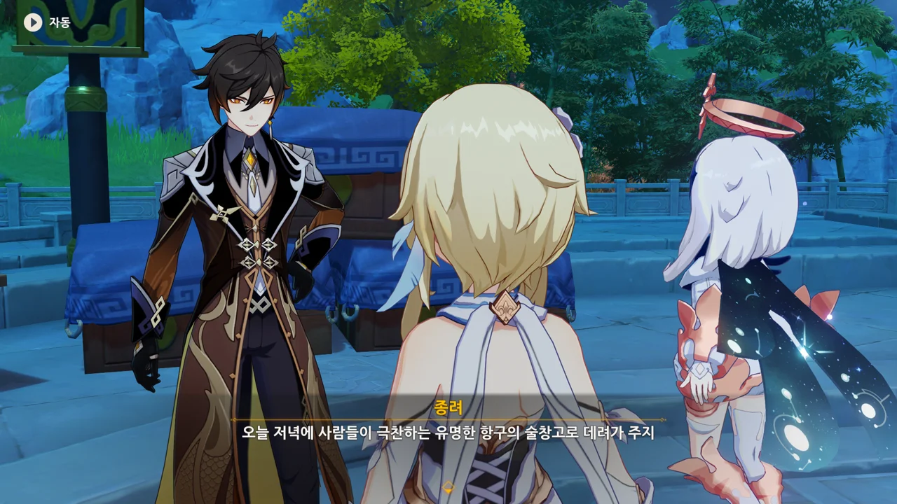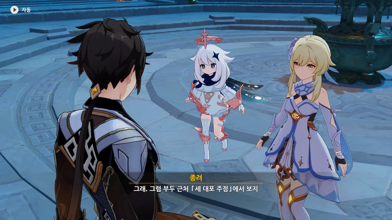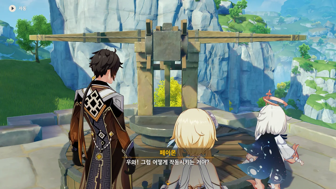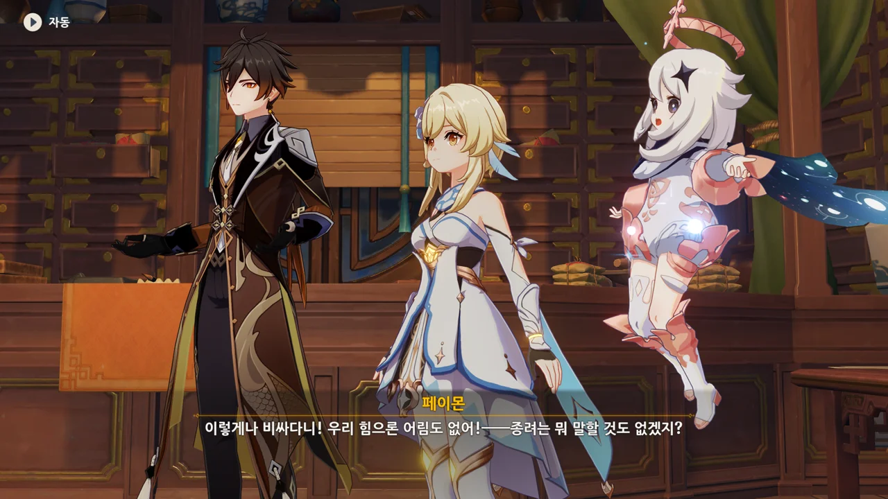종려와 여행자는 무덤덤하게 서 있는 데에 반해, 페이몬 혼자 화들짝 놀란 모습이 너무 귀엽다.