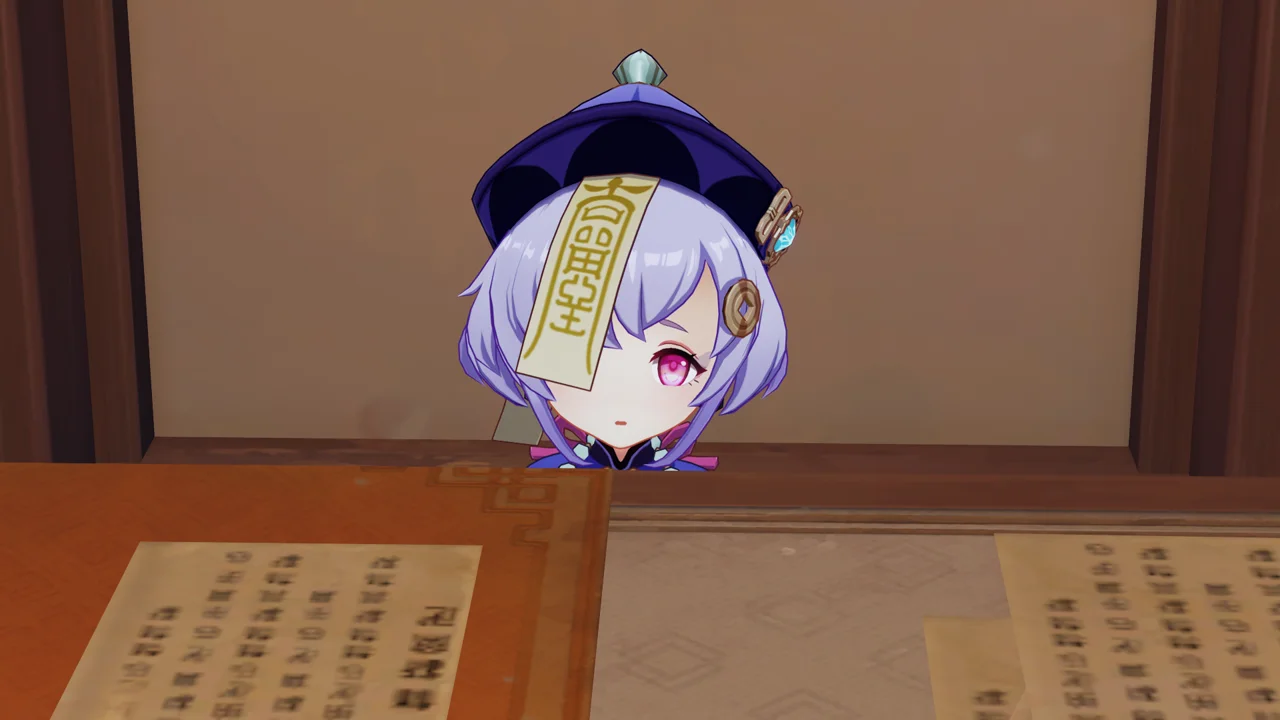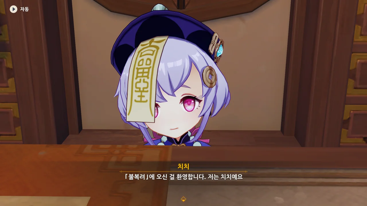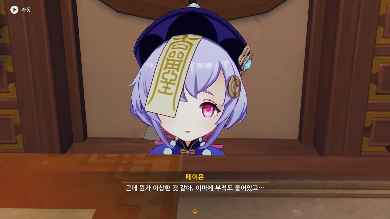 치치의 이마에 부적이 붙어있는 걸 보고 강시냐고 묻는 페이몬.