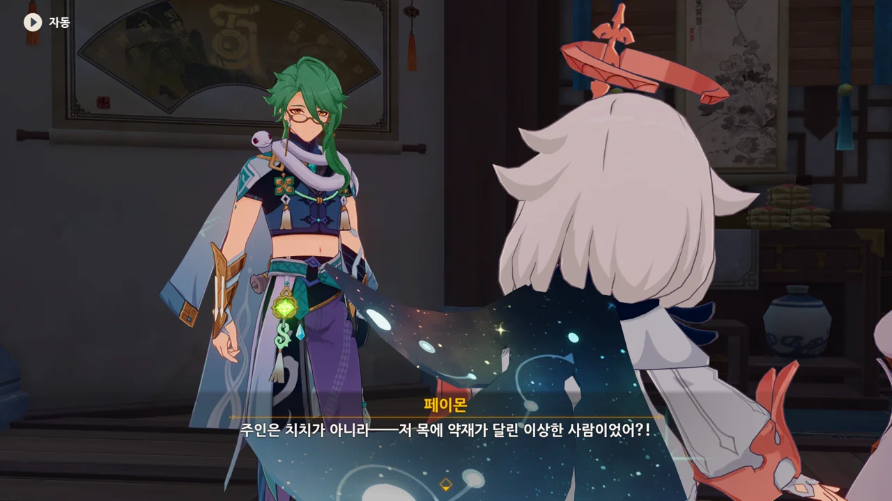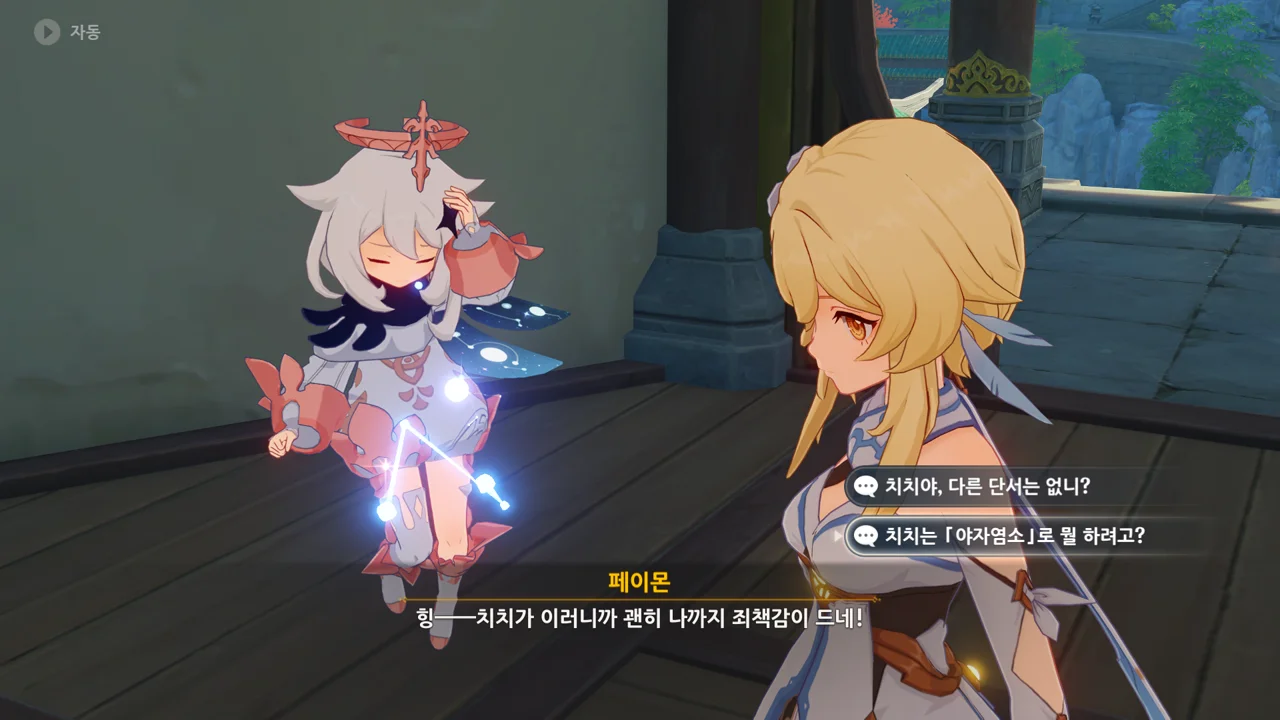 그리고 '목에 달린 약재'라는 말에 발끈한 장생이 페이몬을 "치치보다 더 순진한 사람"이라고 까댄다.