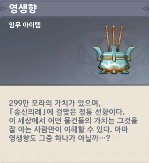 에이, 그럼 그렇지. 무슨 향 하나가 300만 모라나 해? 아무리 최상급이라고 해도 그렇지…