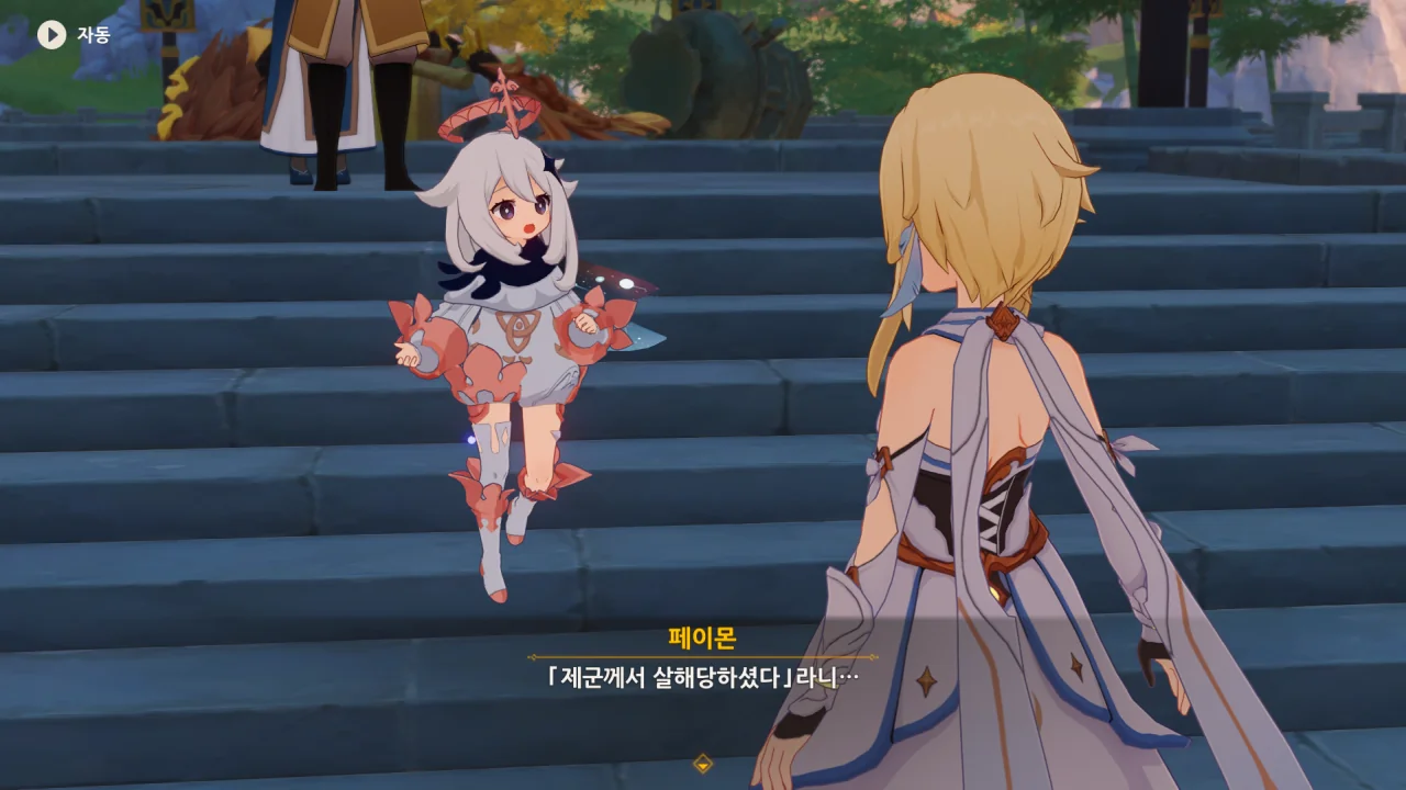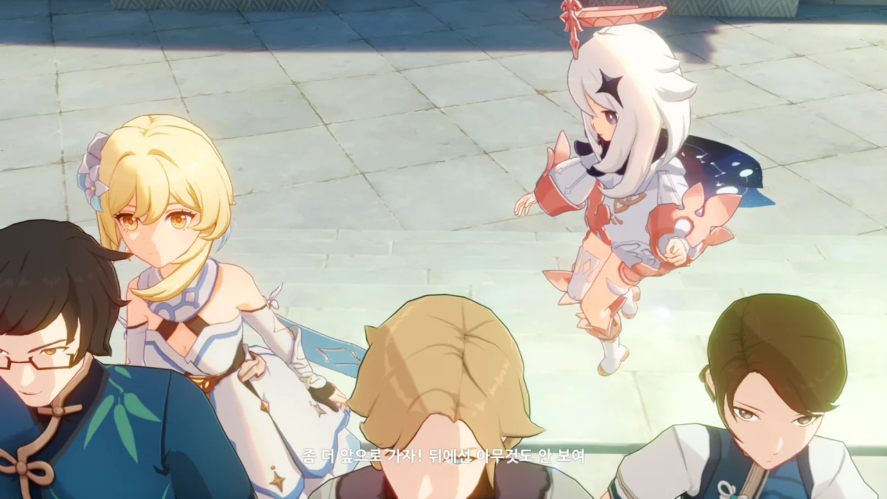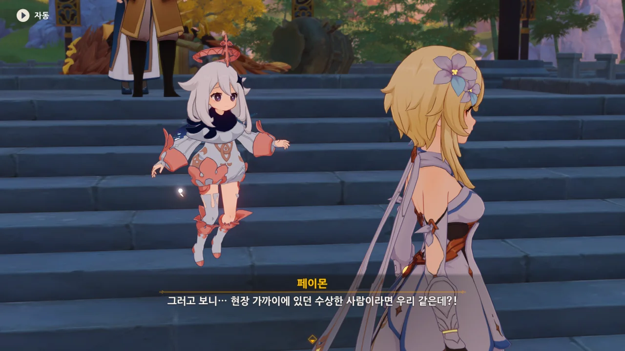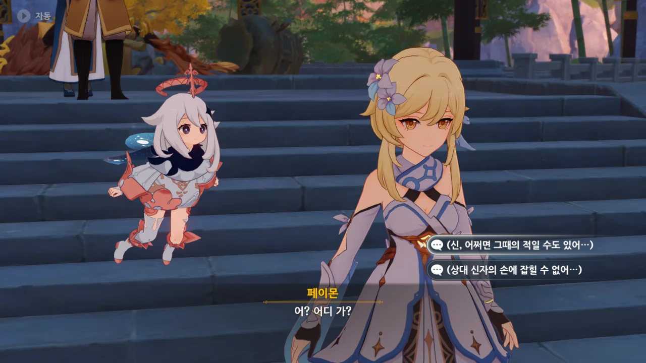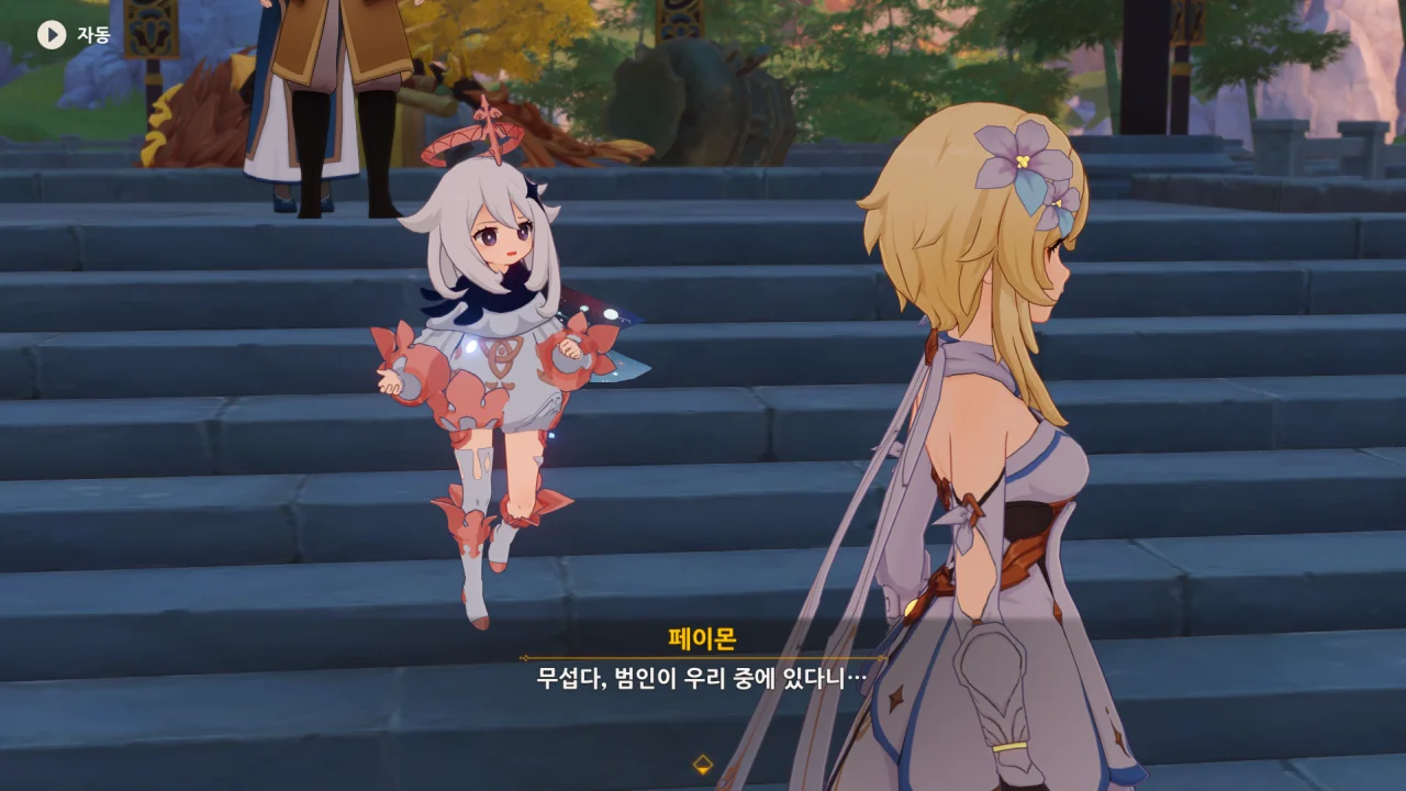 뒤에선 아무것도 보이지 않아, 앞으로 좀 더 다가서는 여행자와 페이몬.