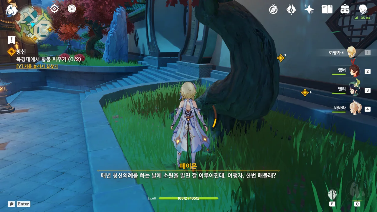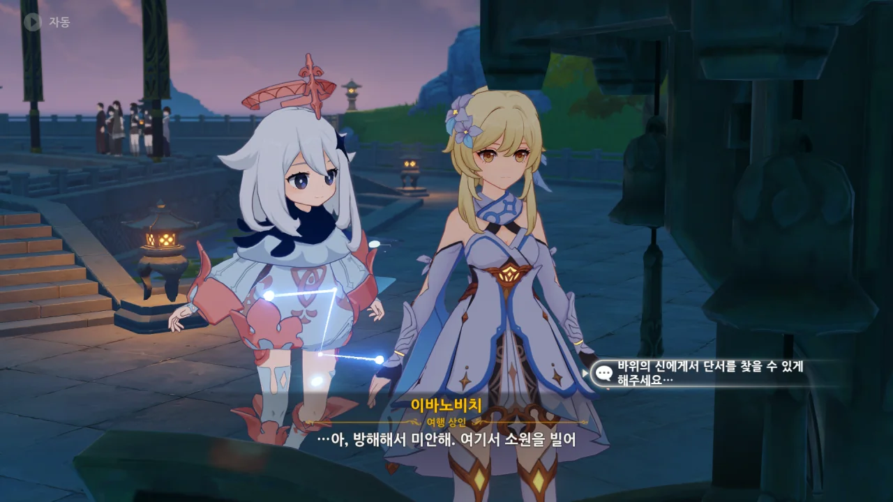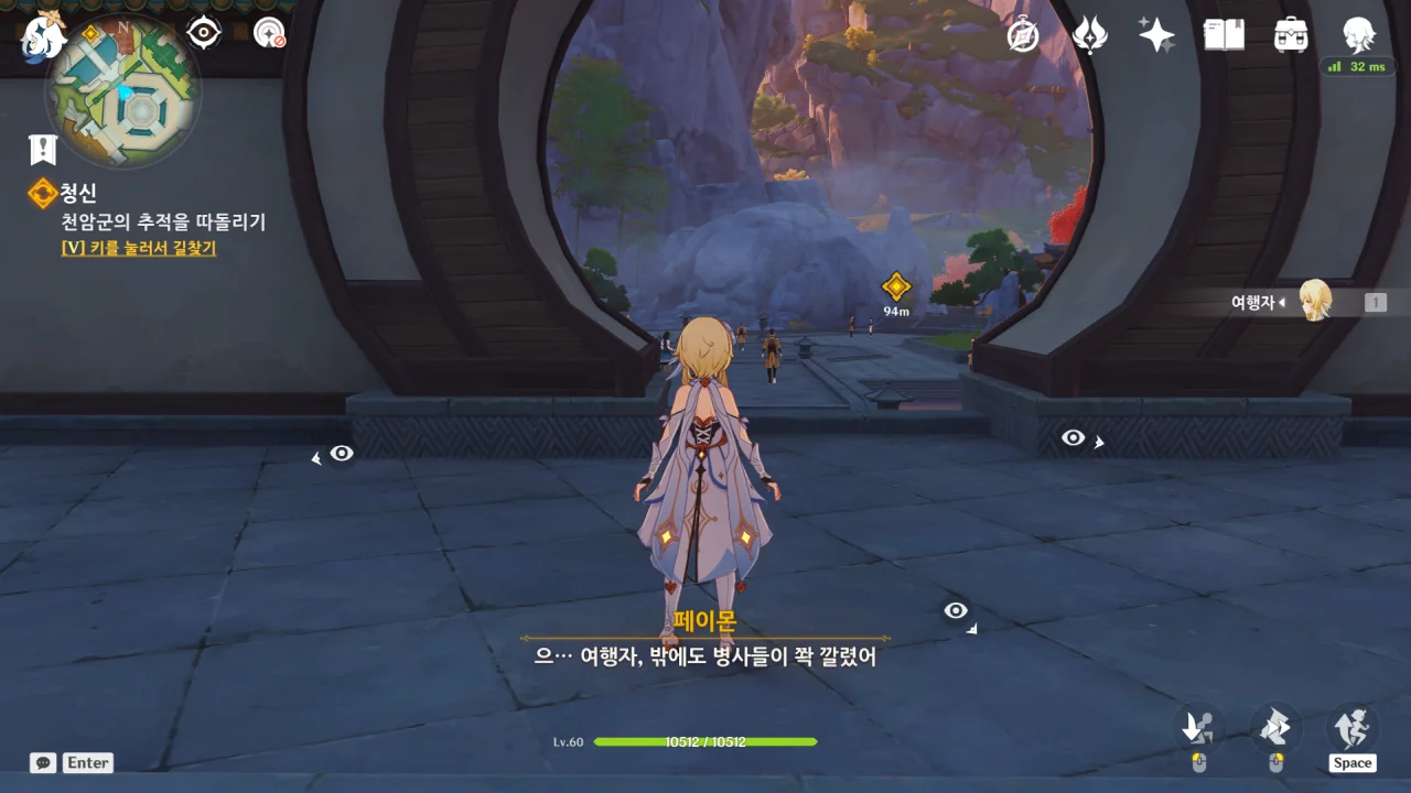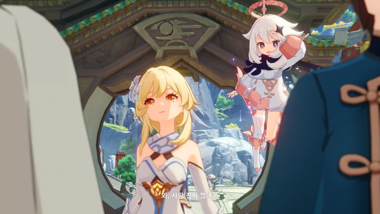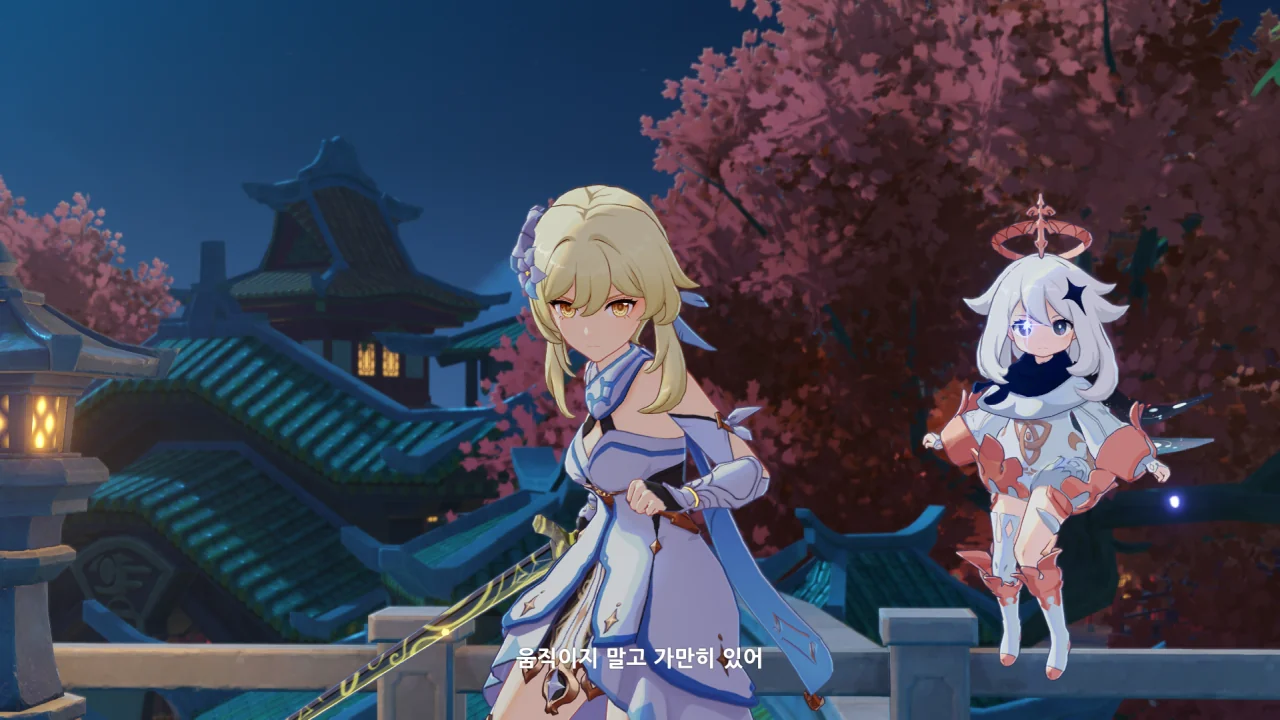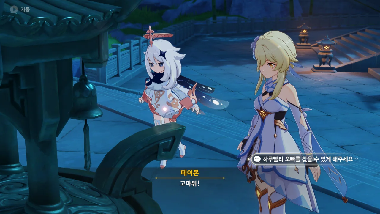 뒤에선 아무것도 보이지 않아, 앞으로 좀 더 다가서는 여행자와 페이몬.