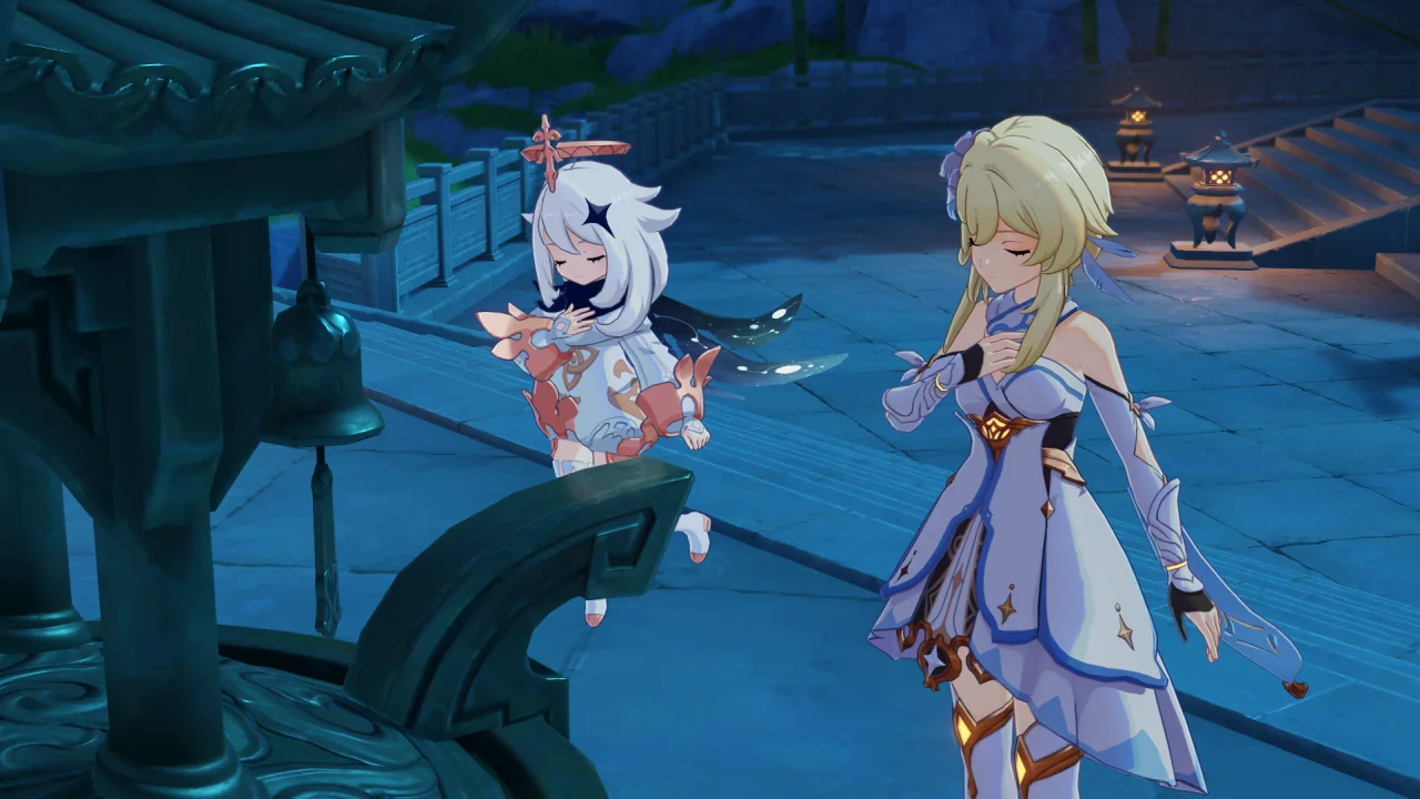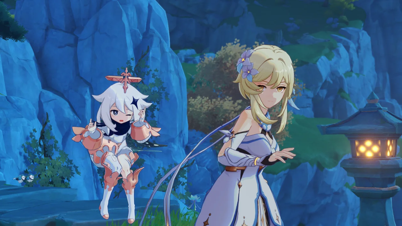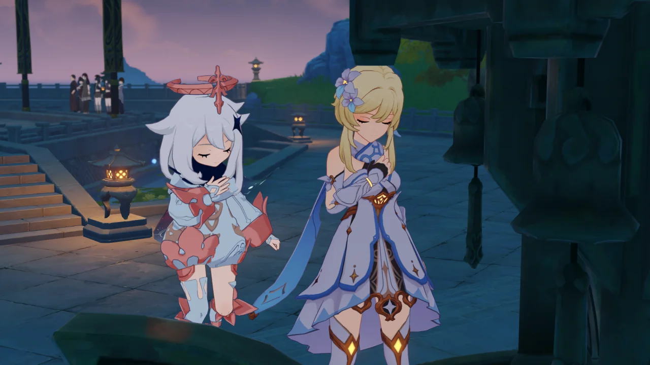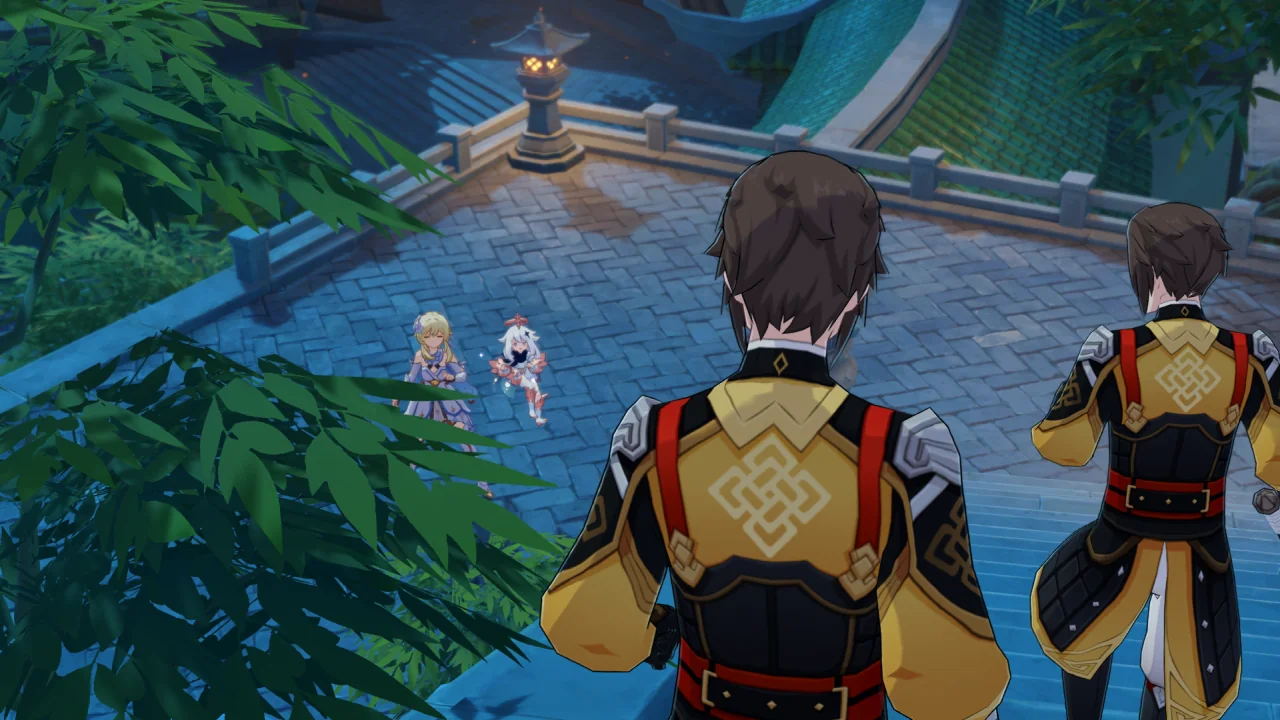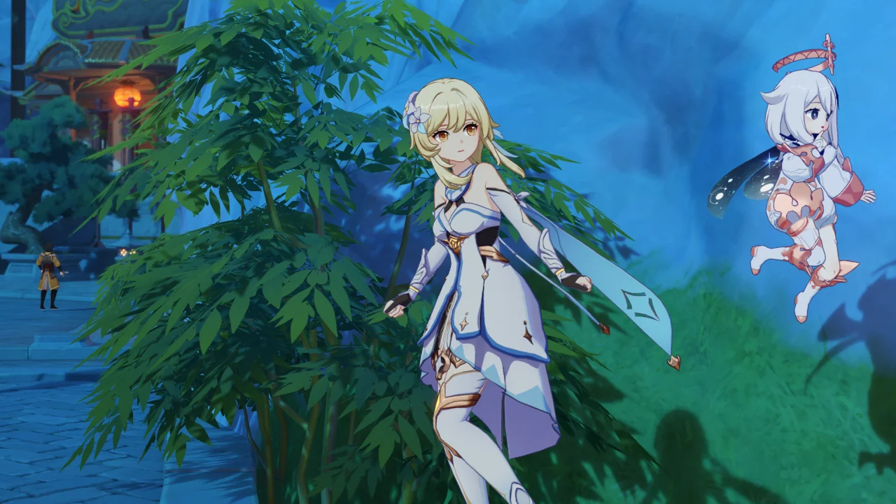 뒤에선 아무것도 보이지 않아, 앞으로 좀 더 다가서는 여행자와 페이몬.