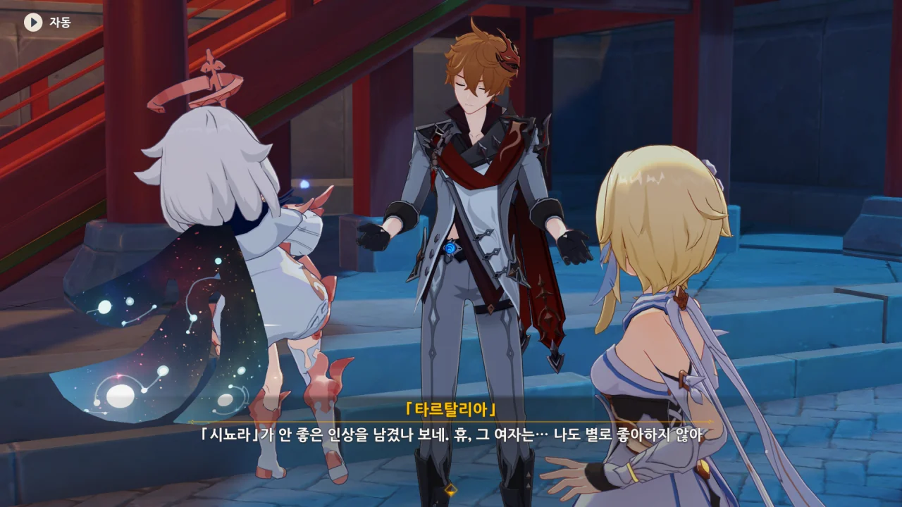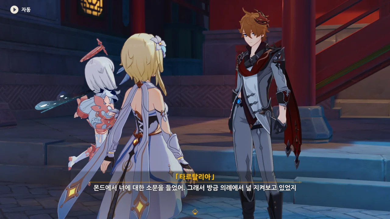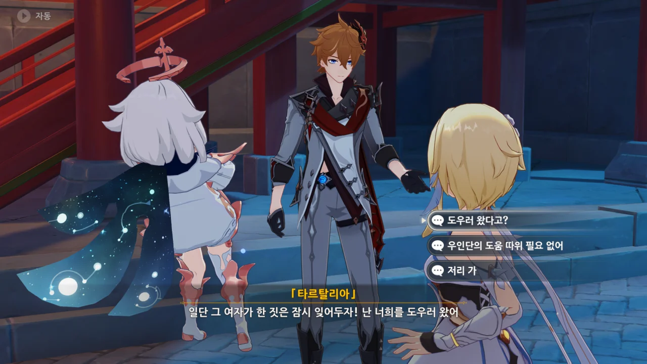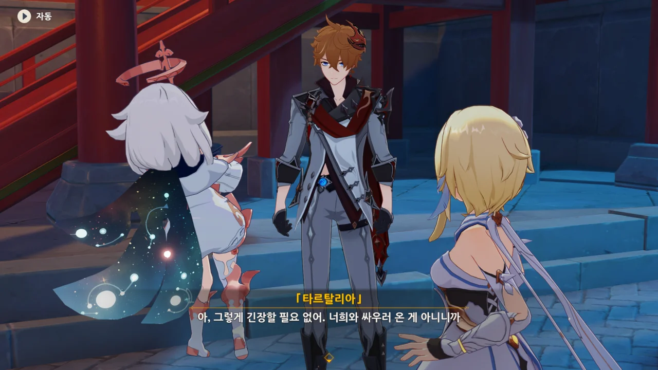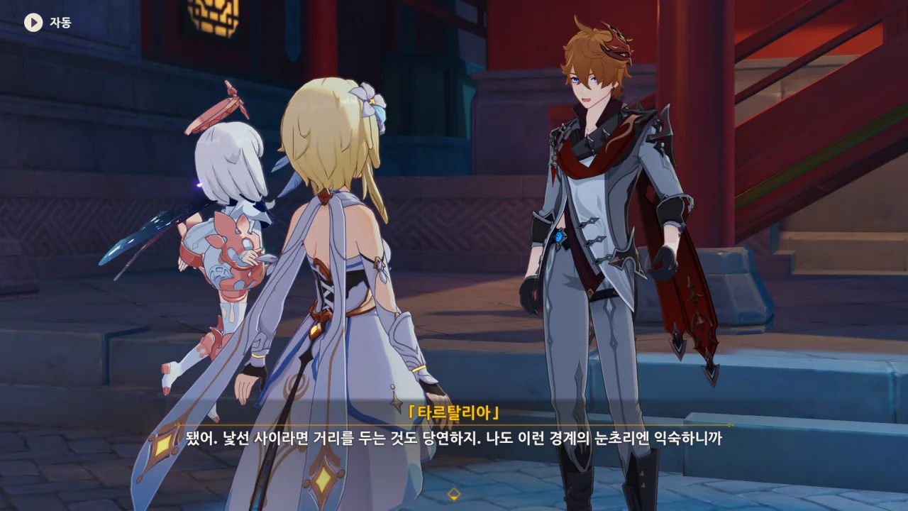 타르탈리아가 시뇨라처럼 우인단이라는 걸 알게 되자, 곧바로 경계 태세를 취하는 여행자.