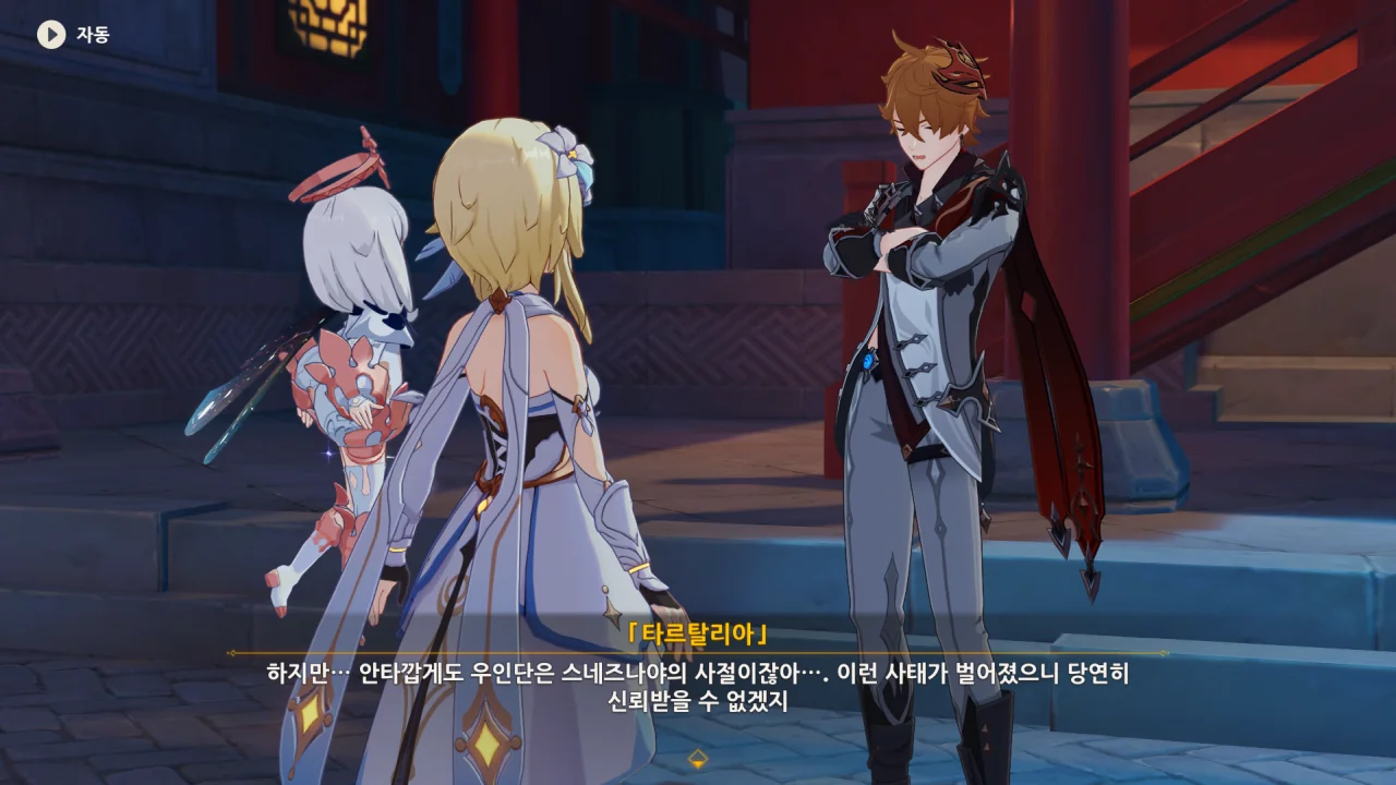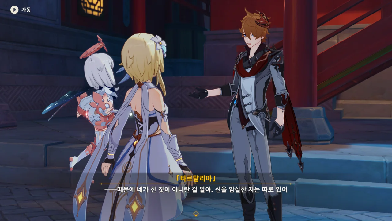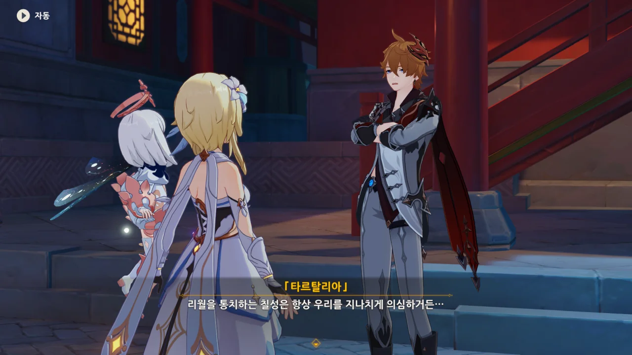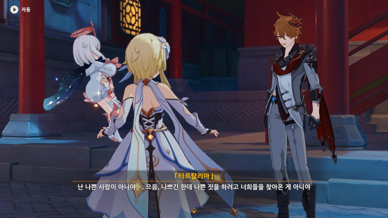타르탈리아가 시뇨라처럼 우인단이라는 걸 알게 되자, 곧바로 경계 태세를 취하는 여행자.