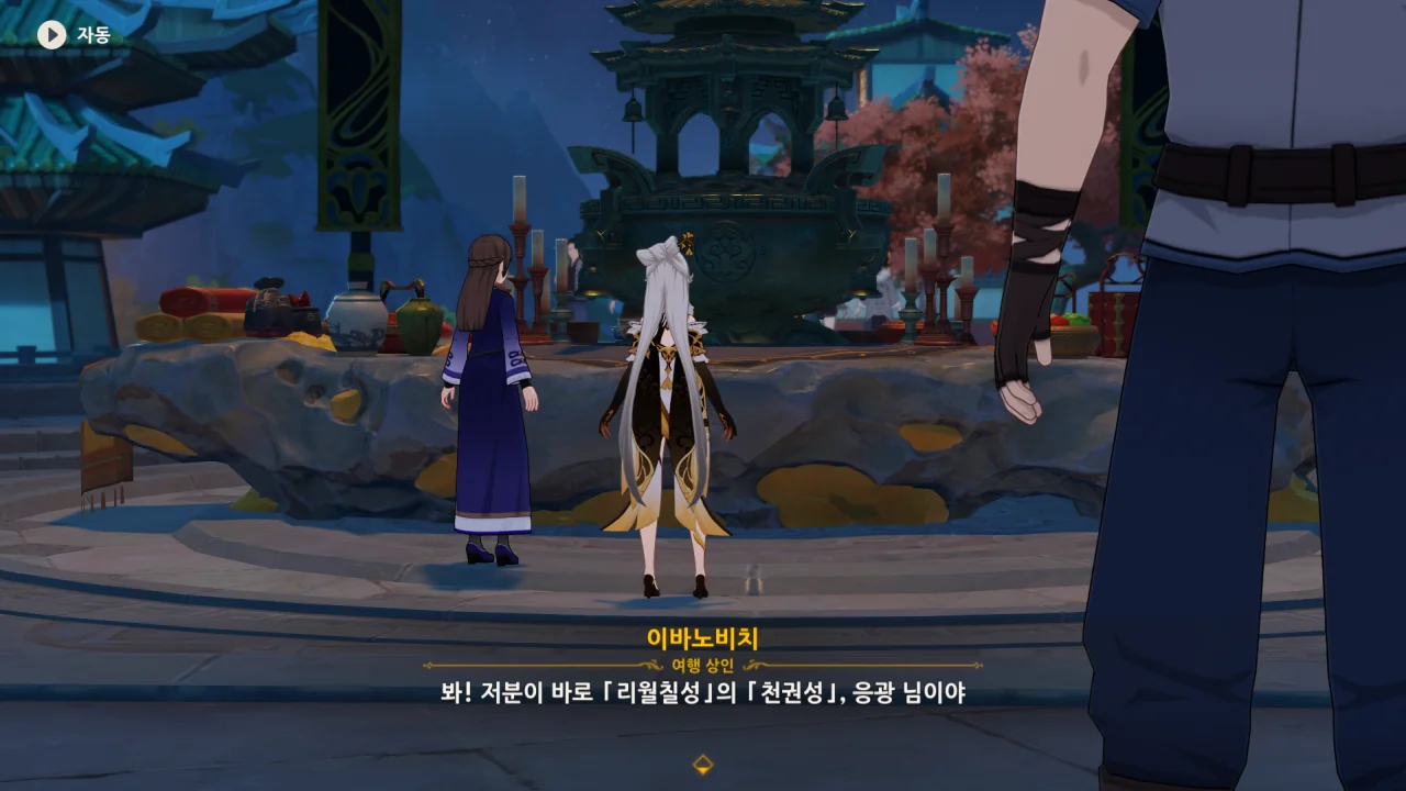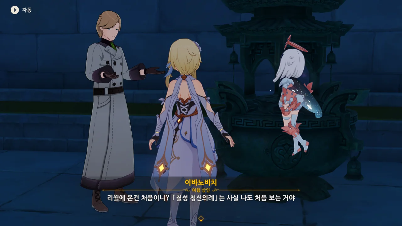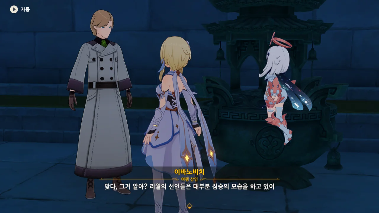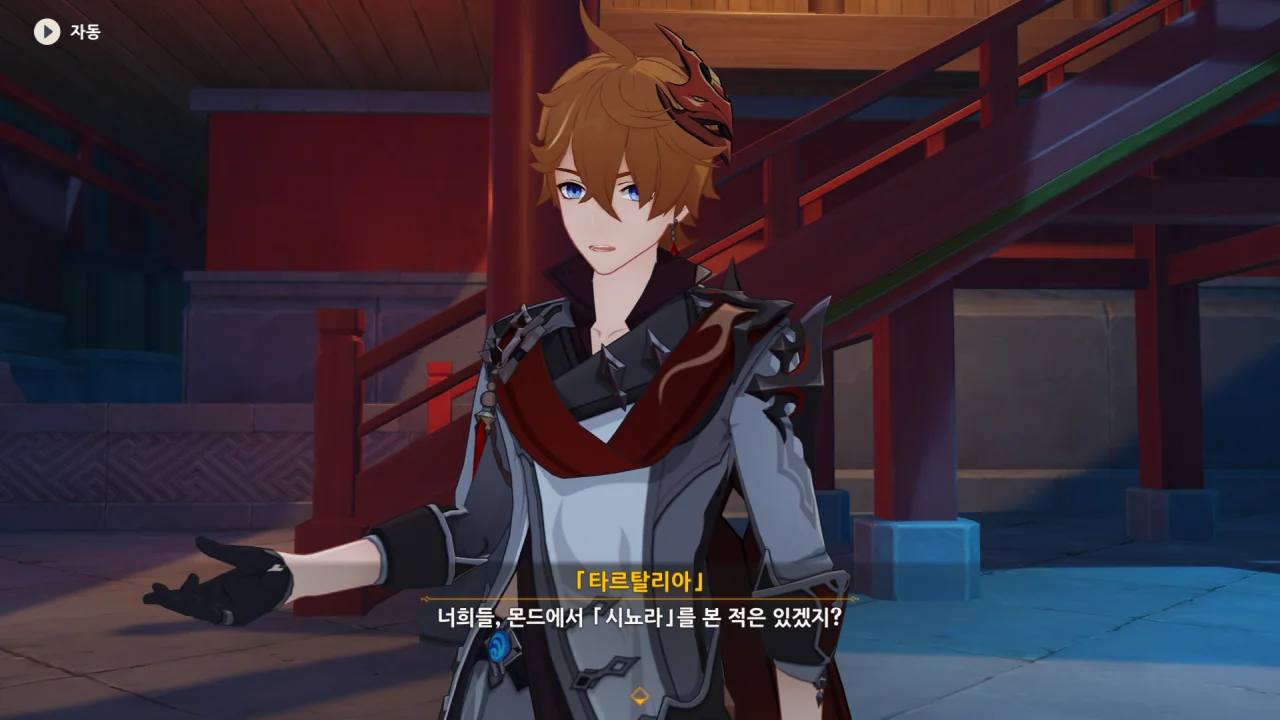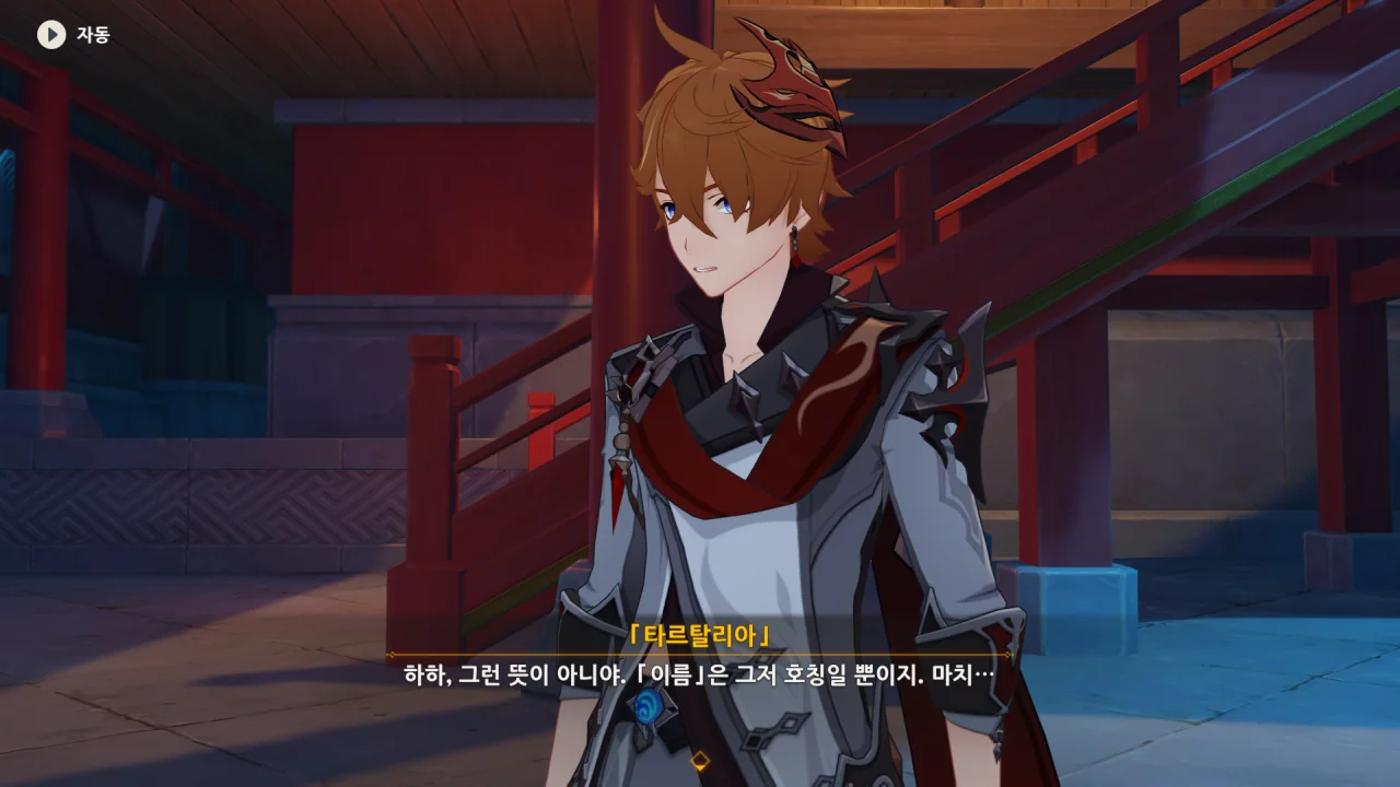 타르탈리아가 시뇨라처럼 우인단이라는 걸 알게 되자, 곧바로 경계 태세를 취하는 여행자.