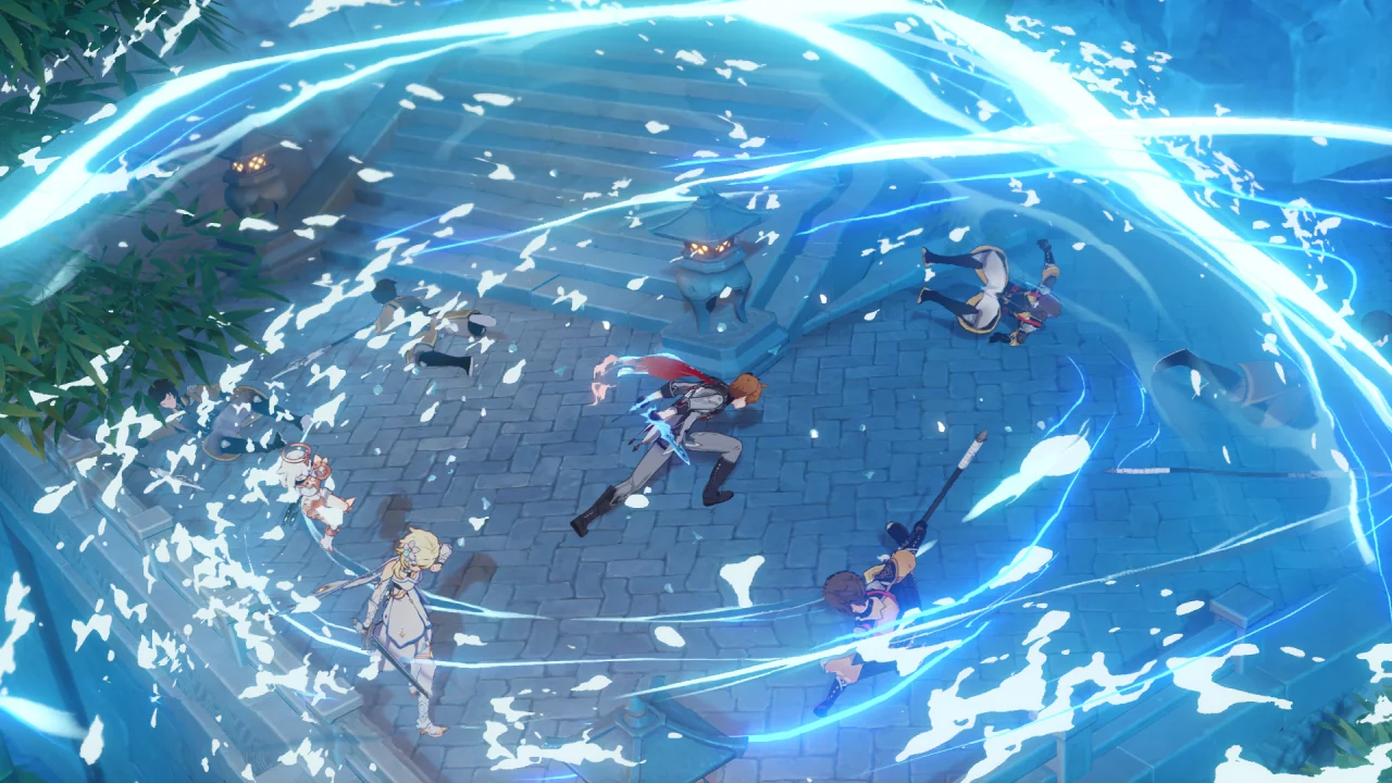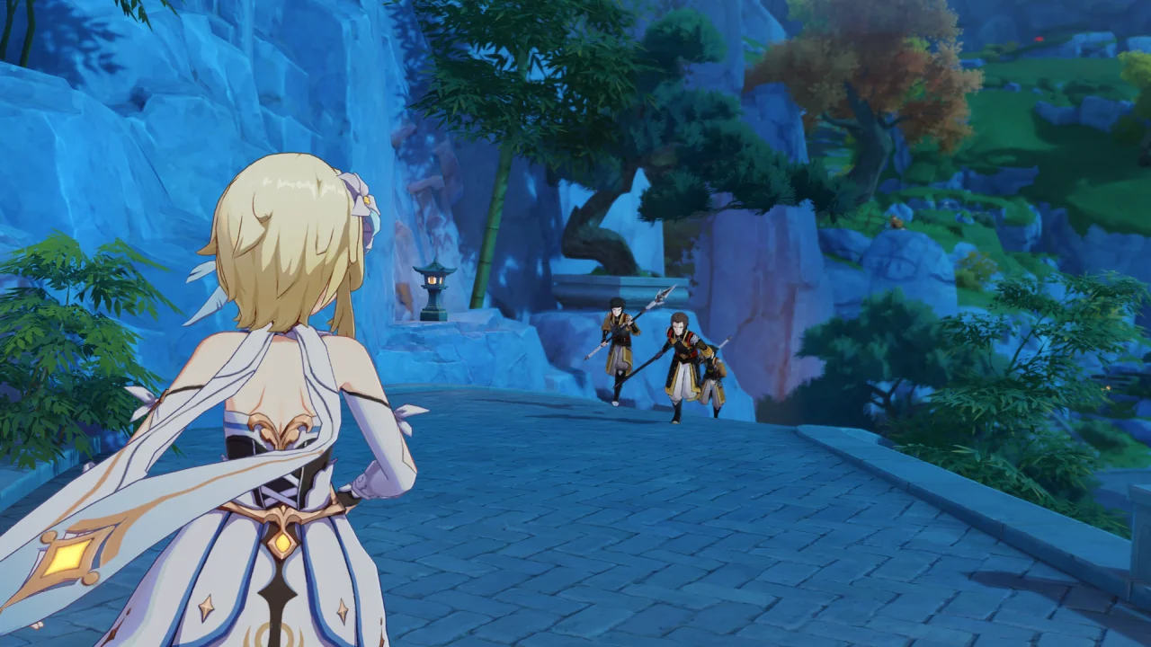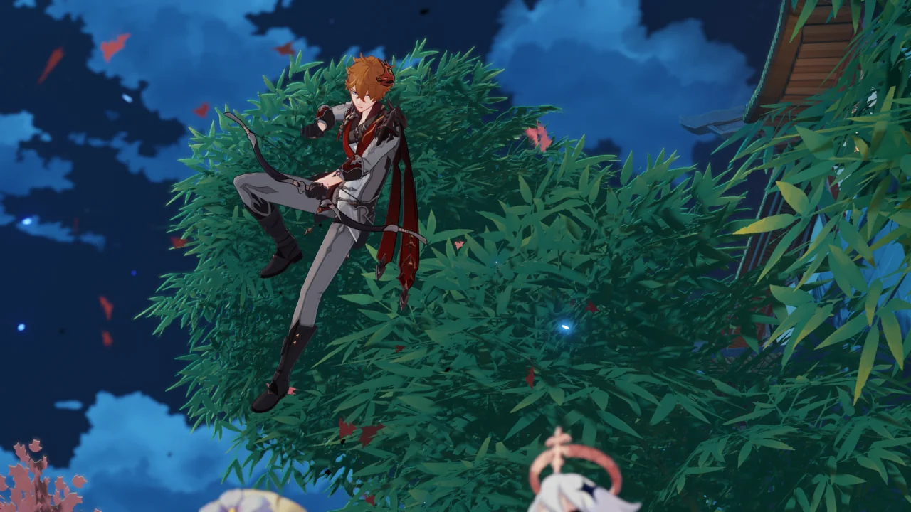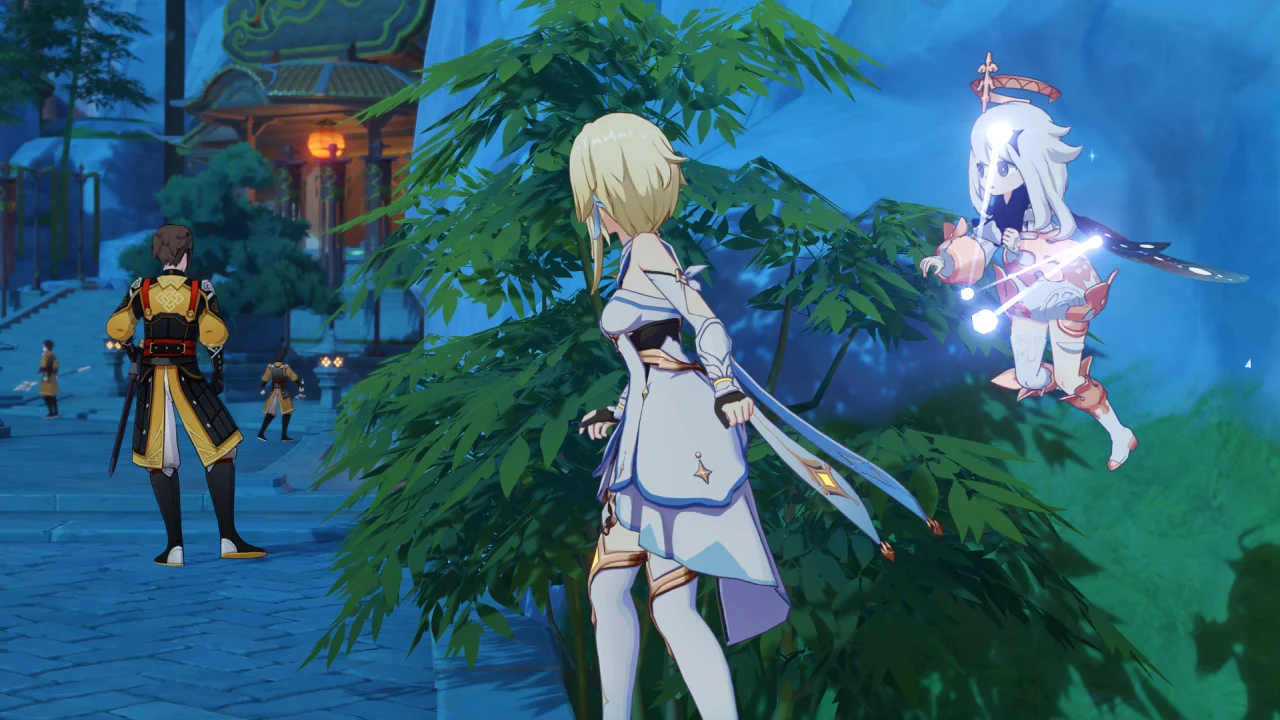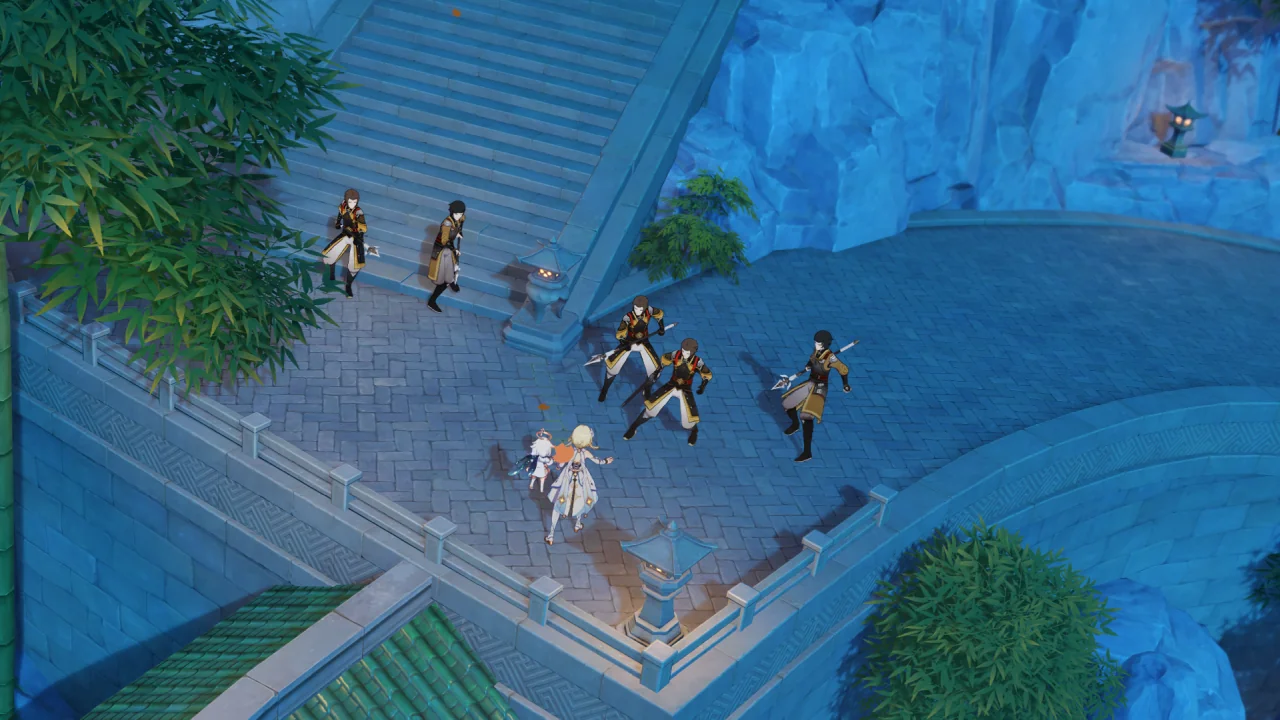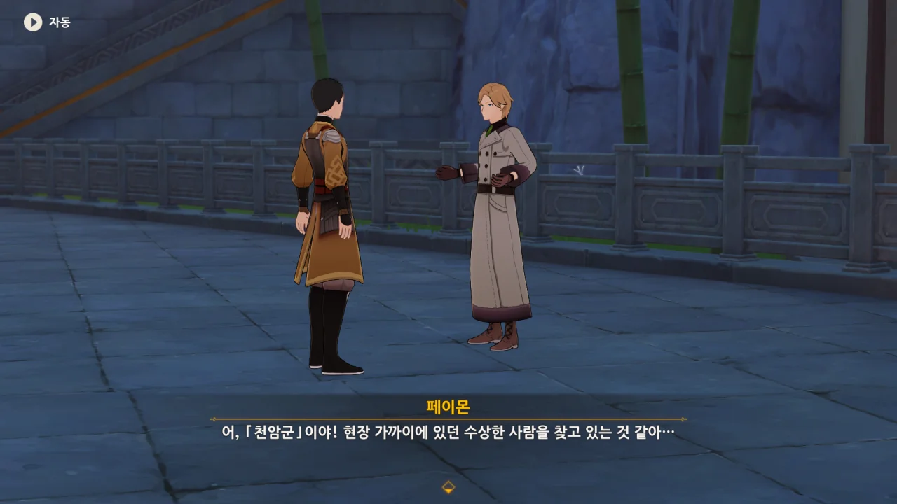 갑자기 타르탈리아가 나타나 여행자를 포위한 천암군의 손을 쏴 무기를 떨어트린다.