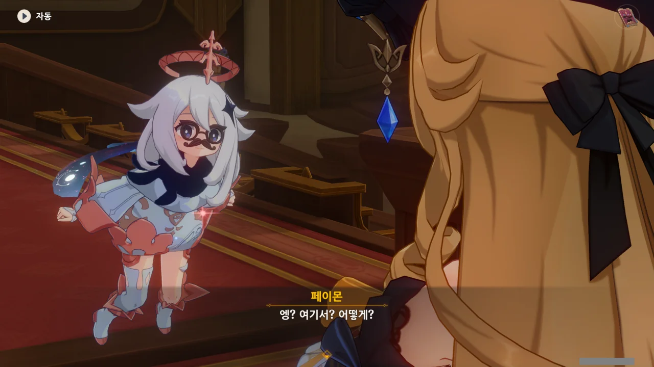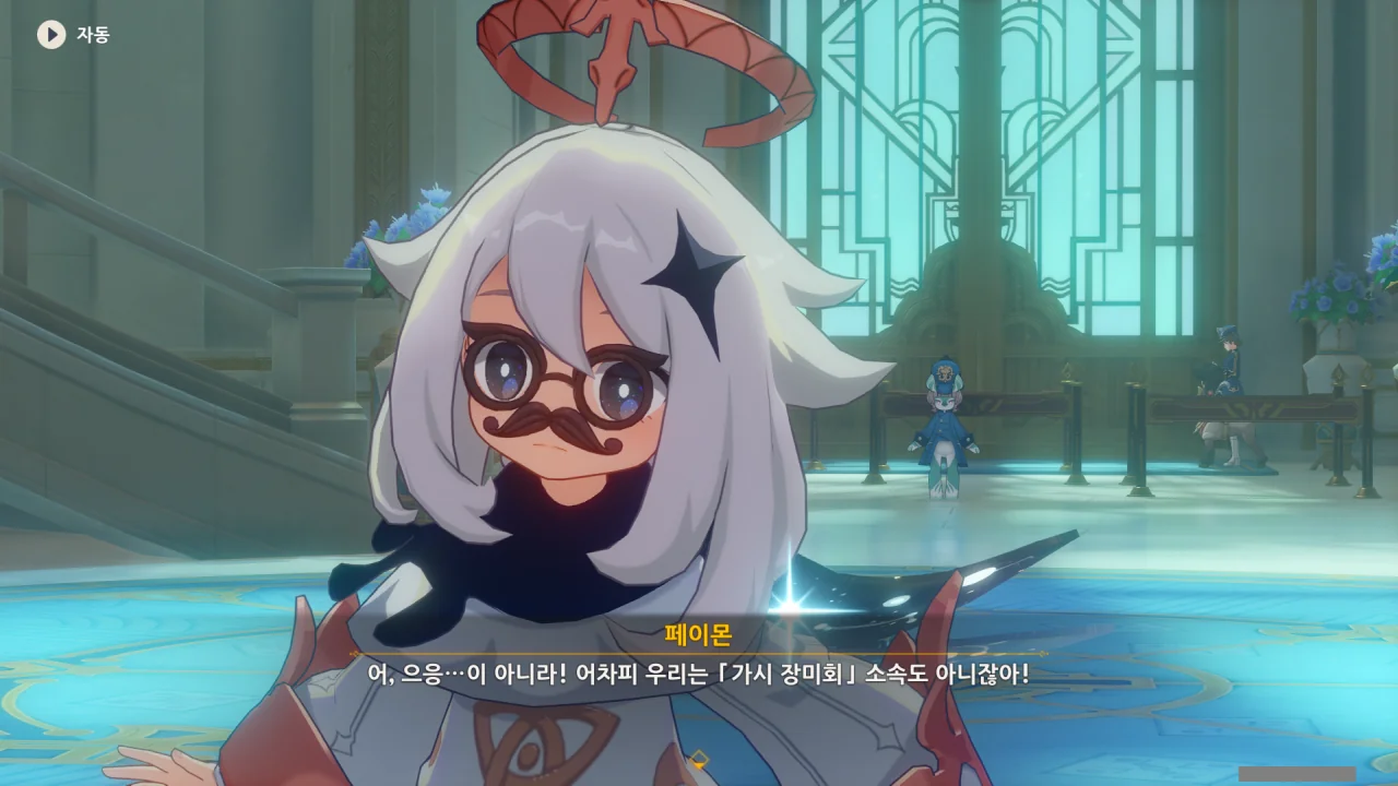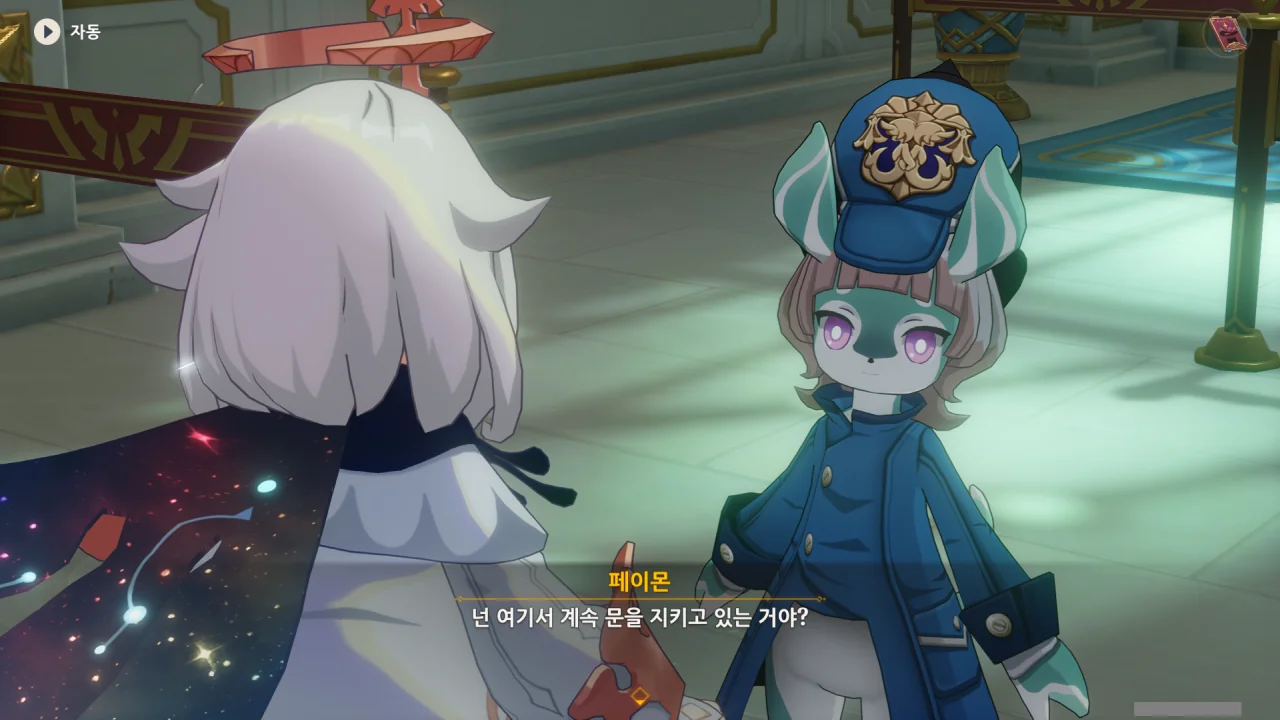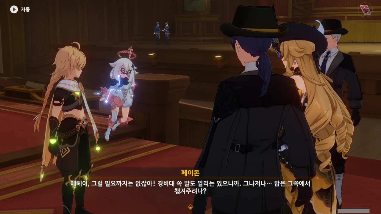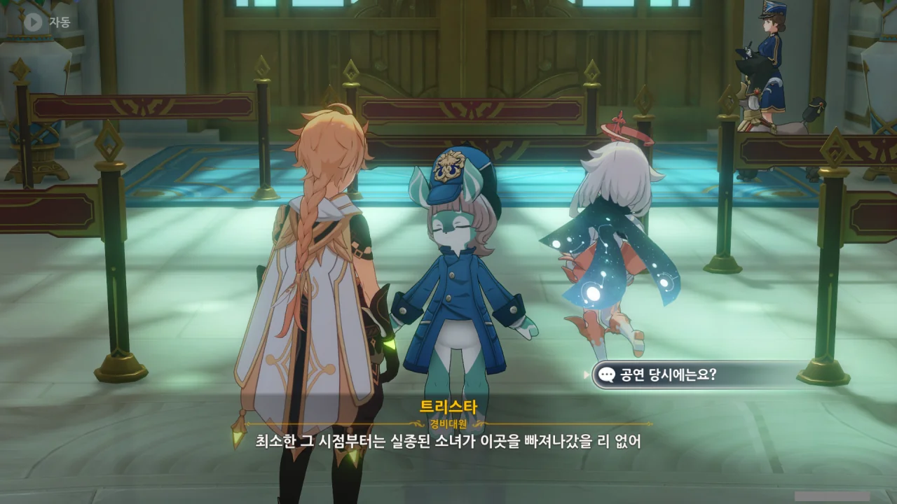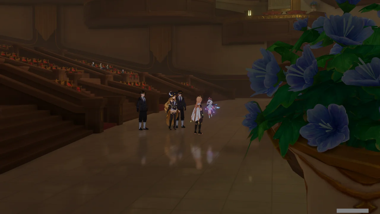 페이몬: 문을 지키는 자리에선 공연이 안 보이는구나… 나라면 못 참고 몰래 관객석으로 갔을 거야.