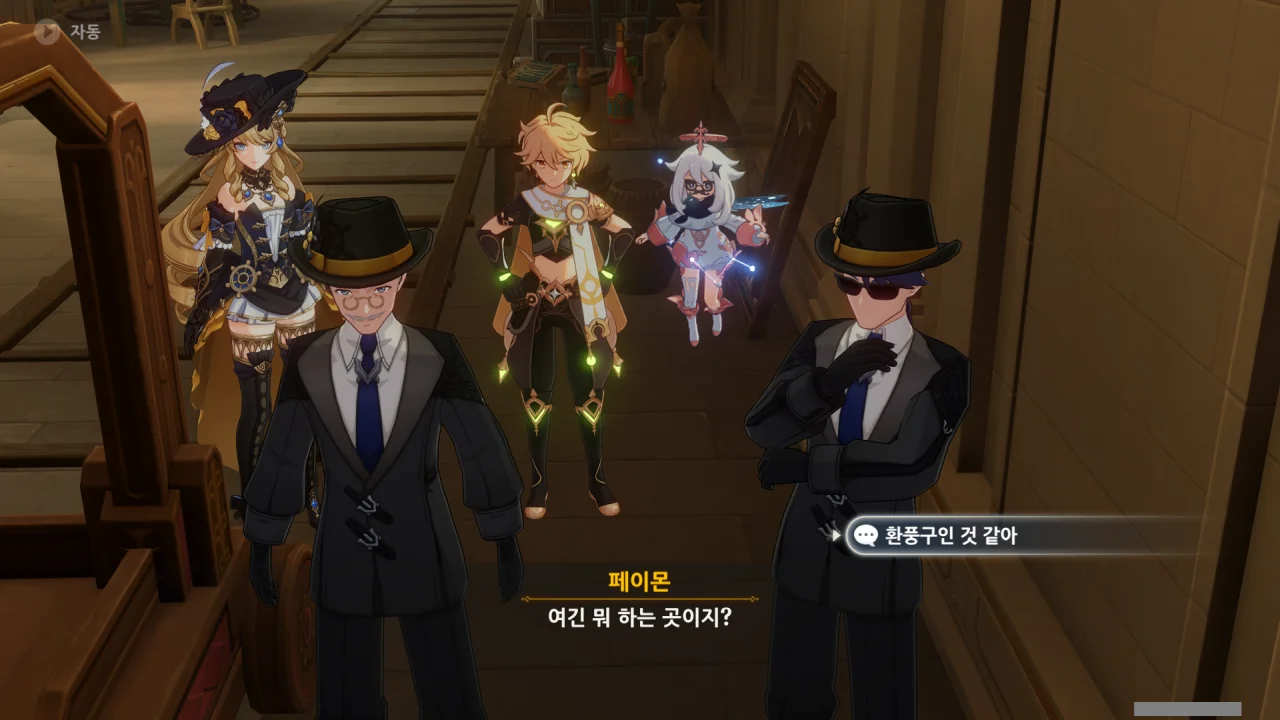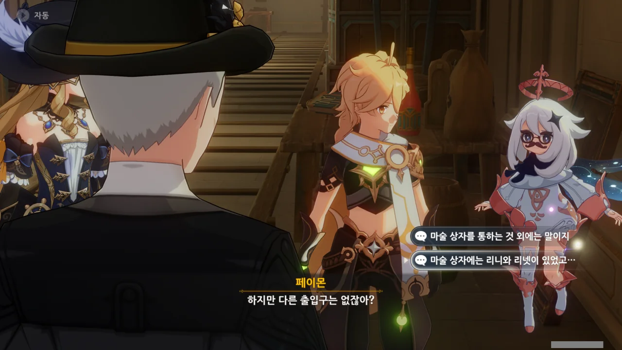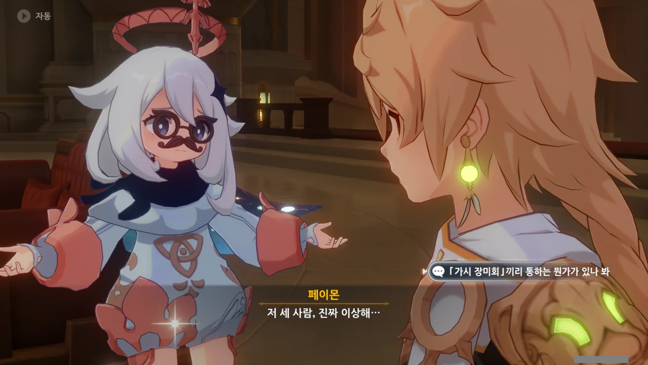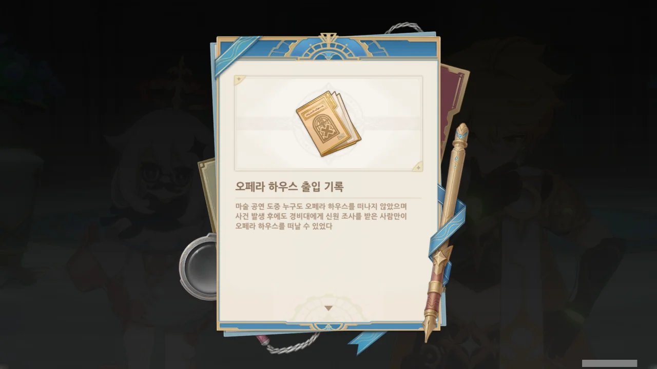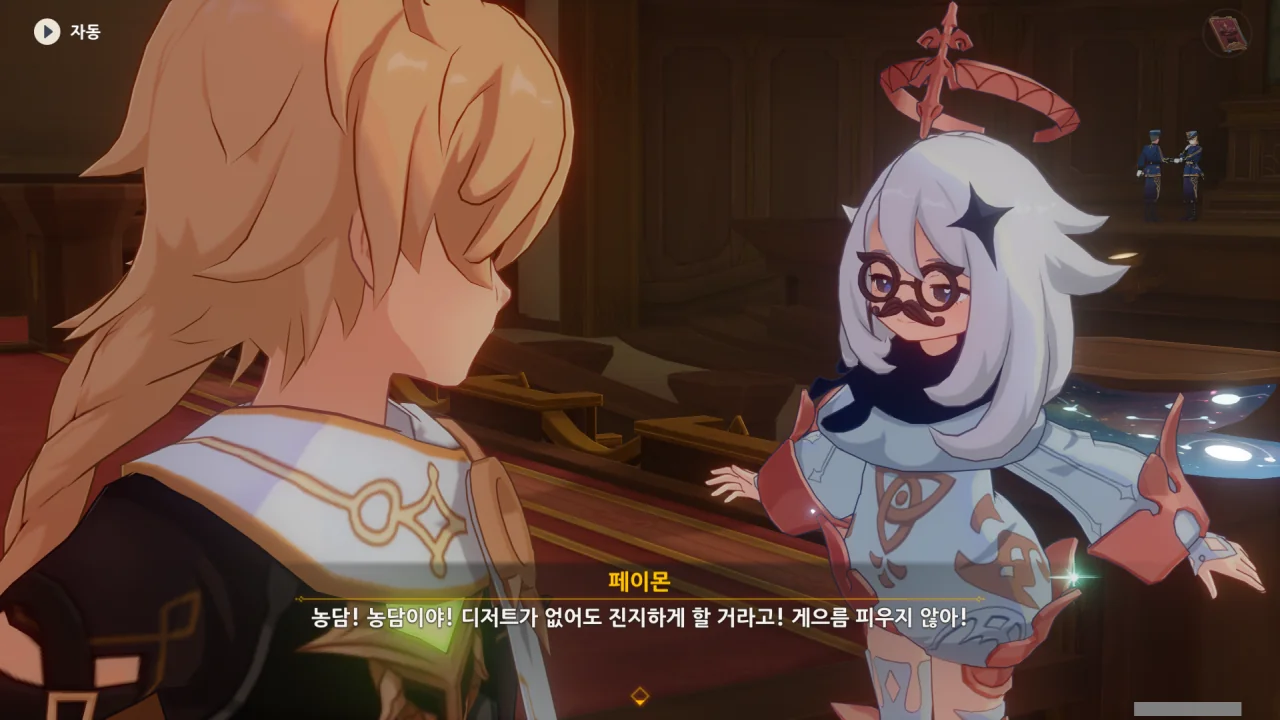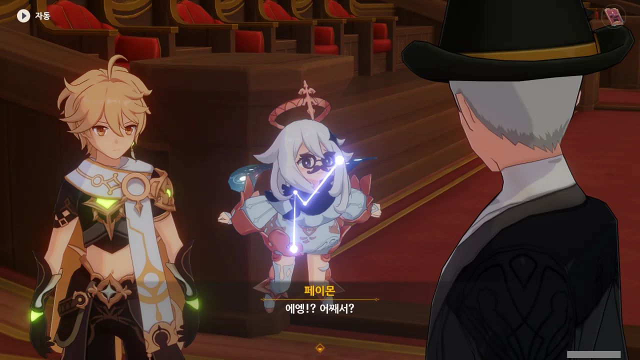 페이몬: 문을 지키는 자리에선 공연이 안 보이는구나… 나라면 못 참고 몰래 관객석으로 갔을 거야.