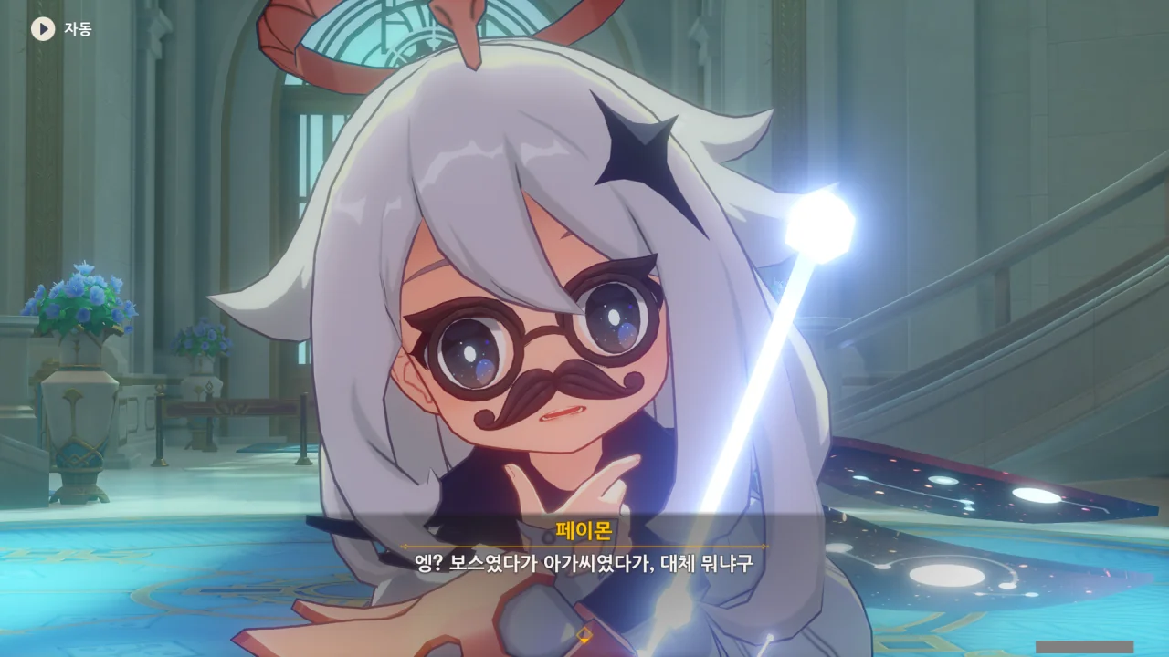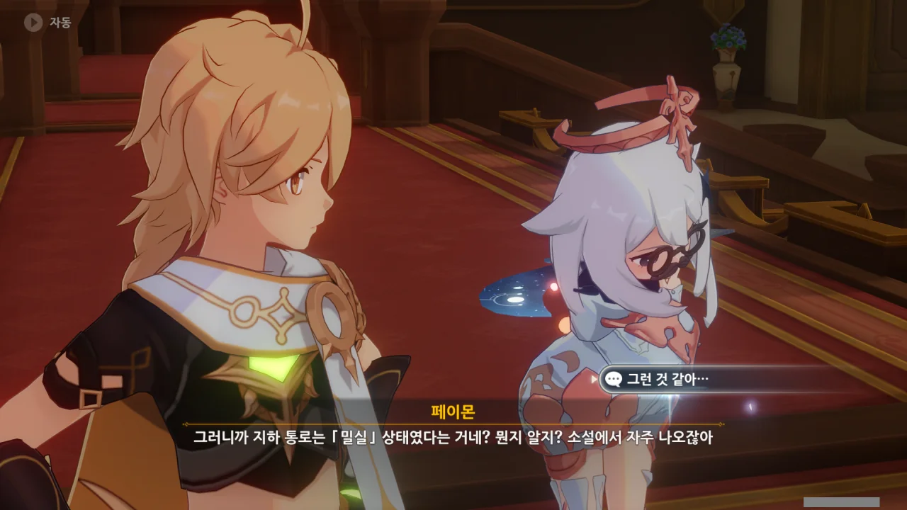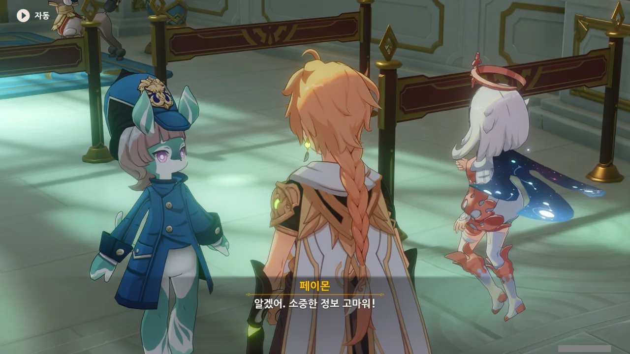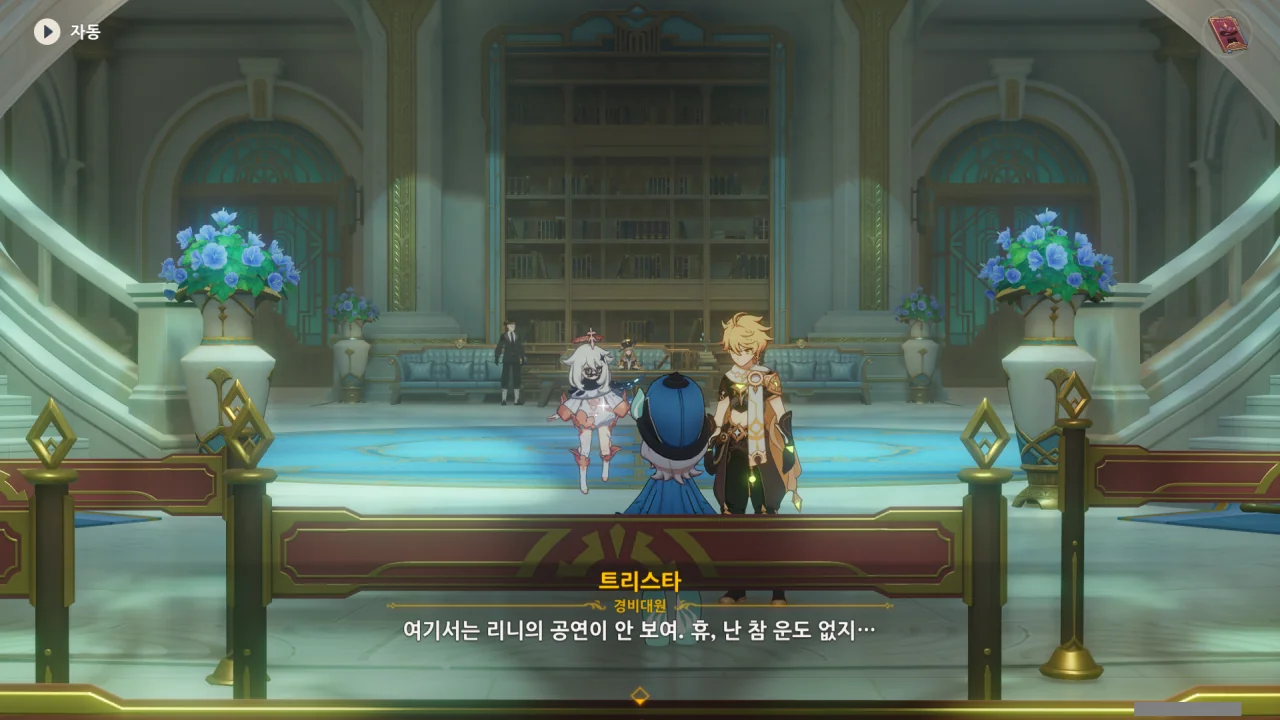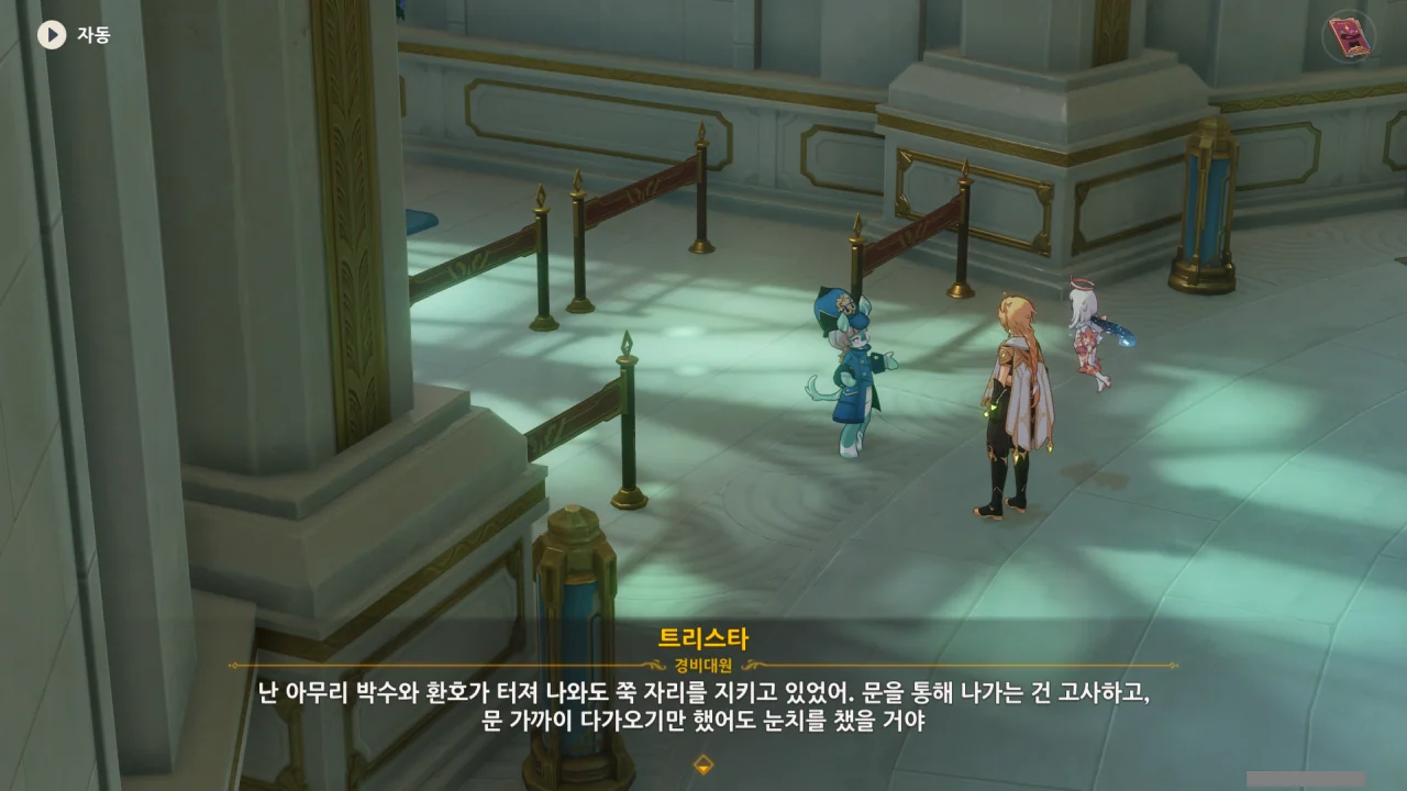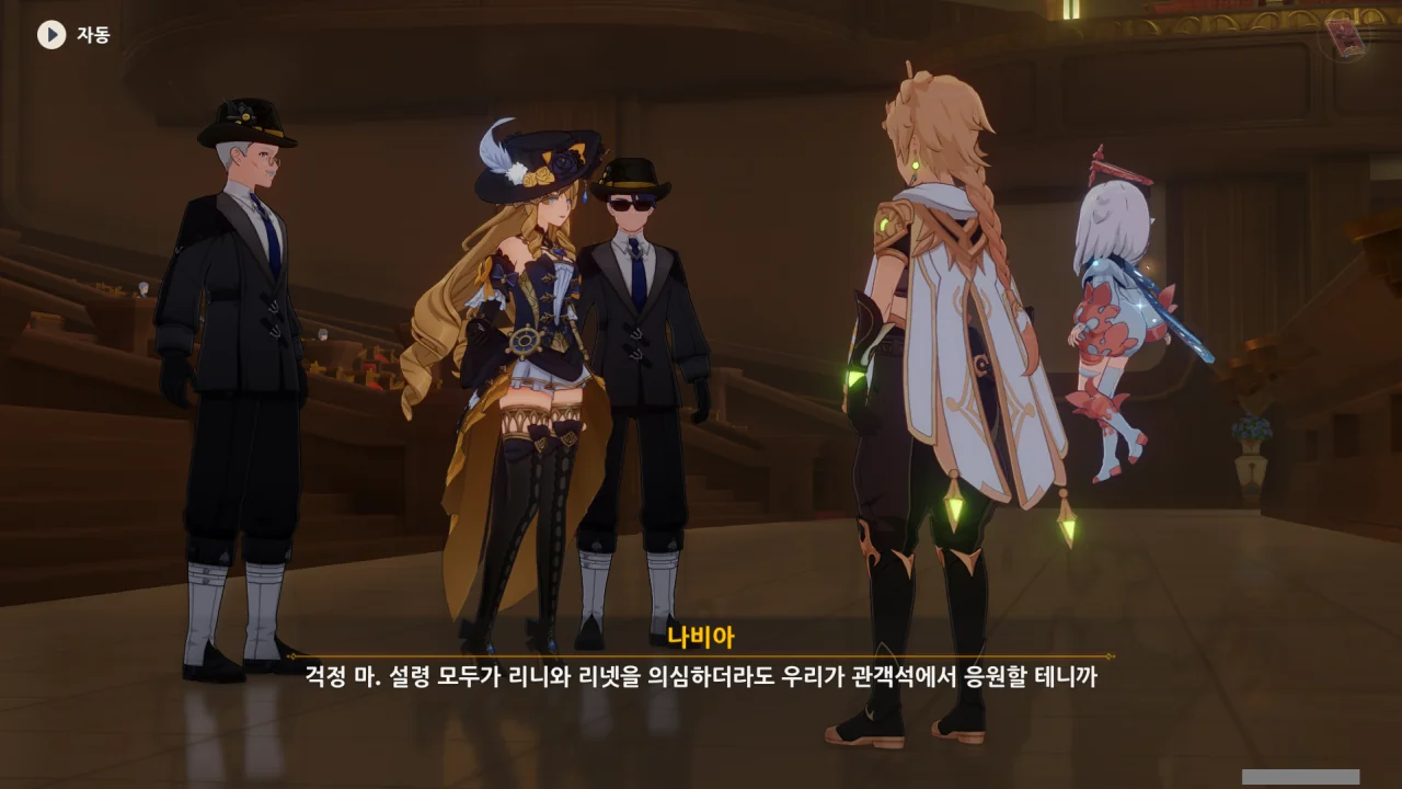 페이몬: 문을 지키는 자리에선 공연이 안 보이는구나… 나라면 못 참고 몰래 관객석으로 갔을 거야.