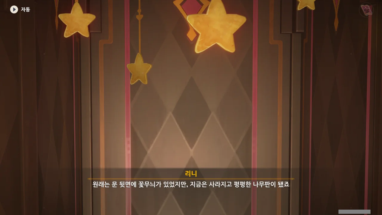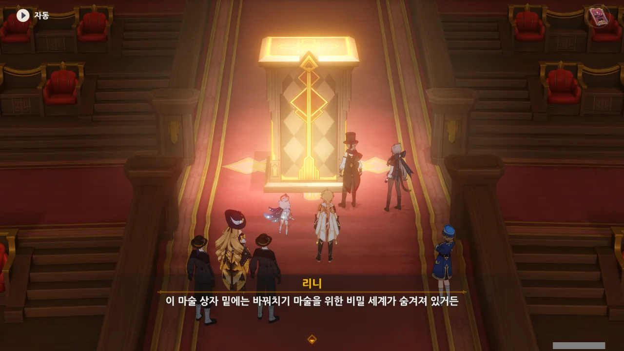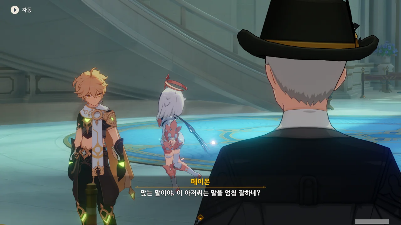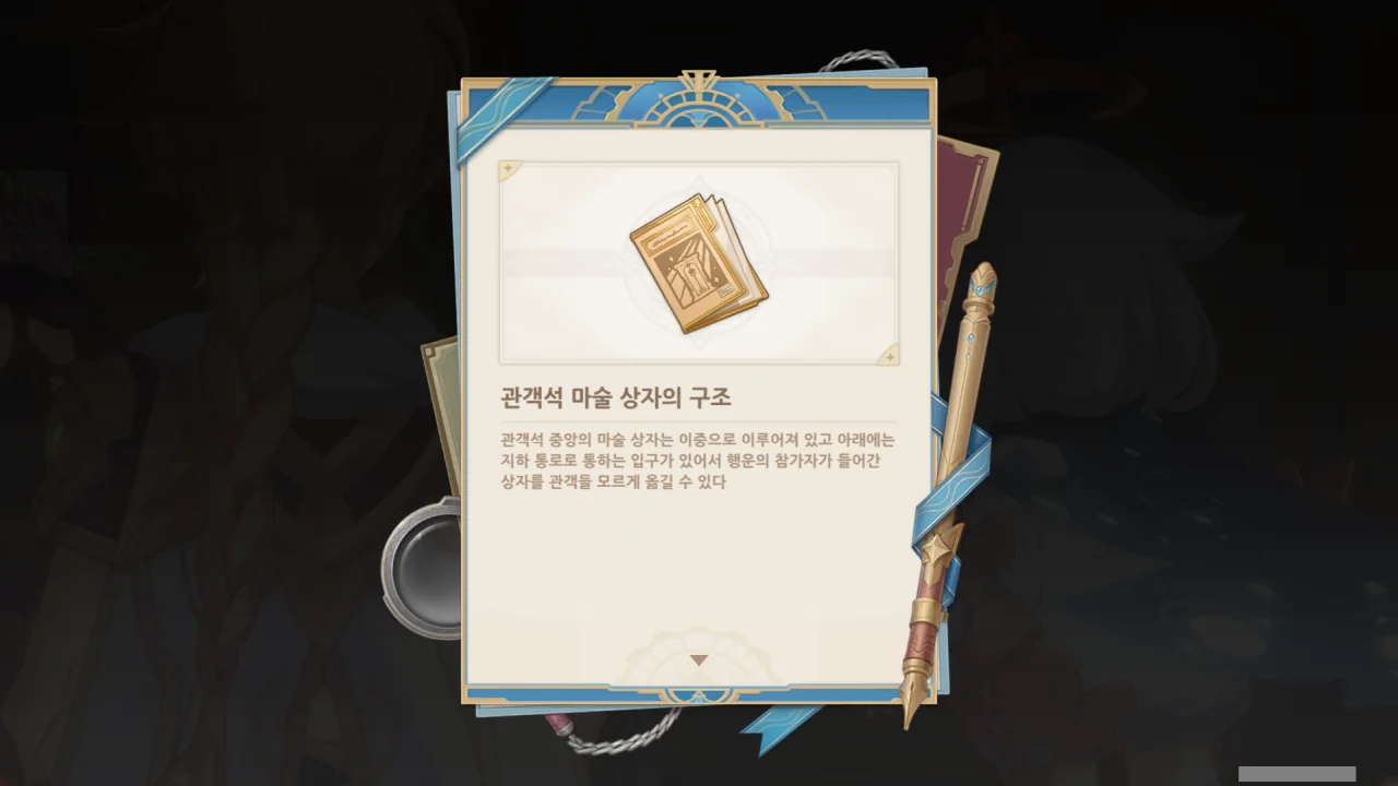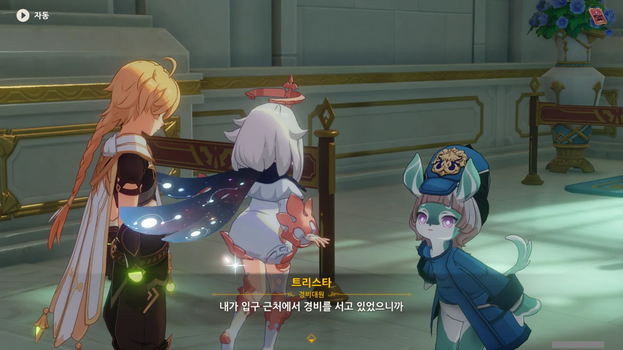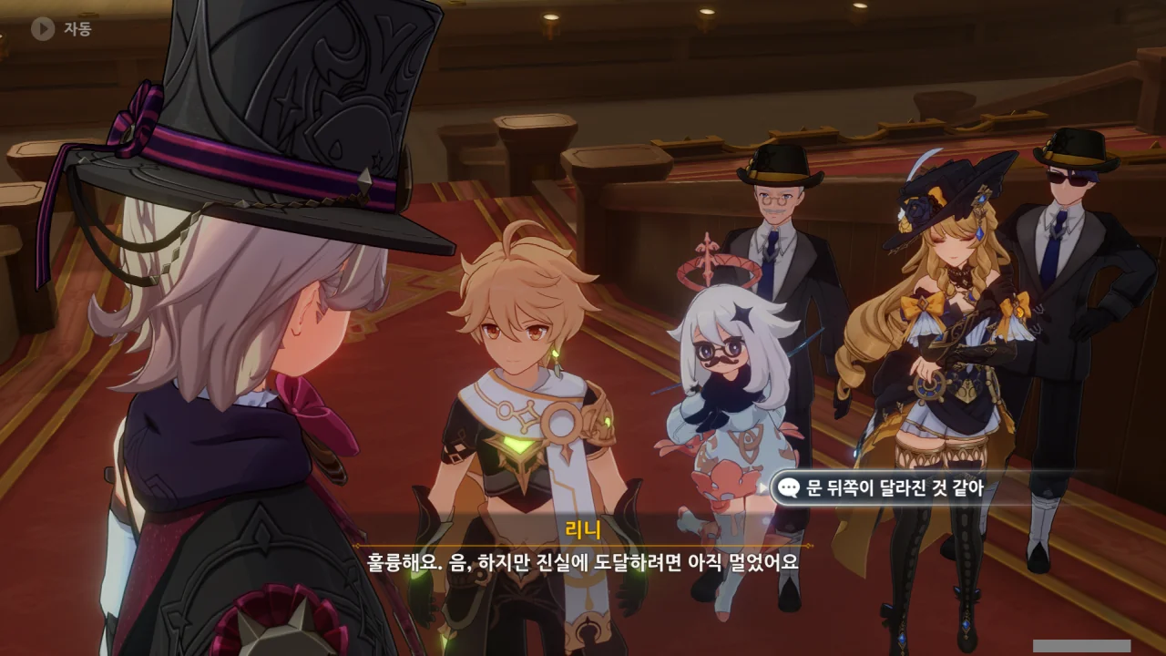 페이몬: 문을 지키는 자리에선 공연이 안 보이는구나… 나라면 못 참고 몰래 관객석으로 갔을 거야.