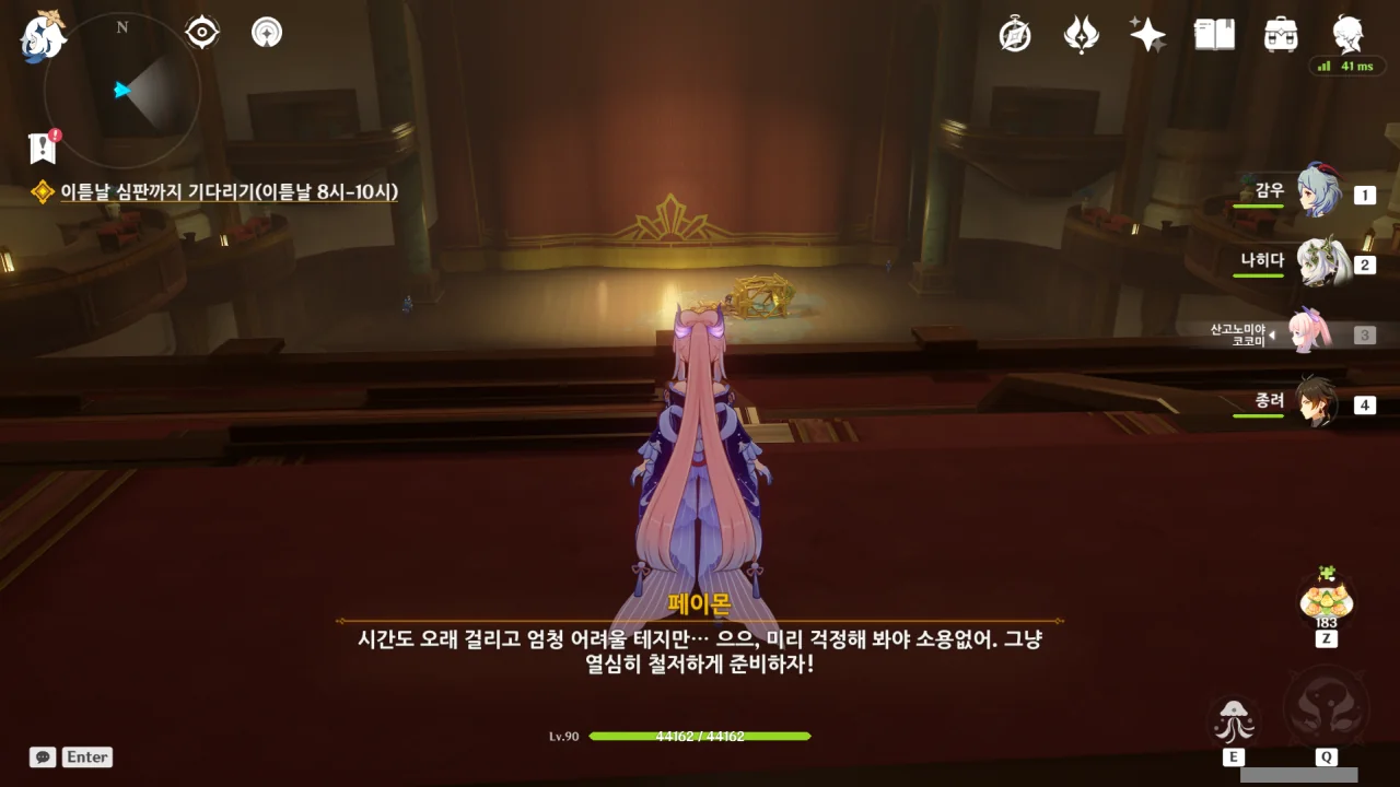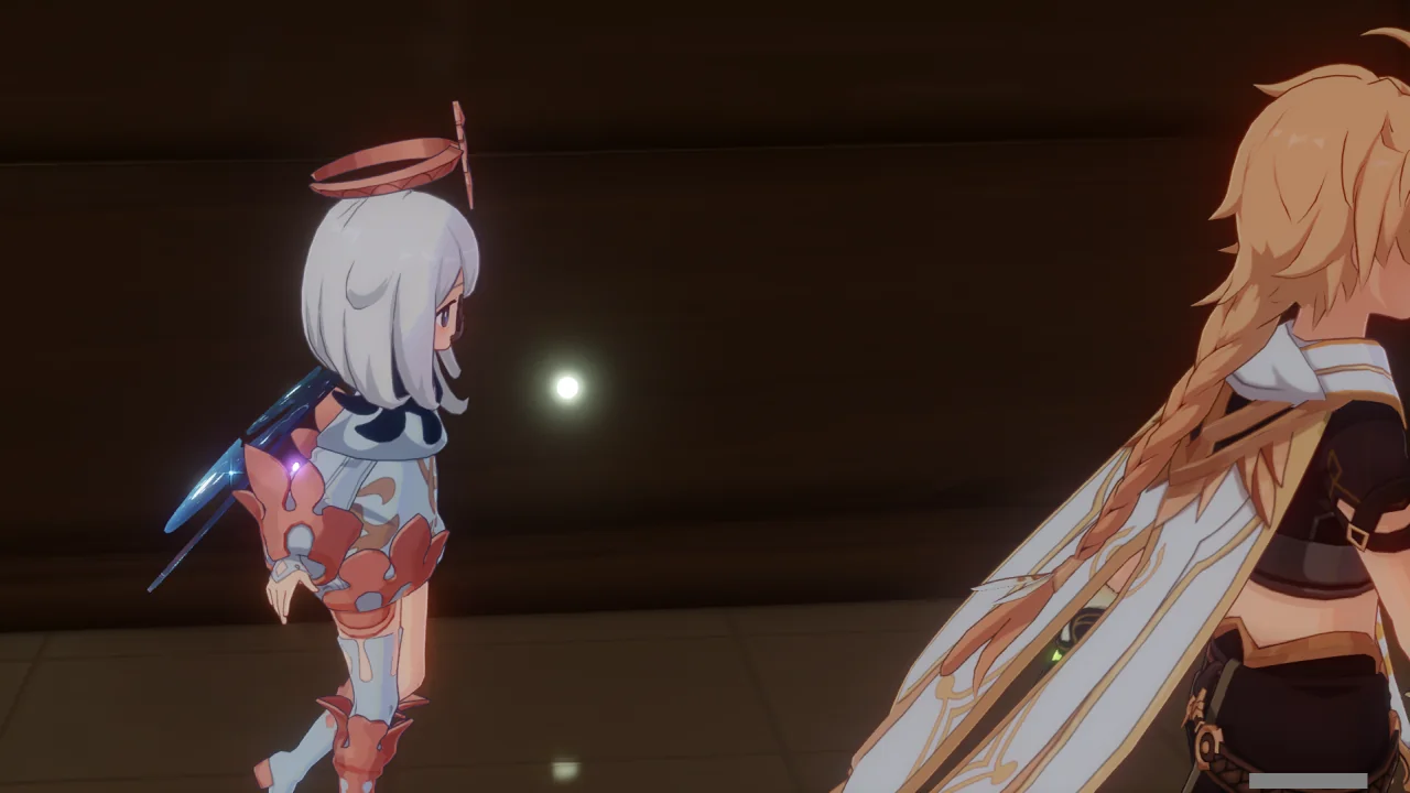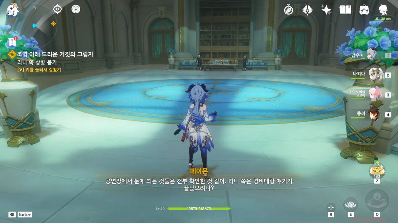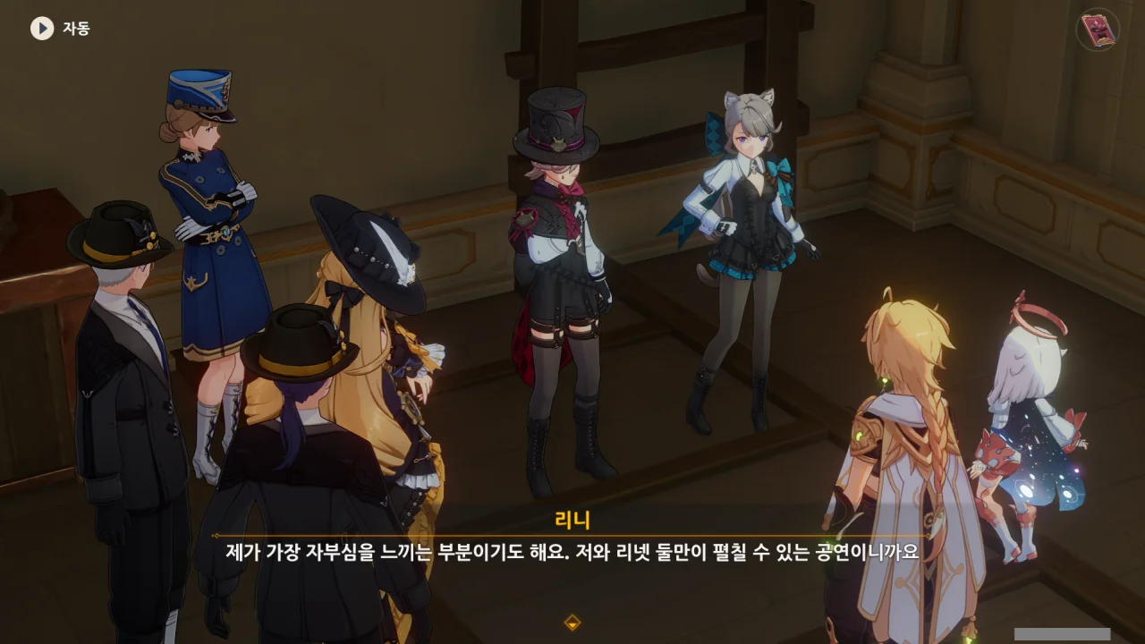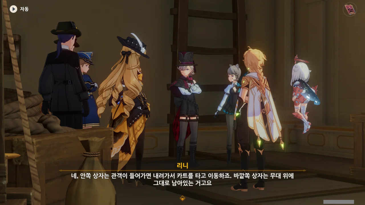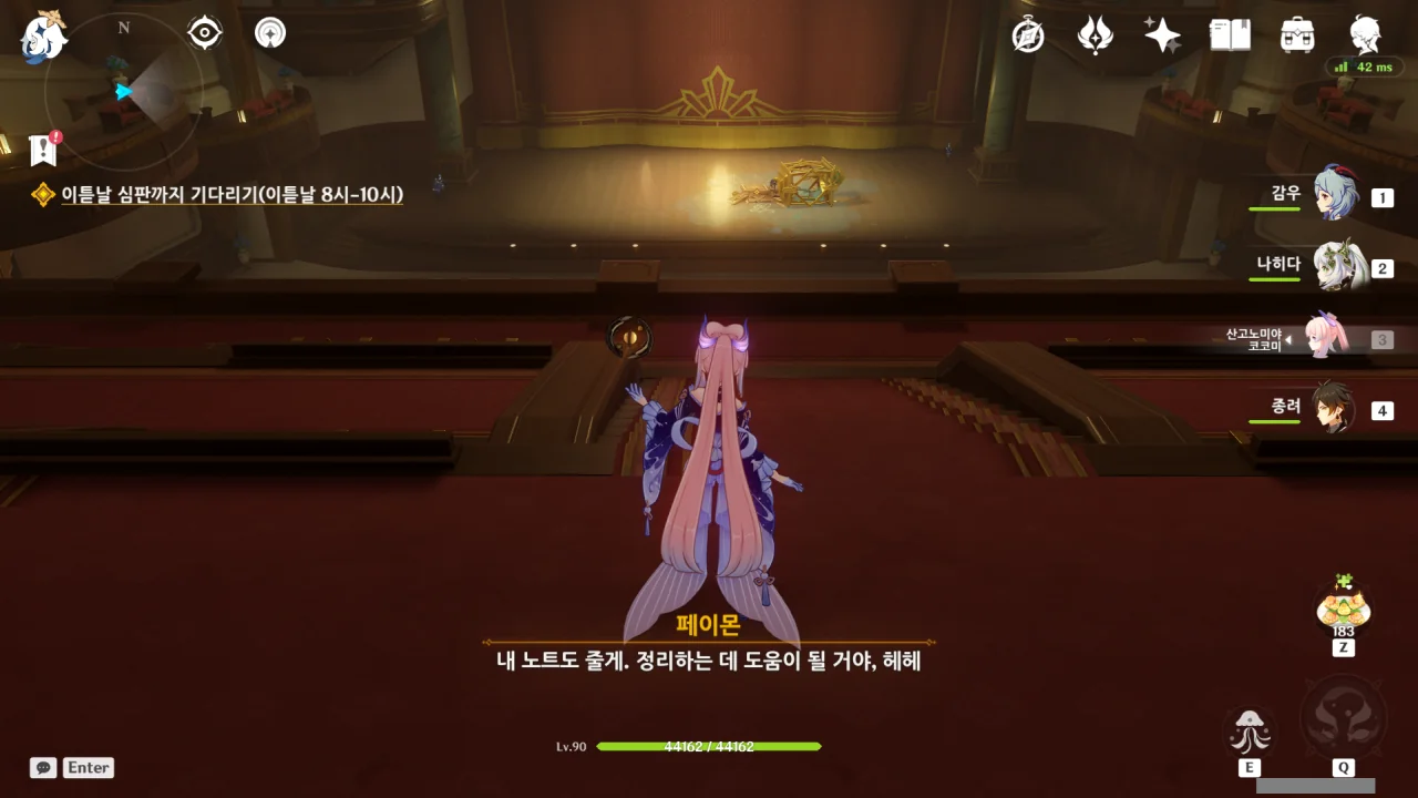 페이몬: 문을 지키는 자리에선 공연이 안 보이는구나… 나라면 못 참고 몰래 관객석으로 갔을 거야.