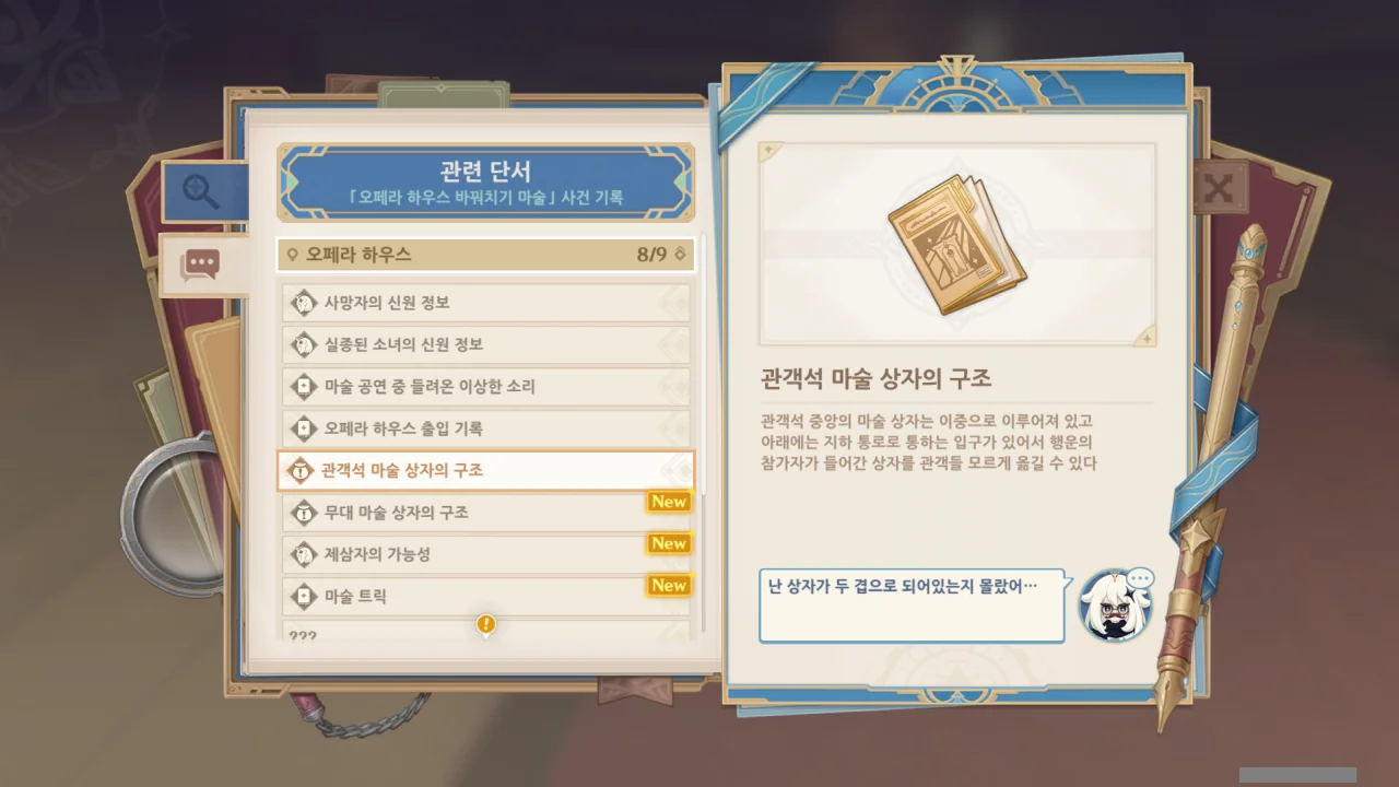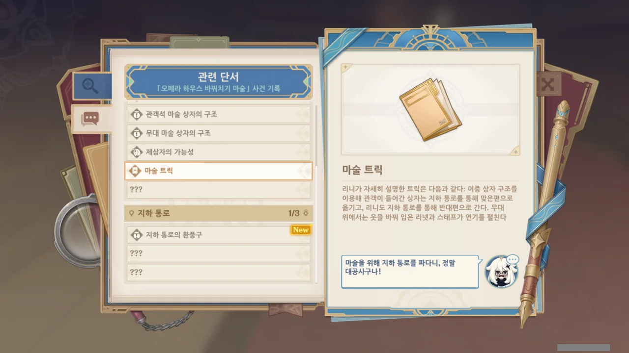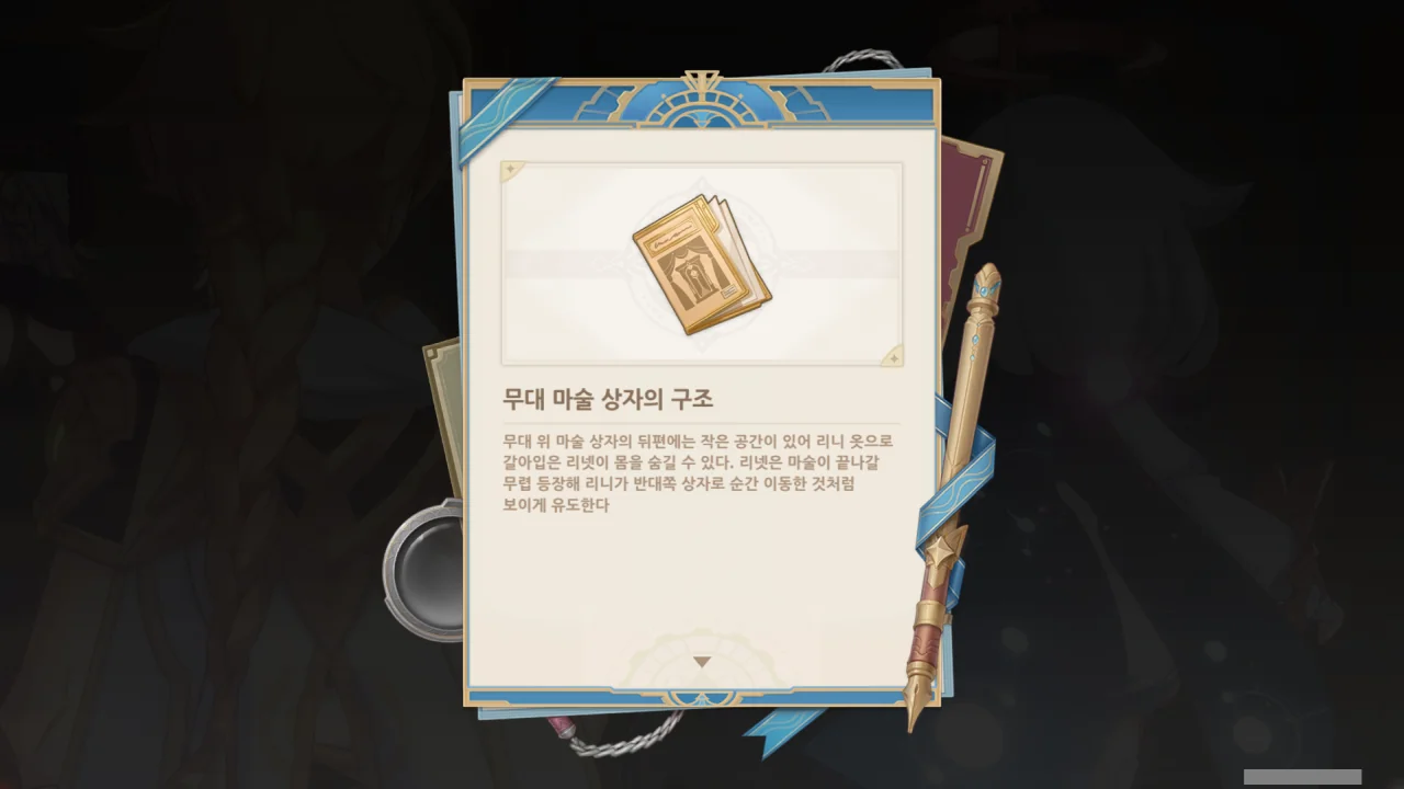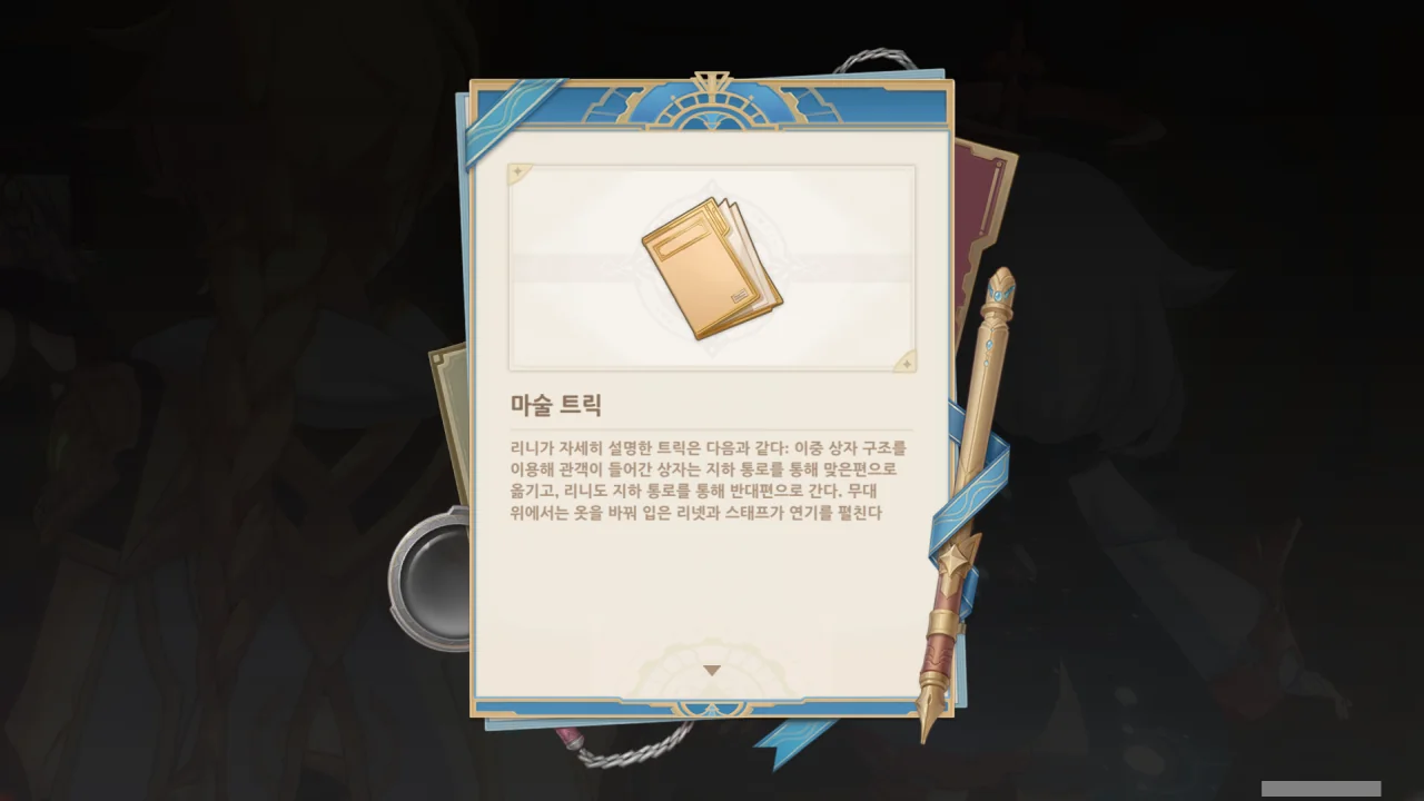 일단 현재로서 살펴볼 수 있는 것은 전부 살펴봤다. 이제 리니의 마술 트릭을 살펴볼 차례다.