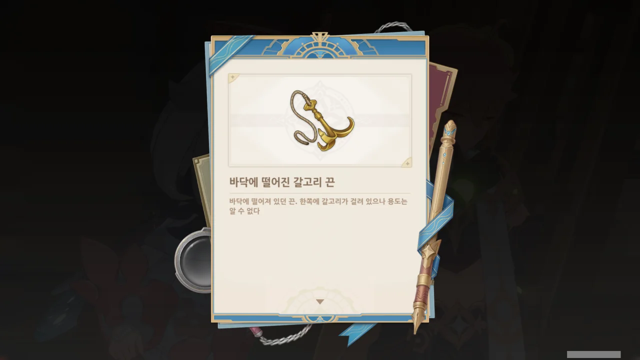 페이몬: 이건 마술 도구겠지? 여행자의 낚싯바늘처럼 여기저기에 걸 수 있을 것 같아.