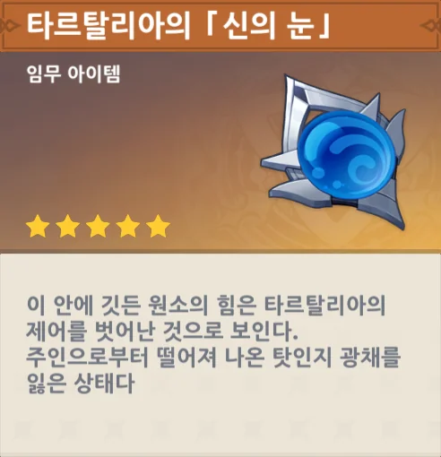 난 지금까지 「신의 눈」이 개인에게 귀속되는 종속형 물체인 줄 알았는데, 설정을 찾아보니까 그냥 단순한 외부 마력 기관일 뿐이라서 자동으로 소유자에게 되돌아오는 기능 같은 건 없다고 한다. 그러니까 이 「신의 눈」은 여행자가 타르탈리아에게 돌려주기 전까지는 계속 여행자의 배낭 속에 들어있을 예정이라는 것이다.