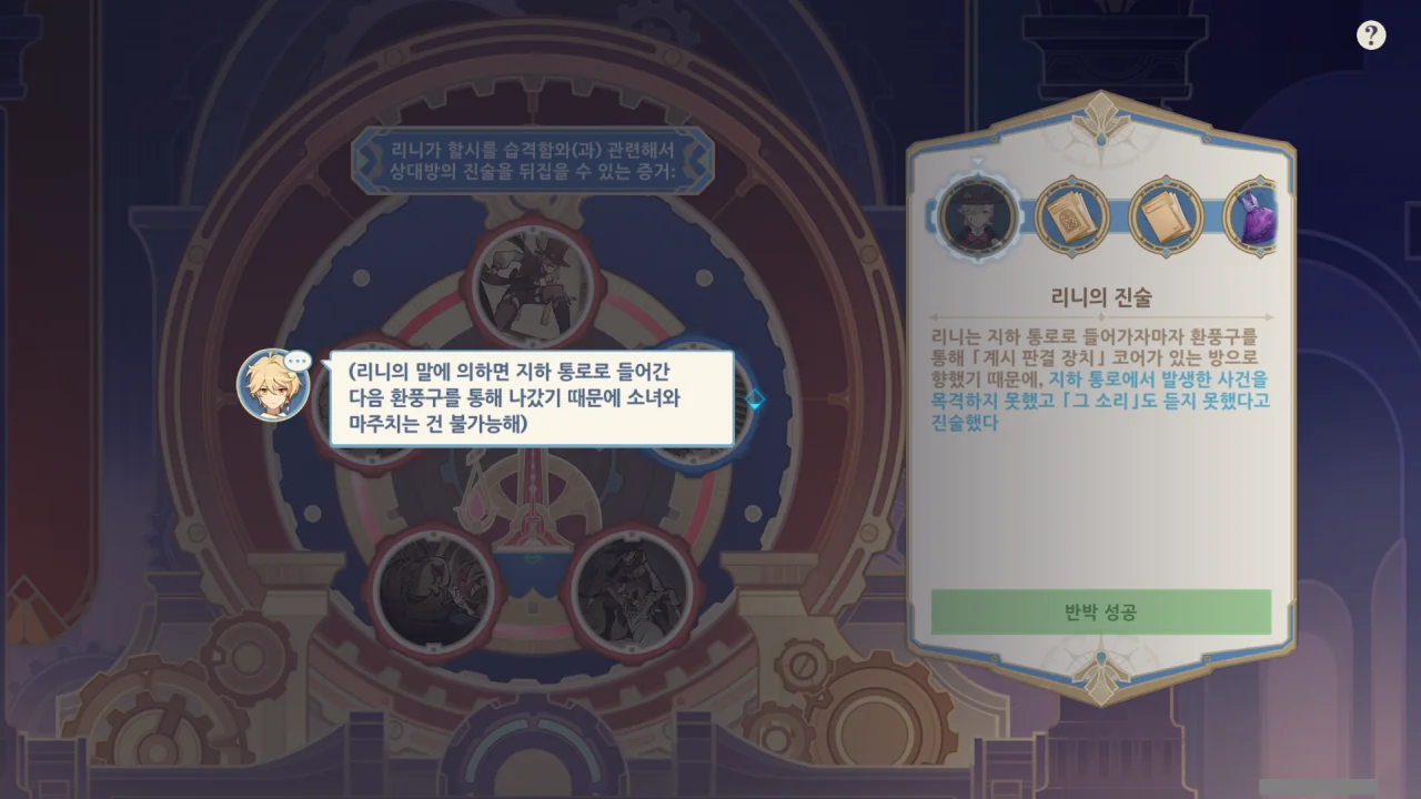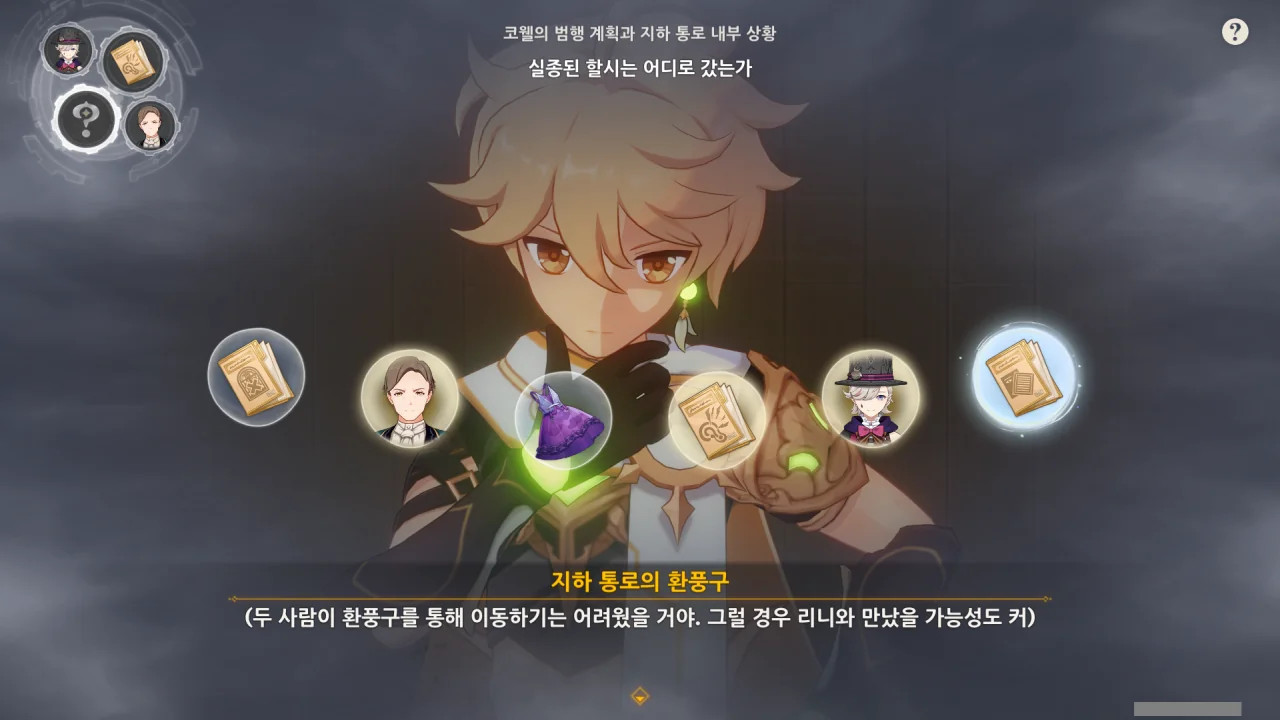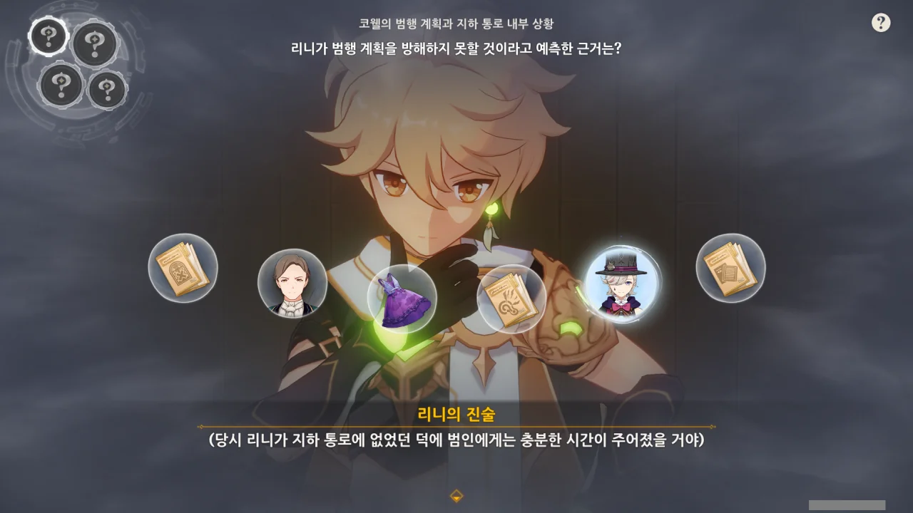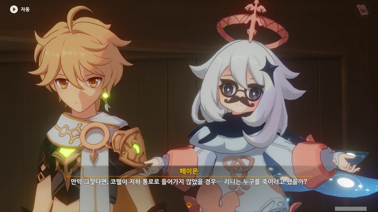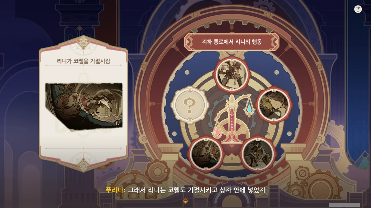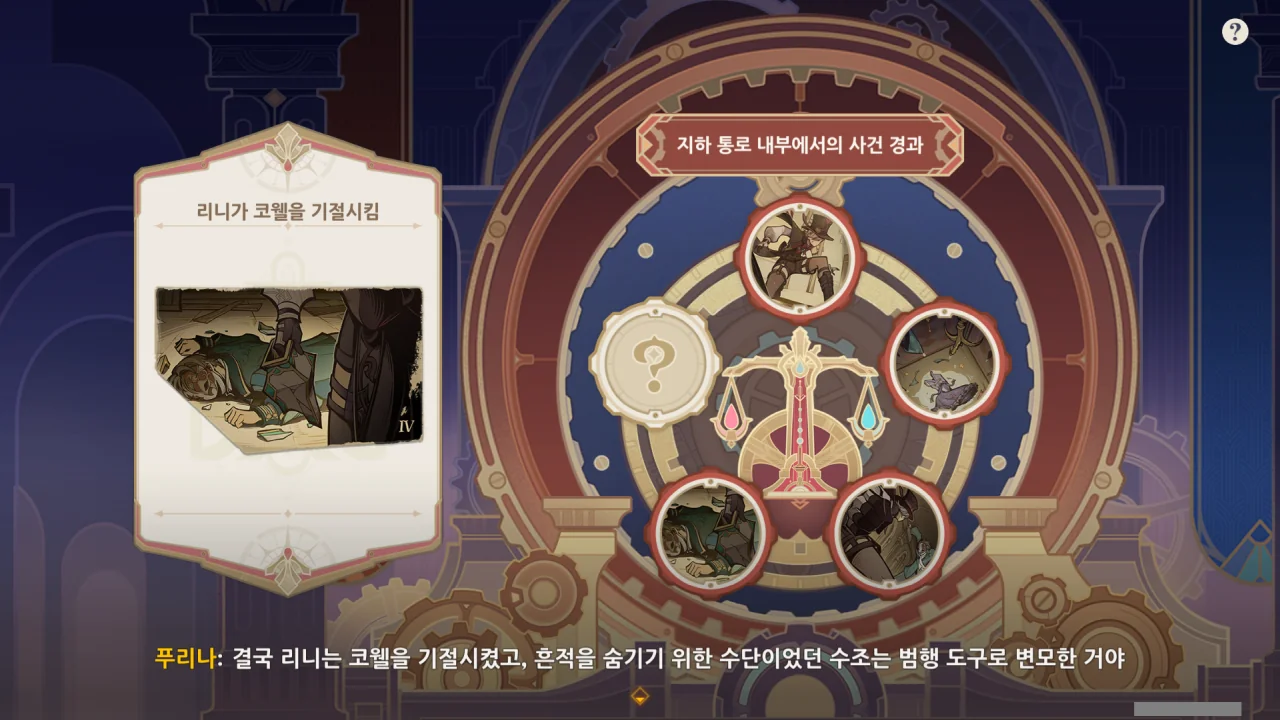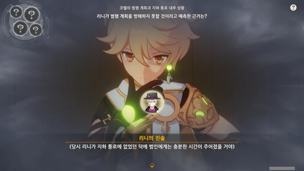 페이몬이 "코웰이 지하 통로로 들어가지 않았을 경우, 리니는 누구를 죽이려고 했을까?"라고 말하는데, 이후 대사와의 연결이 어딘가 매끄럽지 않다. '코웰을 그런 방식으로 죽일 이유가 없다'라고 해석하는 게 더 나을 것 같다.