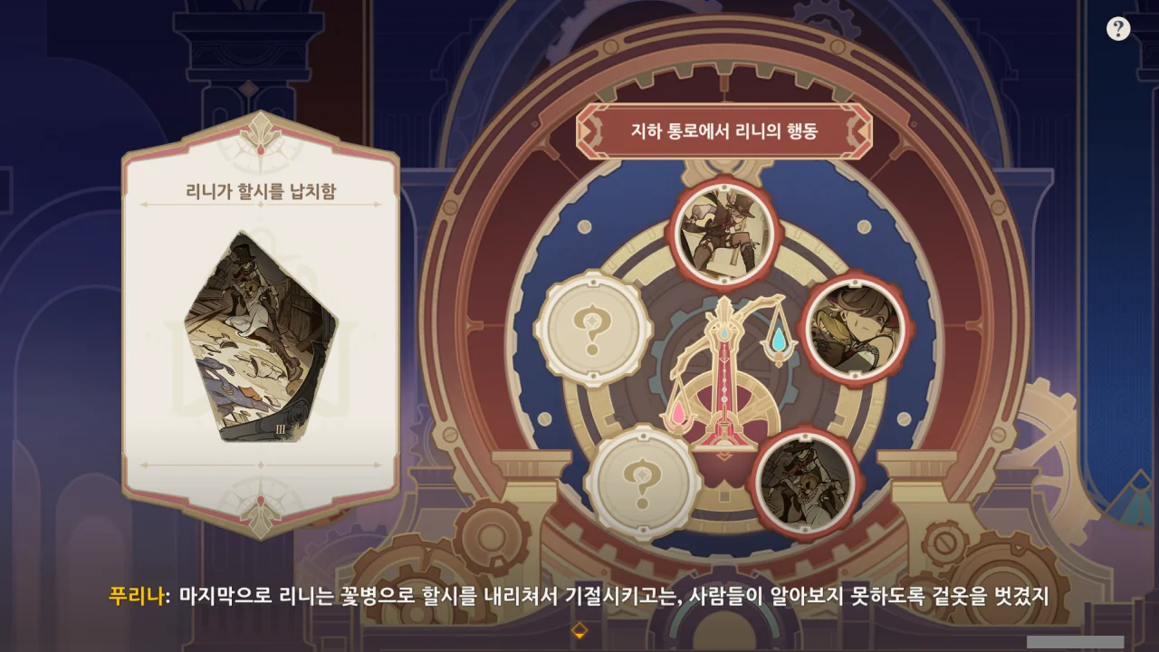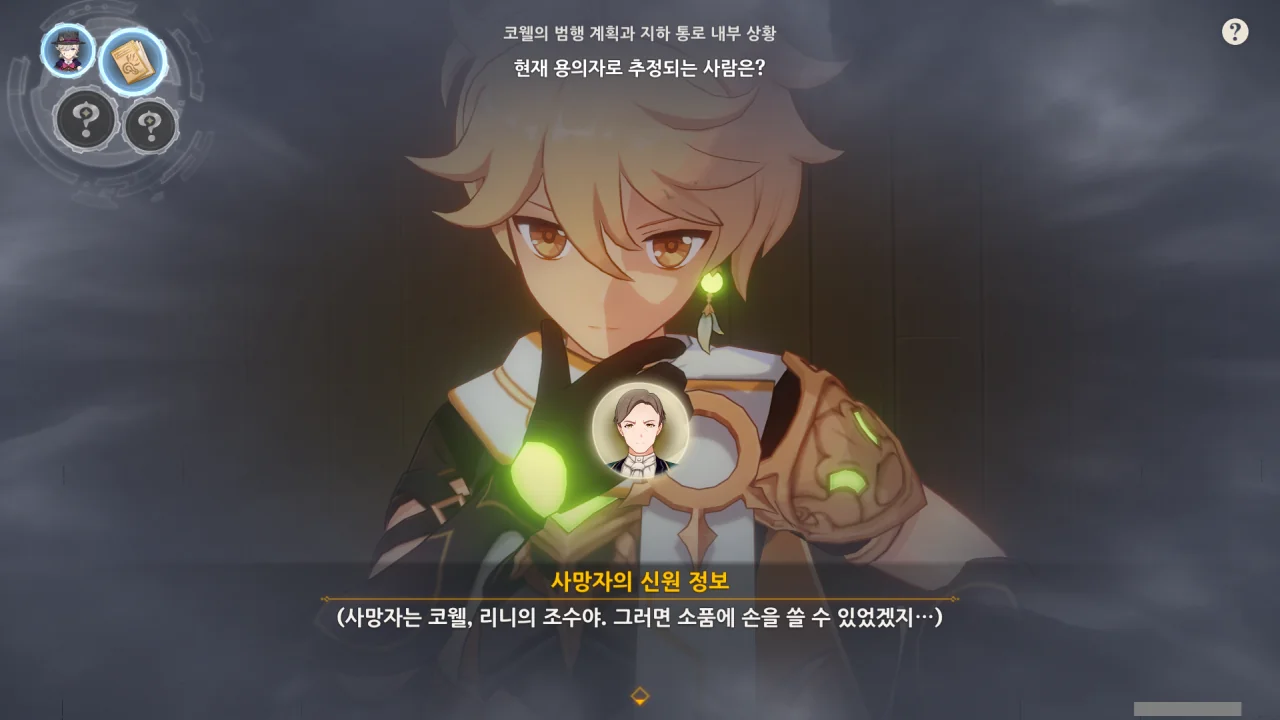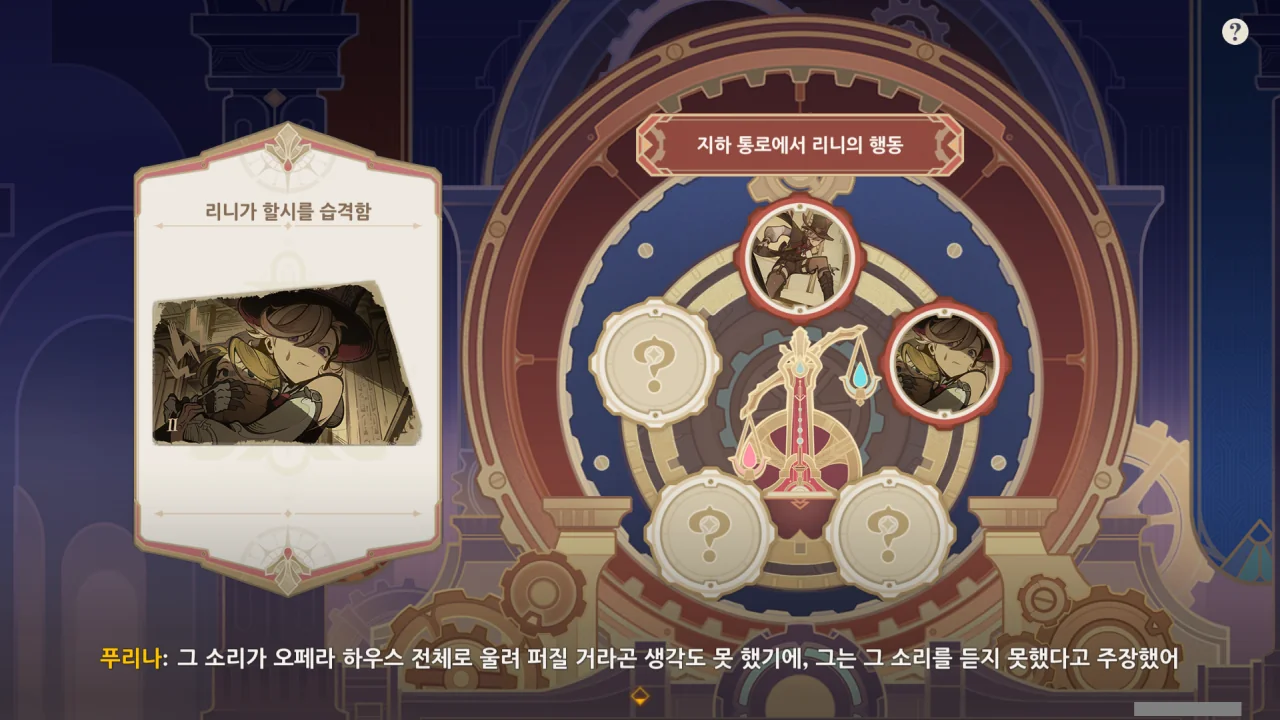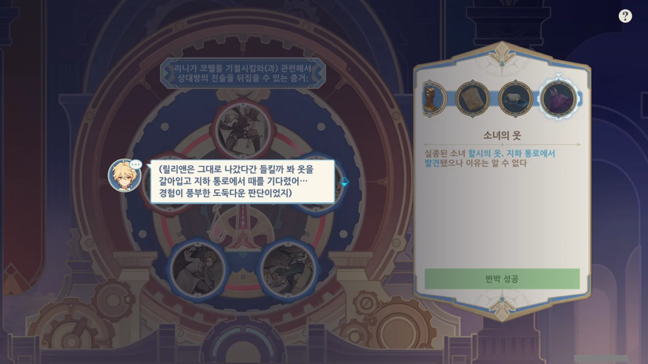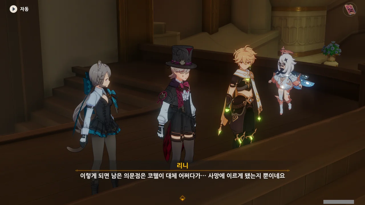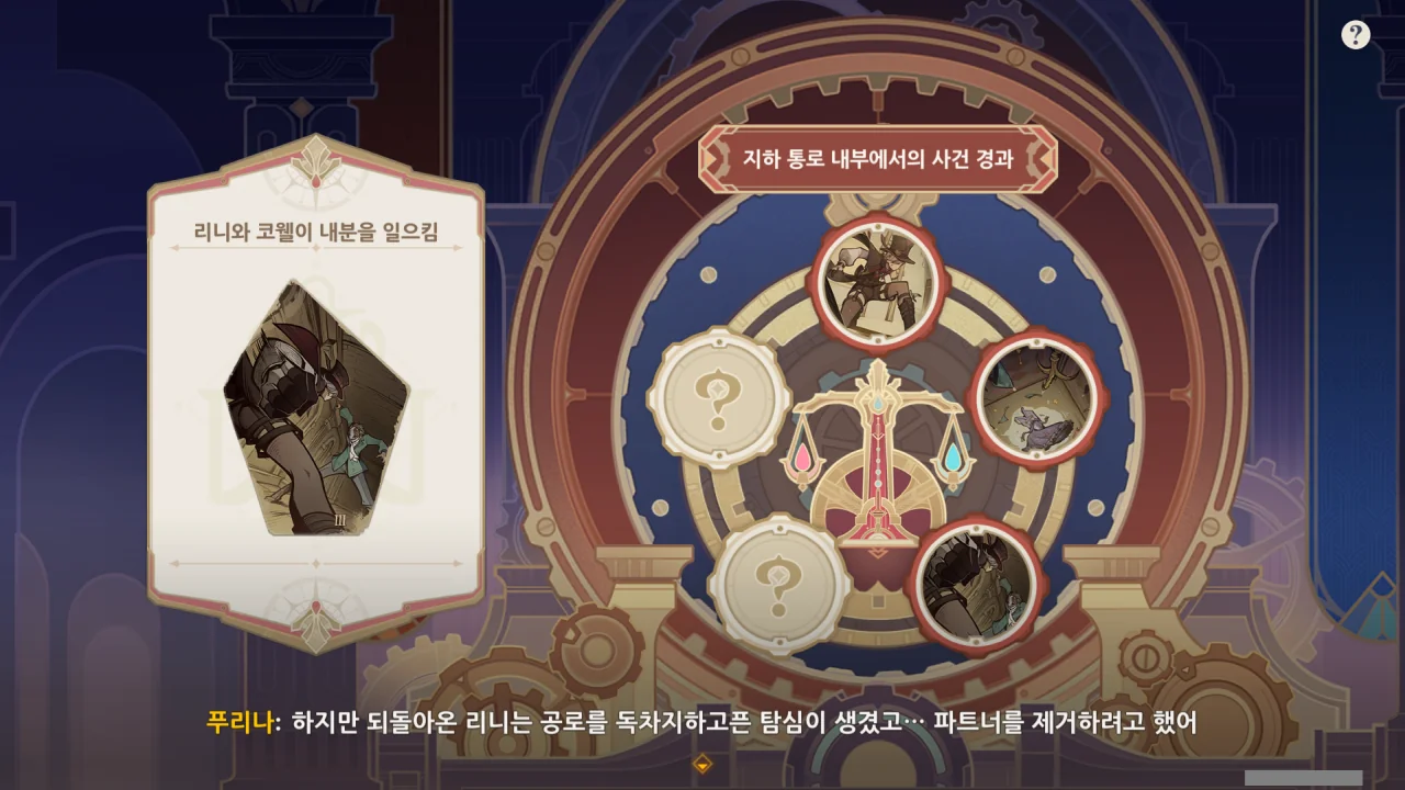페이몬이 "코웰이 지하 통로로 들어가지 않았을 경우, 리니는 누구를 죽이려고 했을까?"라고 말하는데, 이후 대사와의 연결이 어딘가 매끄럽지 않다. '코웰을 그런 방식으로 죽일 이유가 없다'라고 해석하는 게 더 나을 것 같다.