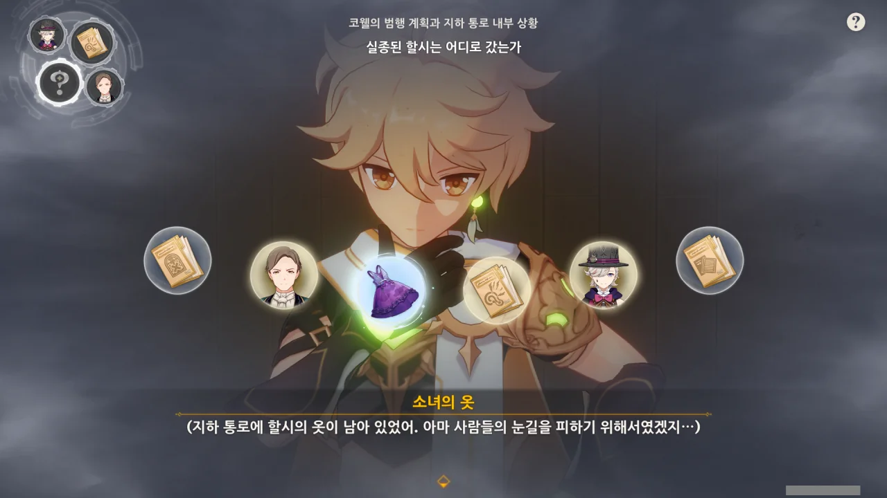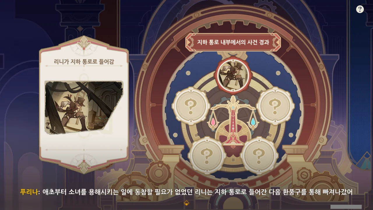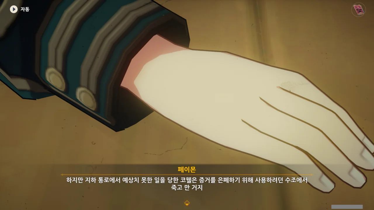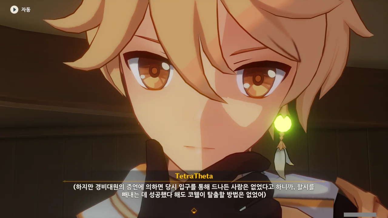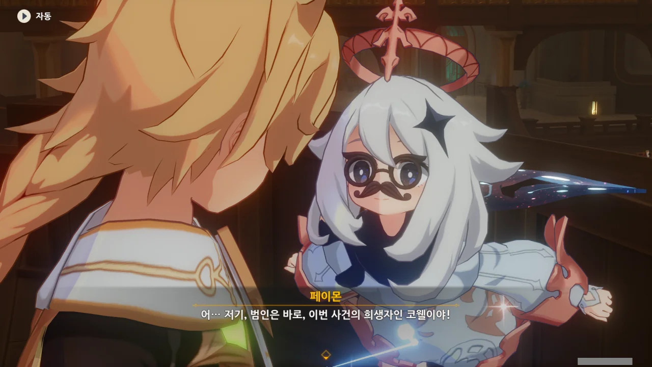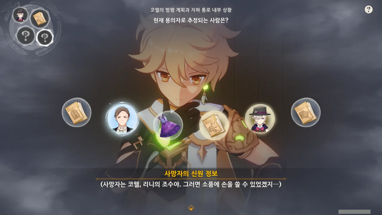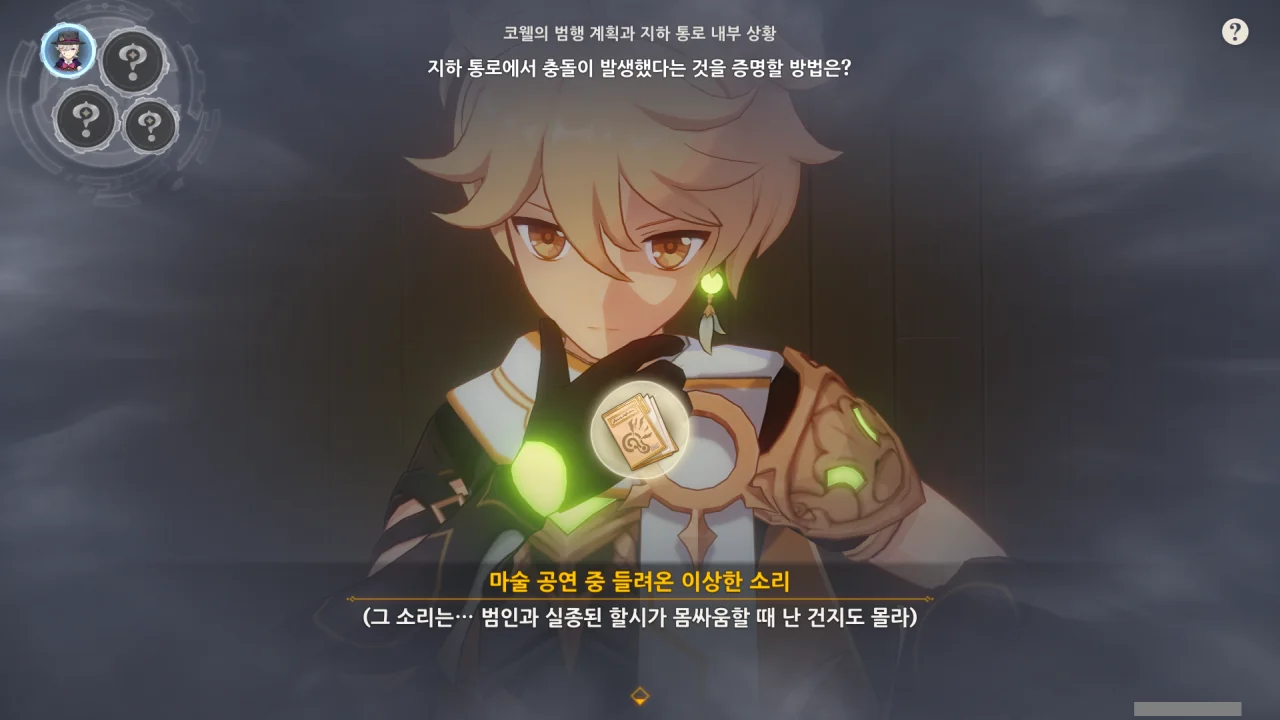 페이몬이 "코웰이 지하 통로로 들어가지 않았을 경우, 리니는 누구를 죽이려고 했을까?"라고 말하는데, 이후 대사와의 연결이 어딘가 매끄럽지 않다. '코웰을 그런 방식으로 죽일 이유가 없다'라고 해석하는 게 더 나을 것 같다.