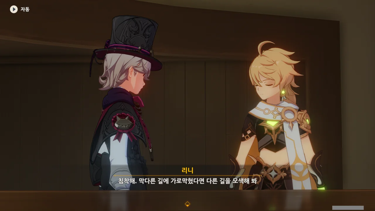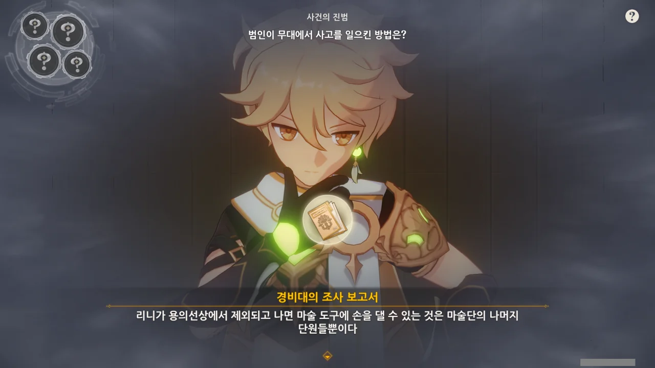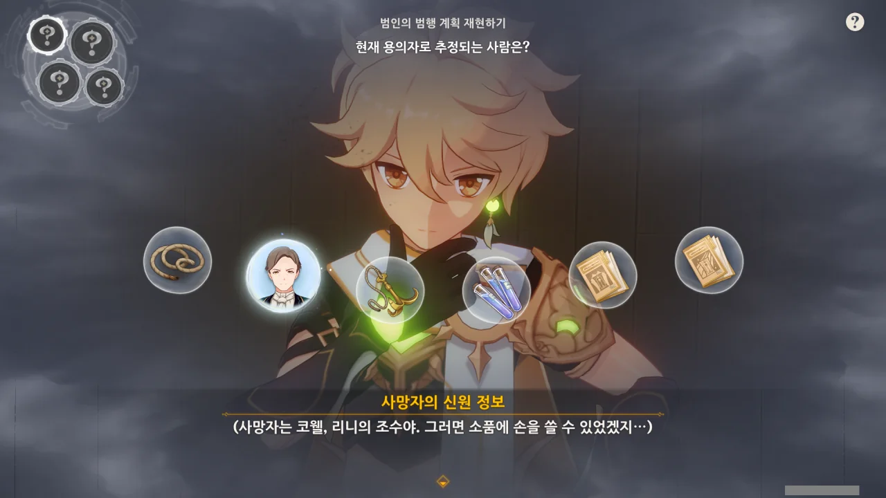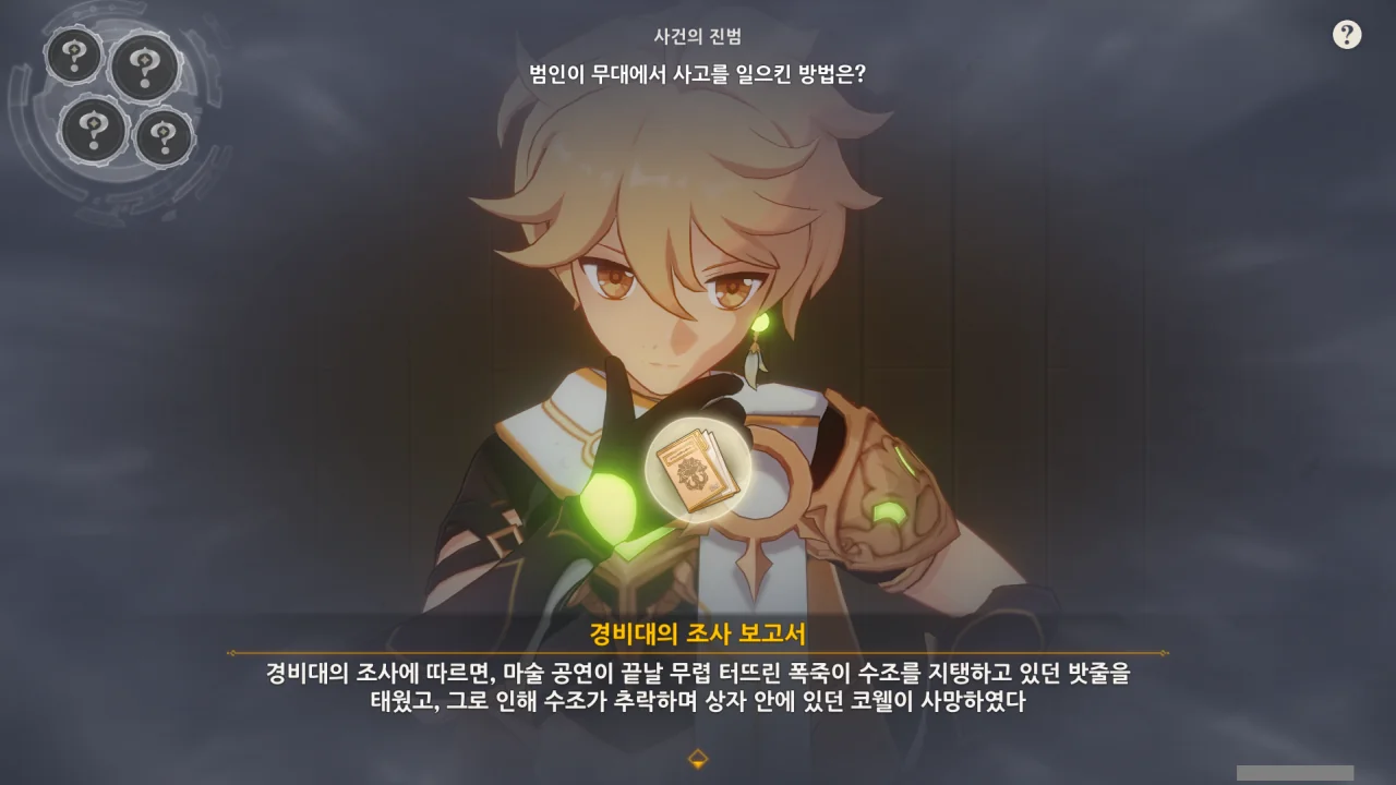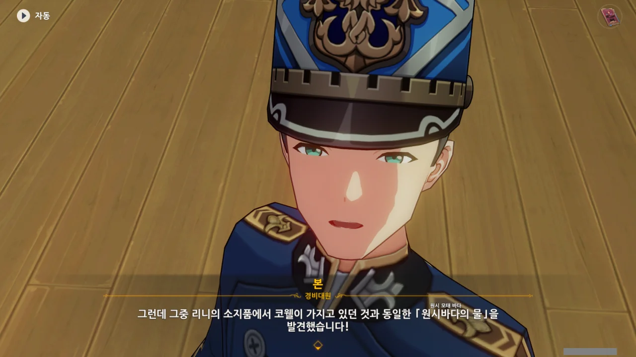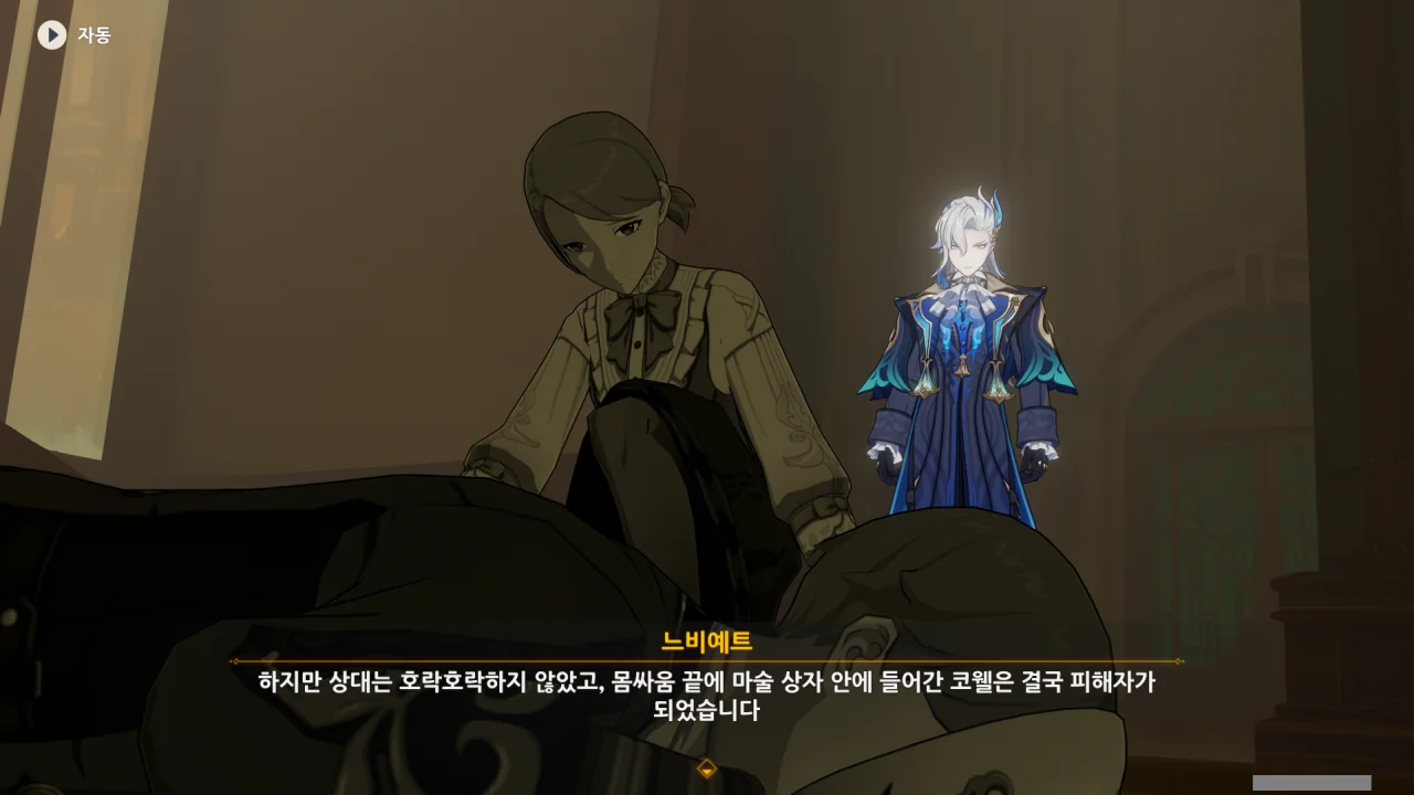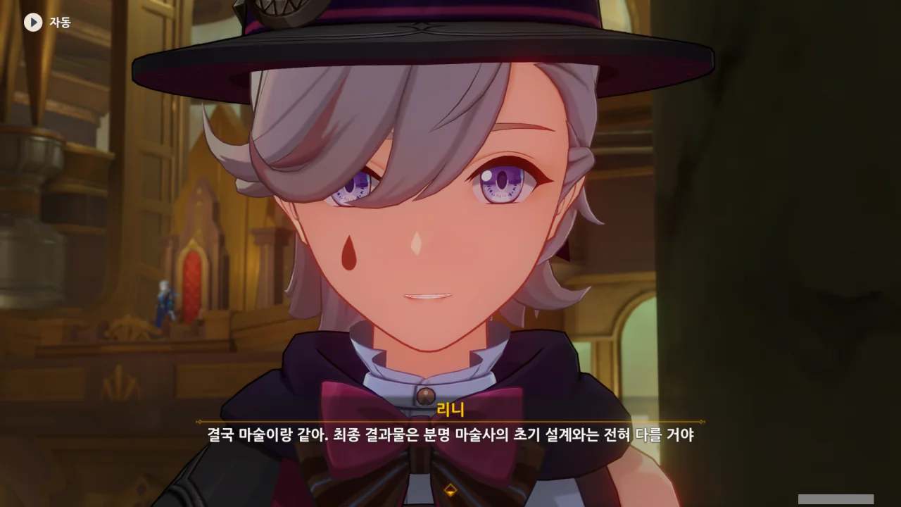 페이몬이 "코웰이 지하 통로로 들어가지 않았을 경우, 리니는 누구를 죽이려고 했을까?"라고 말하는데, 이후 대사와의 연결이 어딘가 매끄럽지 않다. '코웰을 그런 방식으로 죽일 이유가 없다'라고 해석하는 게 더 나을 것 같다.