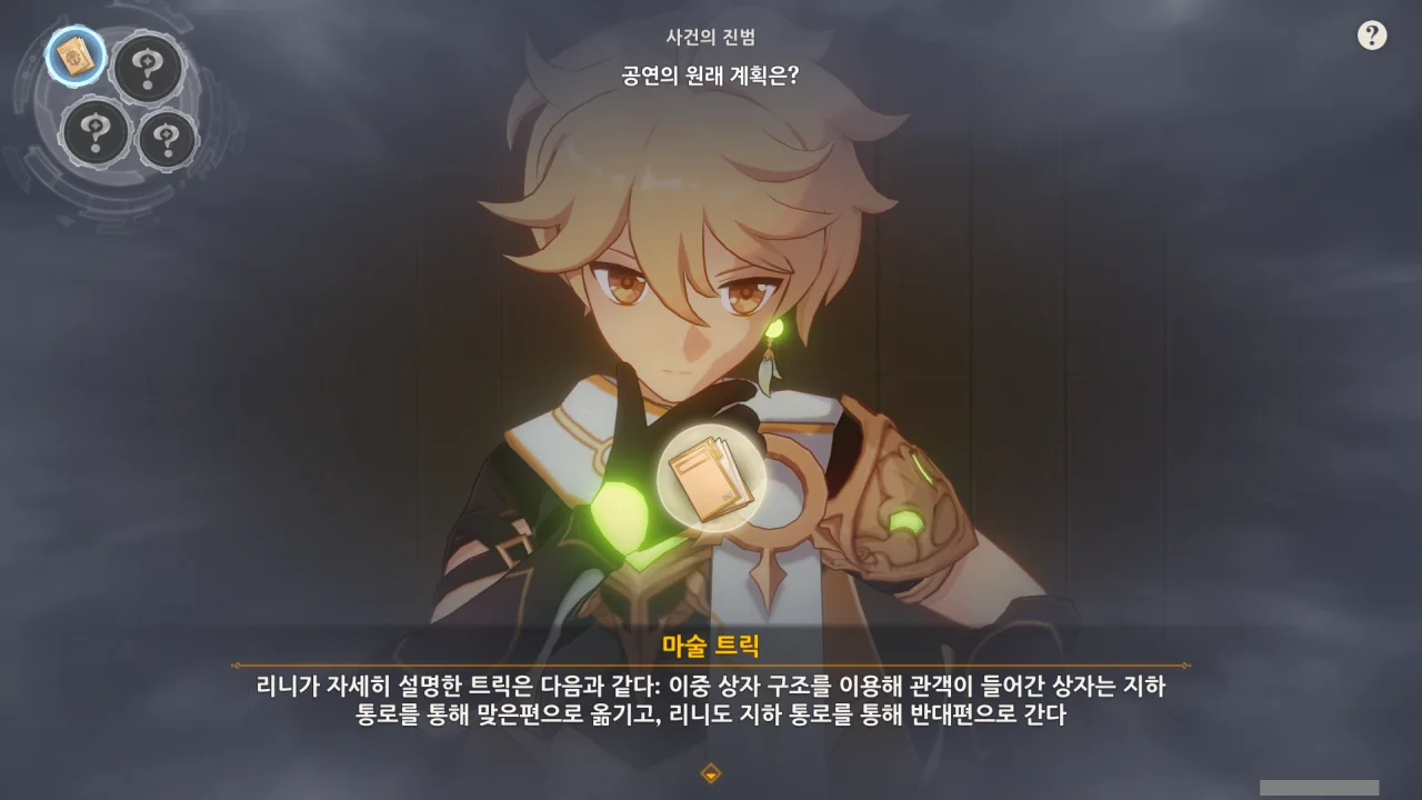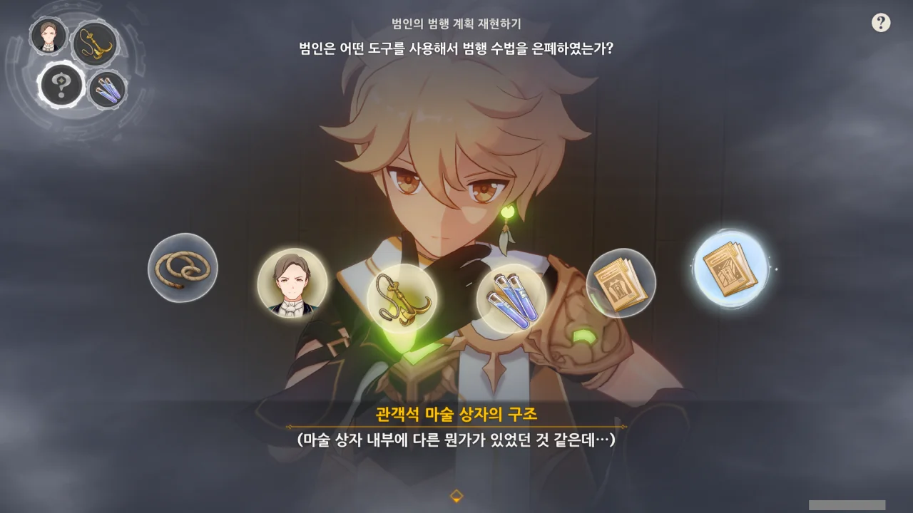 아까 지하 통로를 조사할 때, 상자를 조사하자 '상자 안에 마술 도구와 공연 의상이 마구잡이로 뒤섞여있다'라고 나왔었는데, 그게 복선이었던 셈이다. 아니 근데 그 상자, 아무리 봐도 끈으로 잘 묶여 있었는데?