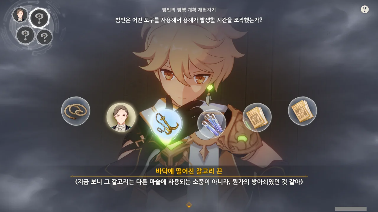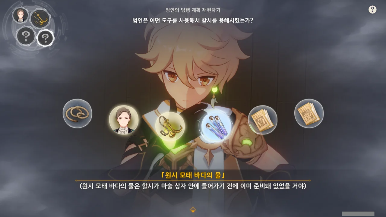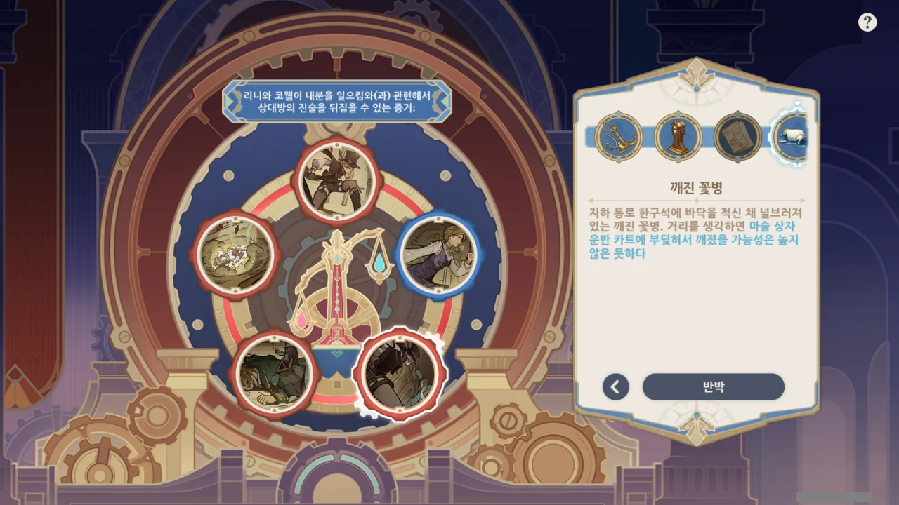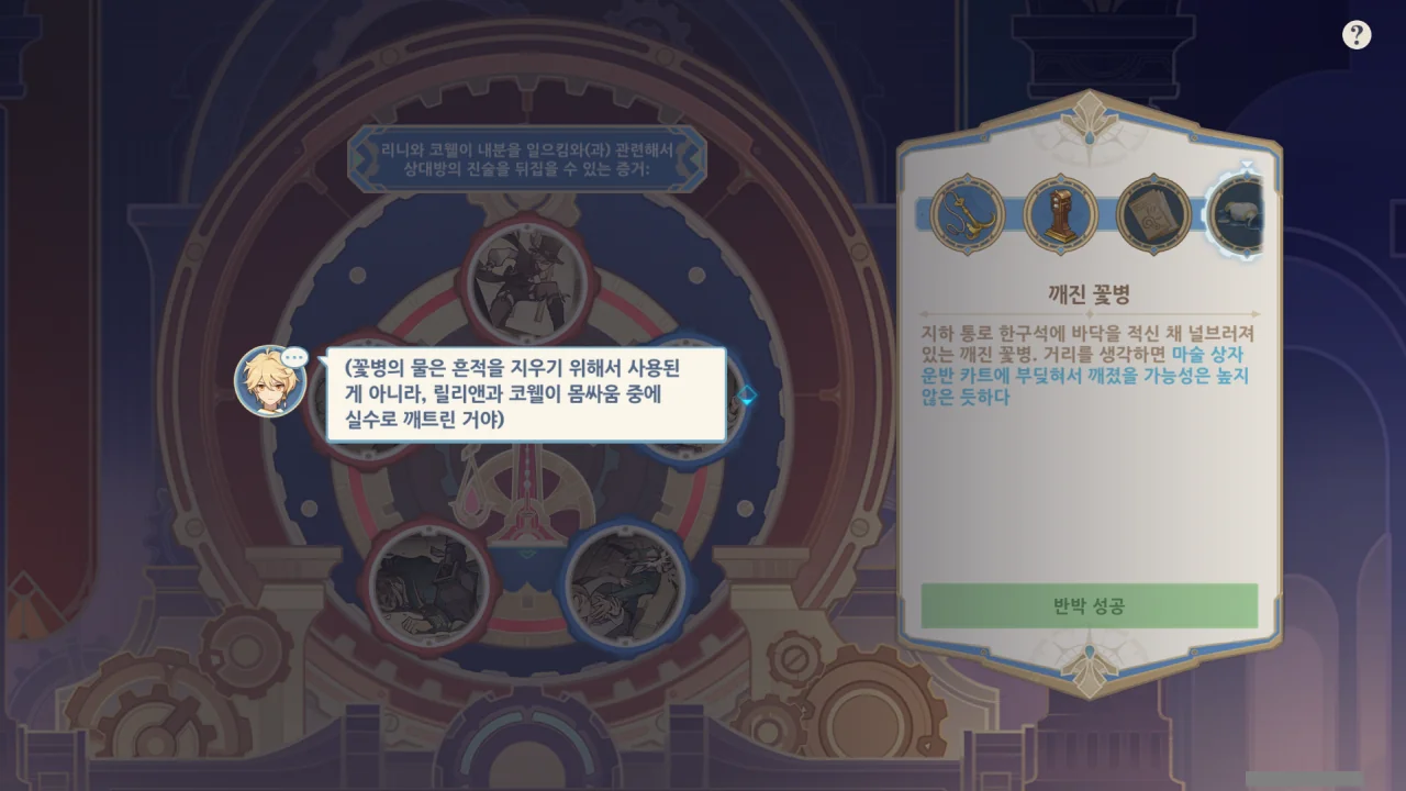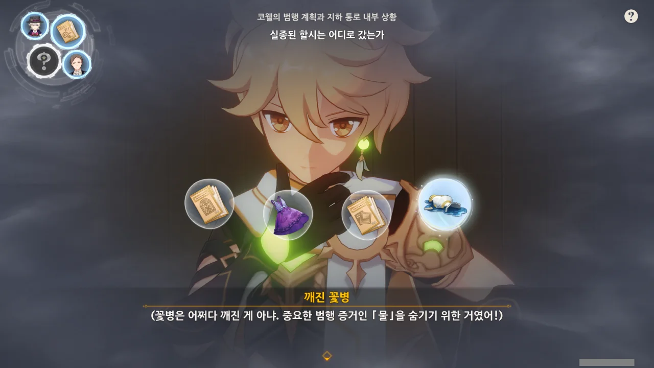 지금까지 수집한 증거 중, 깨진 꽃병과 바닥의 물은 상황 재구성에 제대로 쓰이지 못했다. 어쩌면 이 둘이 이 상황의 돌파구가 될 수 있을까?