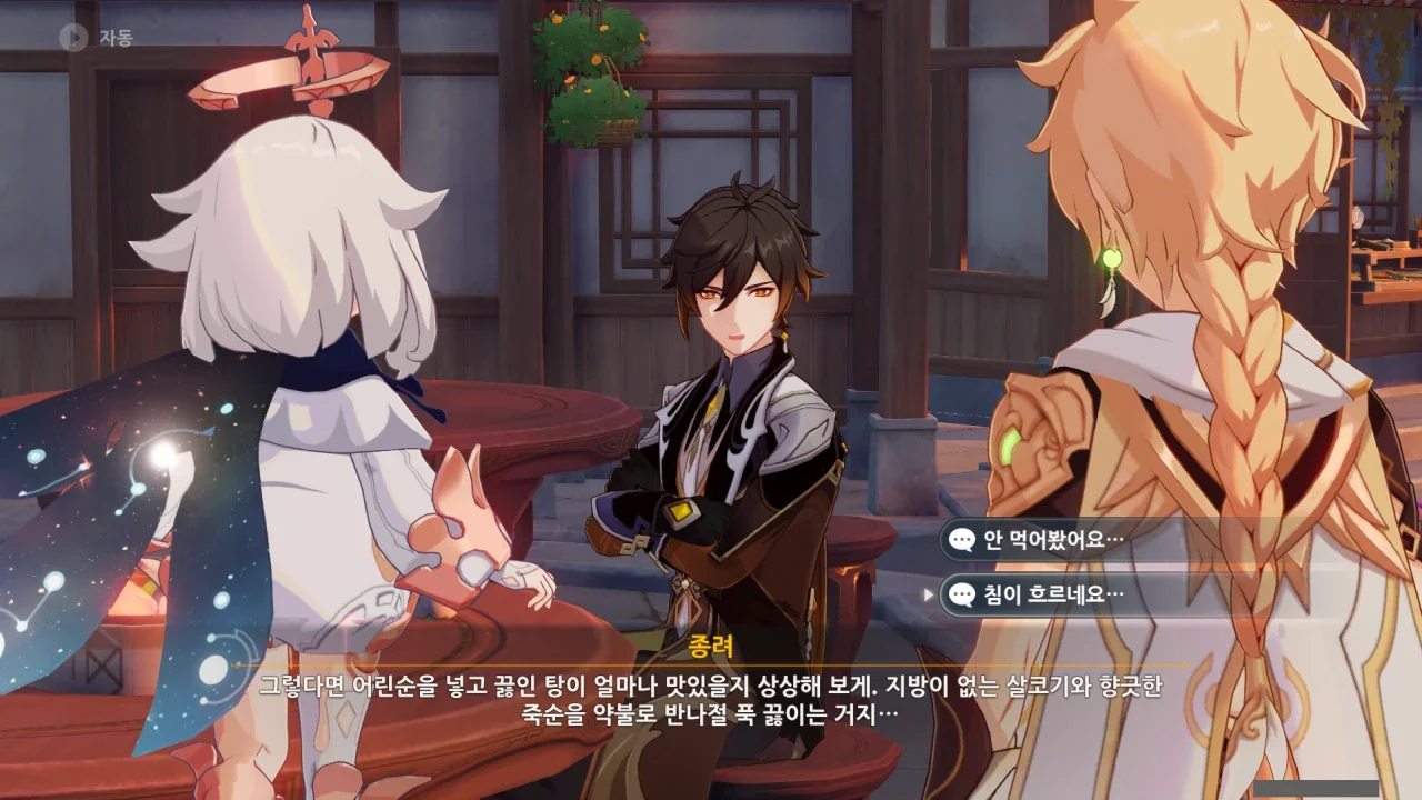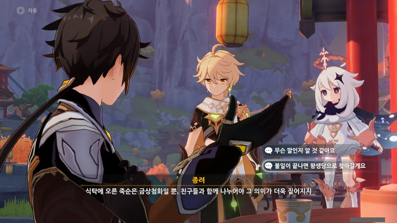 별다른 일정이 없다고 하자, 곧바로 '그렇다면'으로 시작해 음식 표현을 맛깔나게 함으로써 짬 때리기에 시동을 거는 종려와 거기에 홀라당 넘어가 눈을 반짝이는 페이몬.