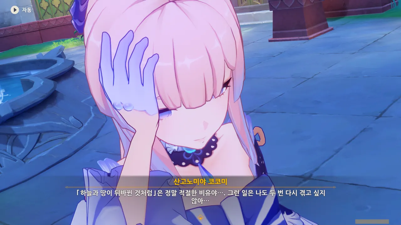 NPC들이 '하늘과 땅이 뒤바뀐 것처럼'이라고 말할 때, 거꾸로 된 화면을 180도 돌려 다시 정상 각도로 돌려놓는 연출이 공통적으로 나온다. 그게 코코미의 말처럼 '세상이 뒤집히는 느낌'인가 보다.