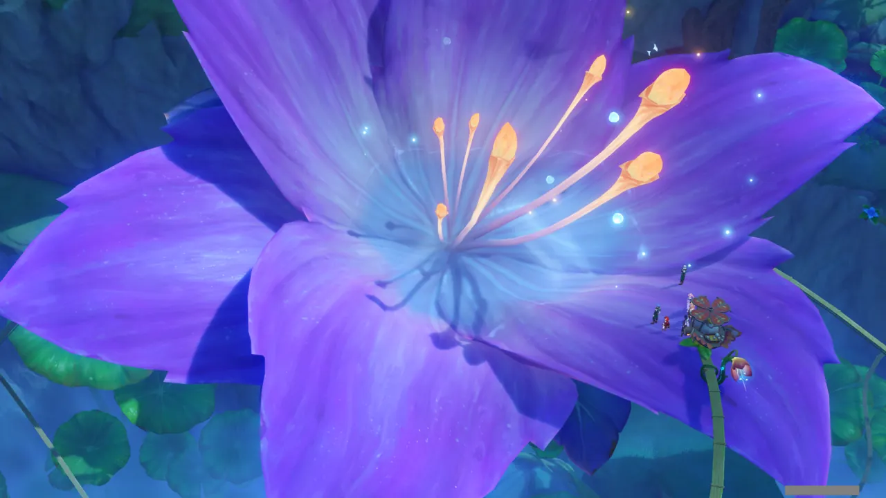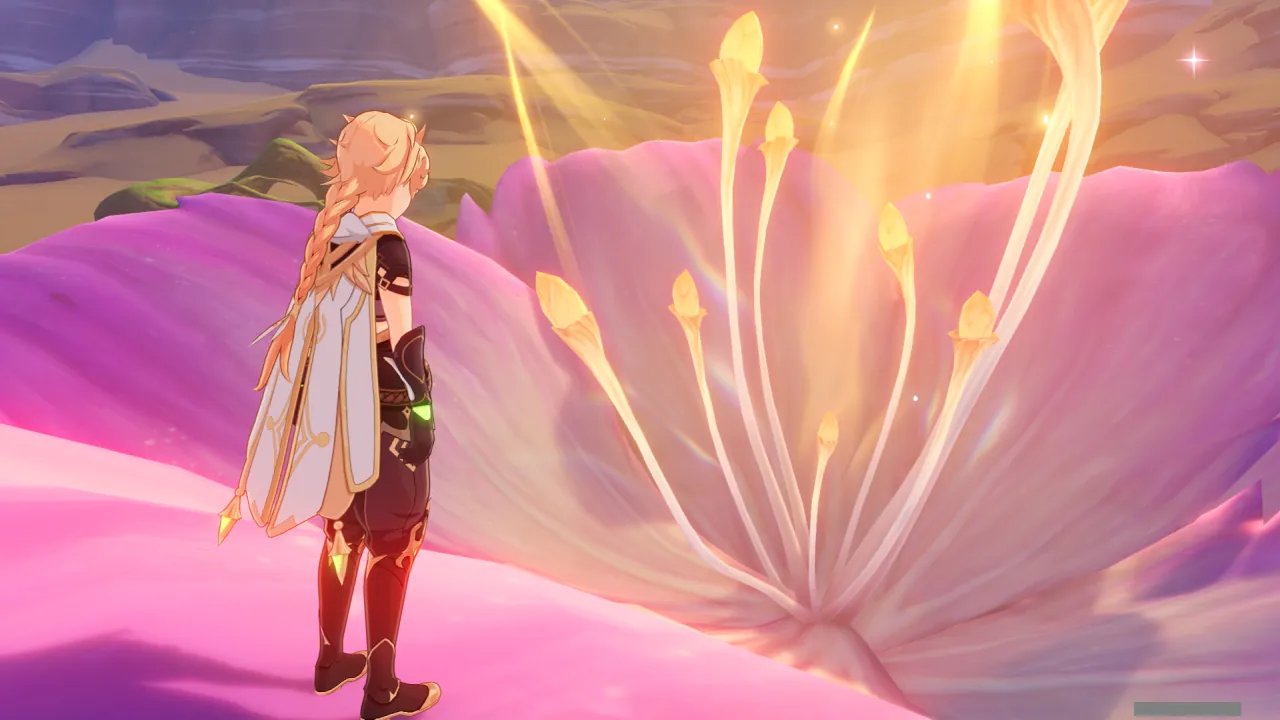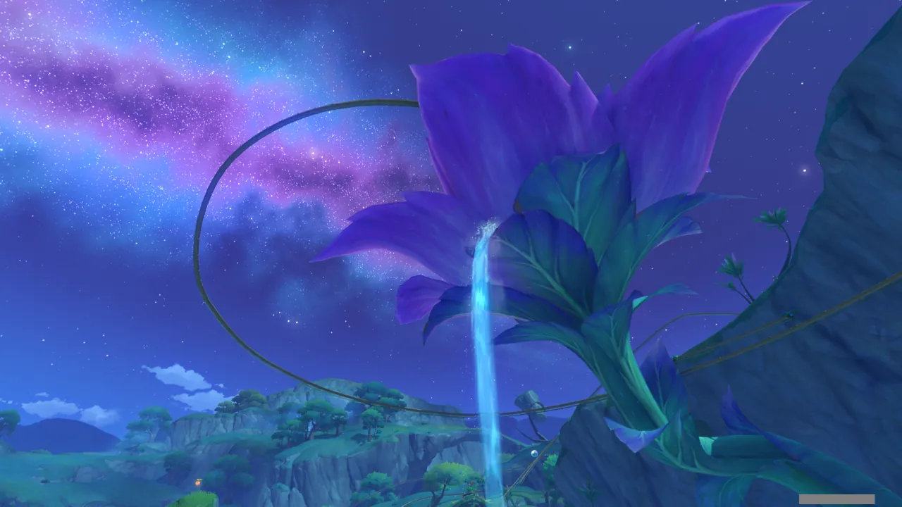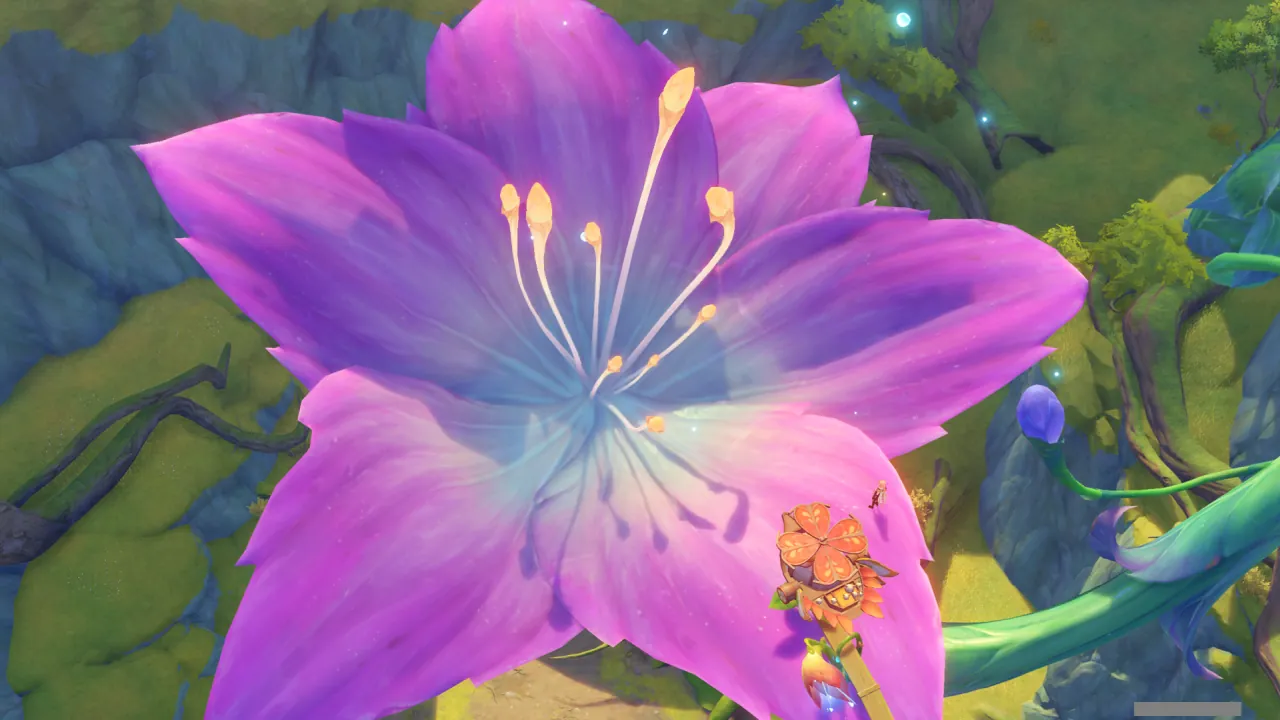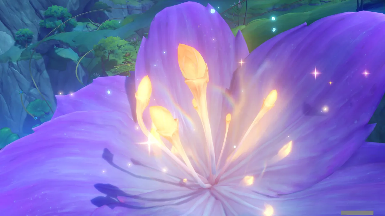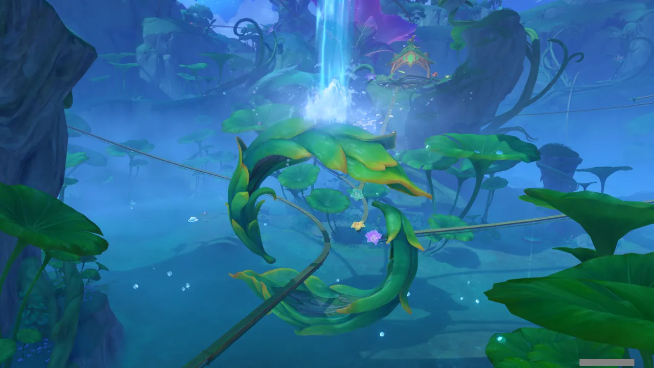 물의 환령이 꽃의 꽃술 부분을 빛내자, 꽃에 물이 고이더니 흘러넘쳐 밑에 있던 '미니 코어 휠'을 흠뻑 적신다.