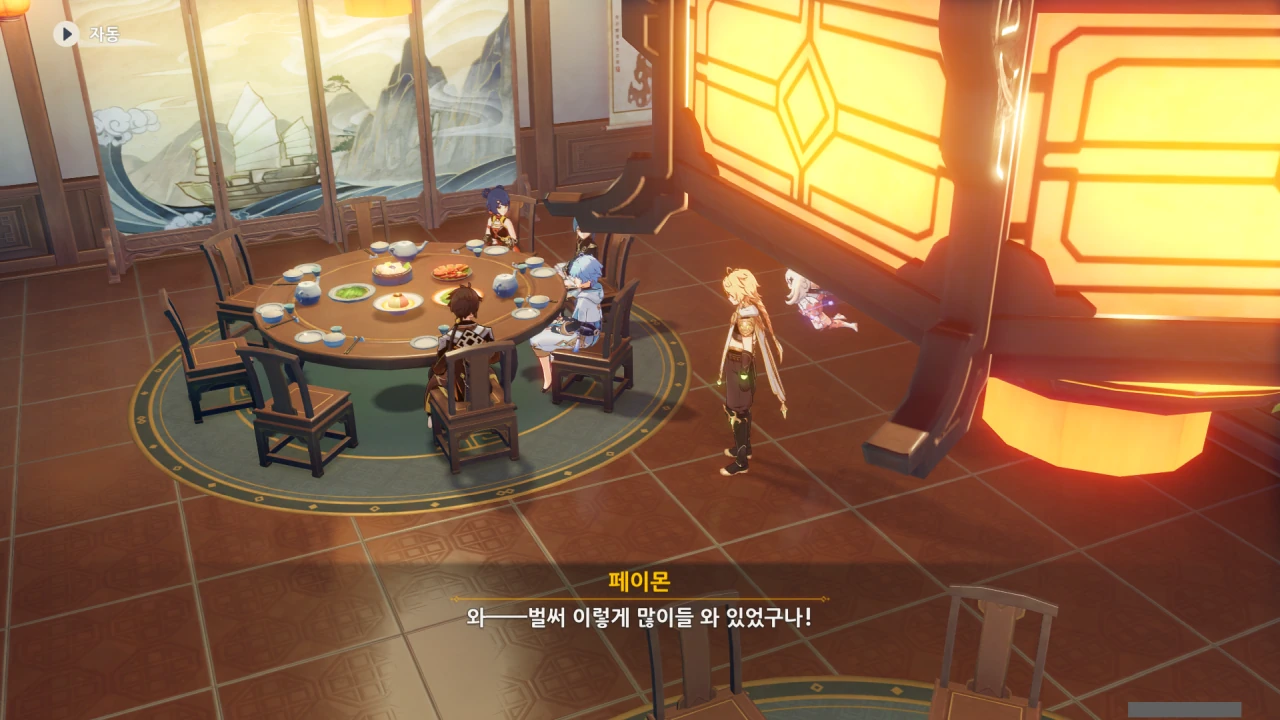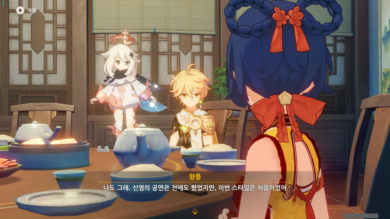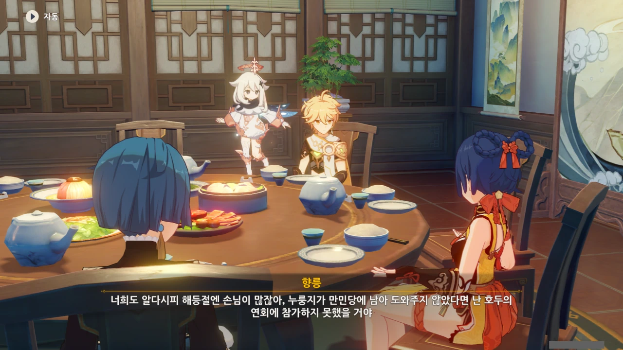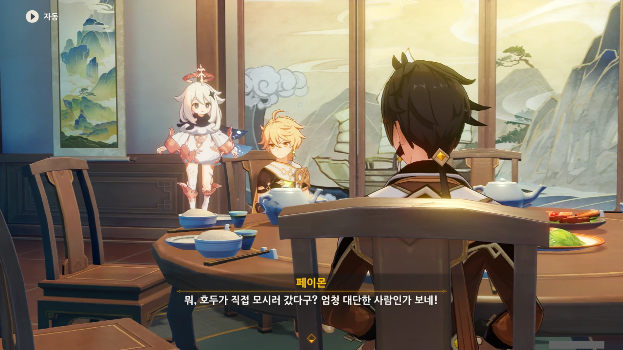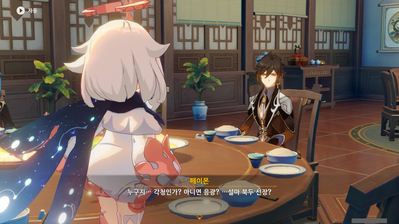 페이몬은 각청, 응광, 북두를 예상했지만, 아까 본 컷신의 내용에 따르면 저 셋은 응광의 초대로 응광과 따로 식사할 것이다.