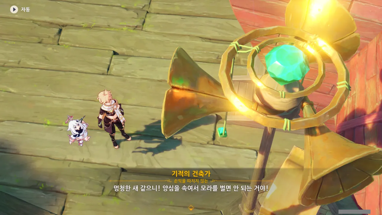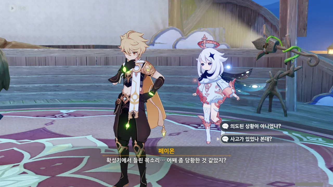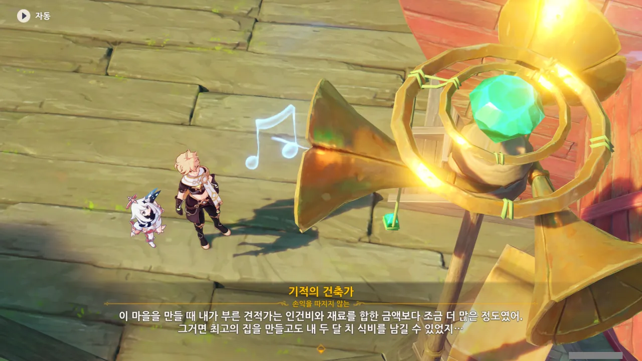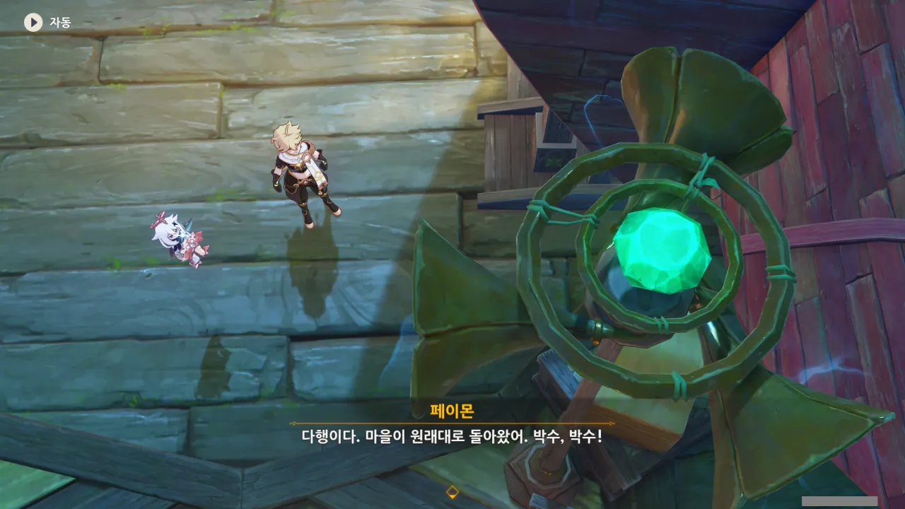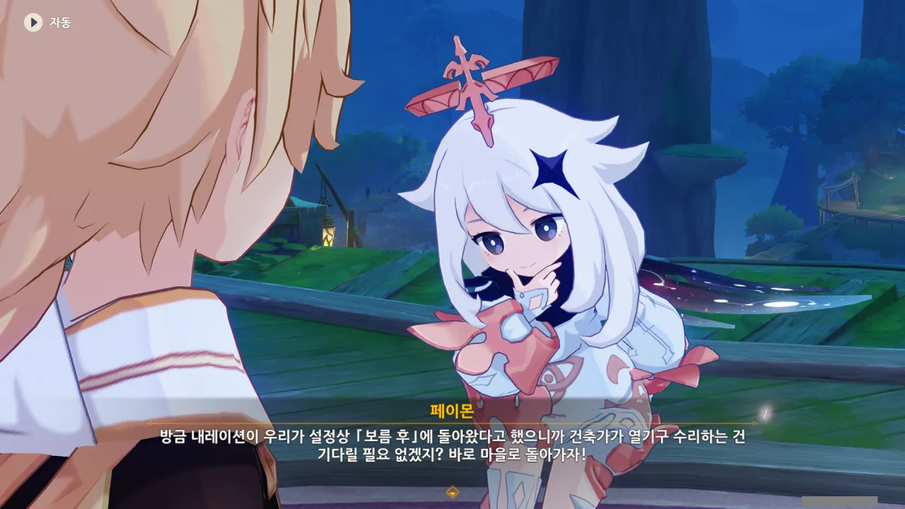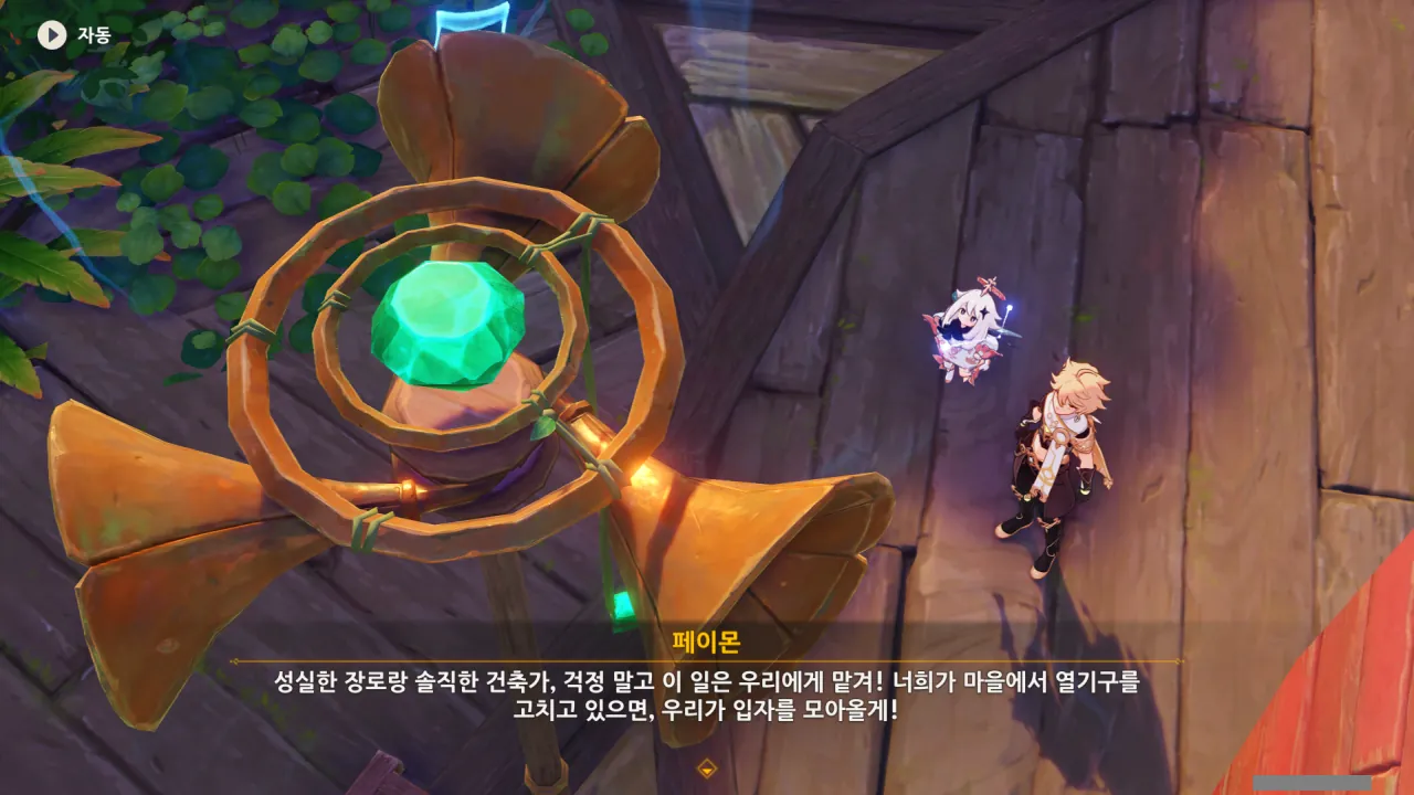 아하, 여기서 여행자와 페이몬이 등장한다. 처음엔 여행자가 건축가 역할을 맡을 줄로 예상했는데, 이번 연극에서 여행자와 페이몬은 '마을의 떠오르는 샛별", '마을 중 제일가는 파수꾼'의 역할을 맡는다.
