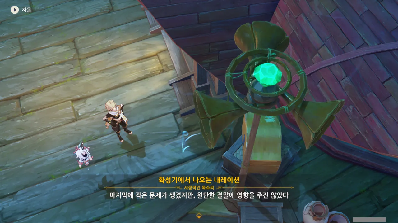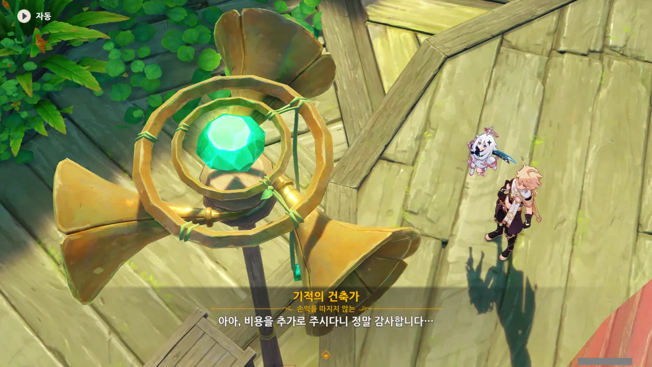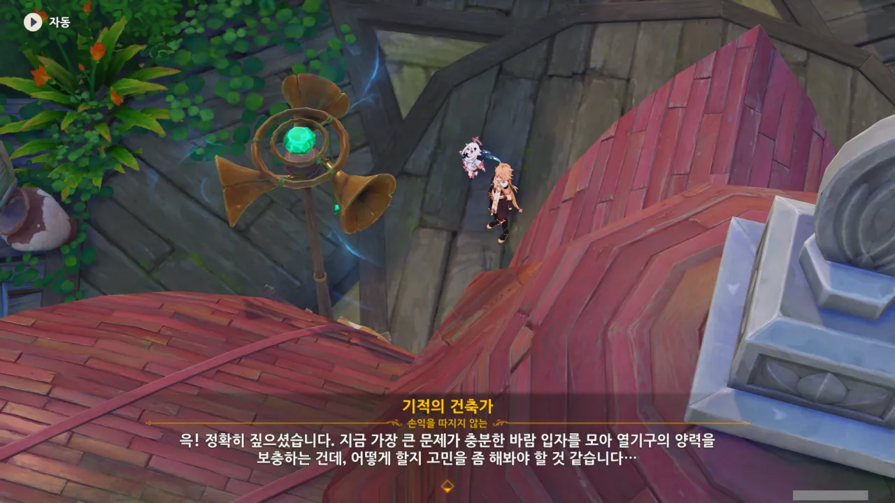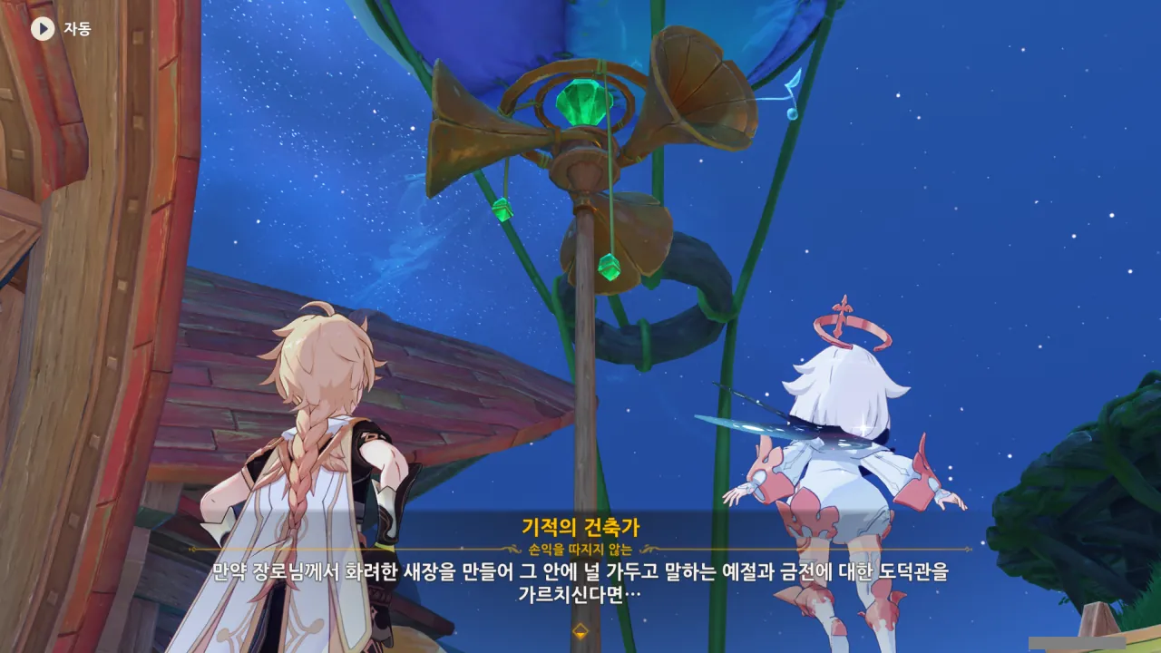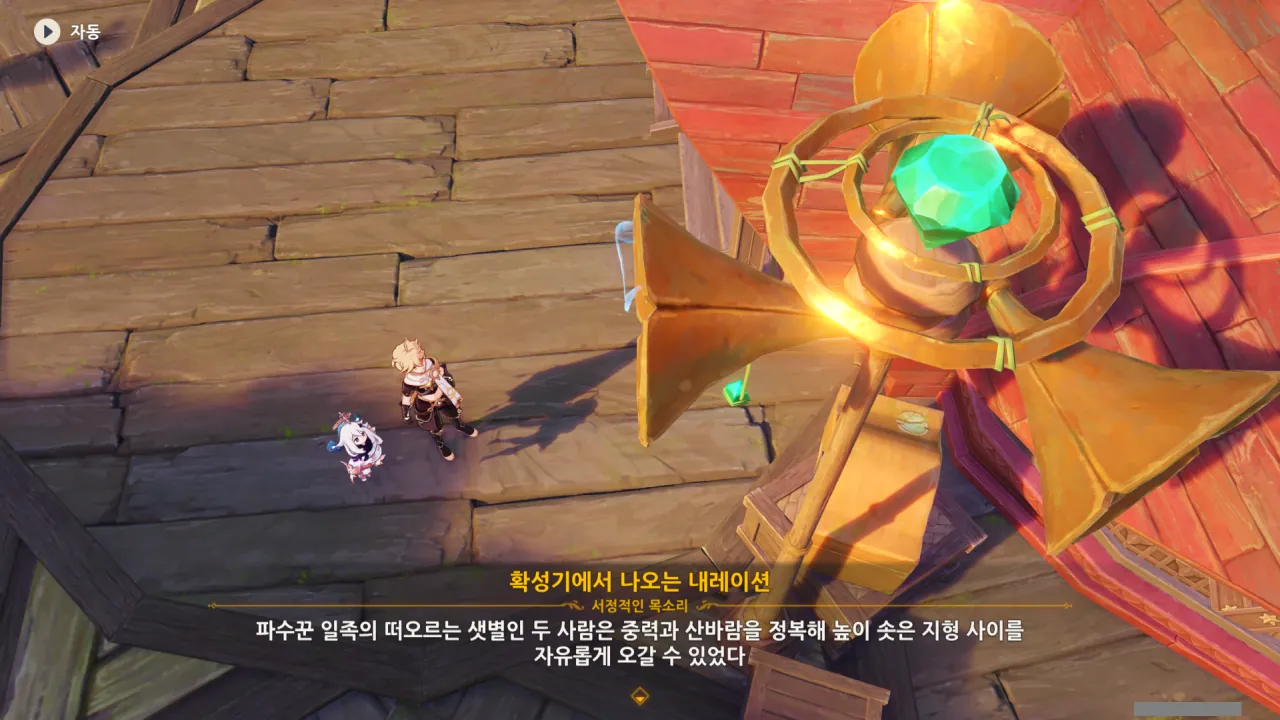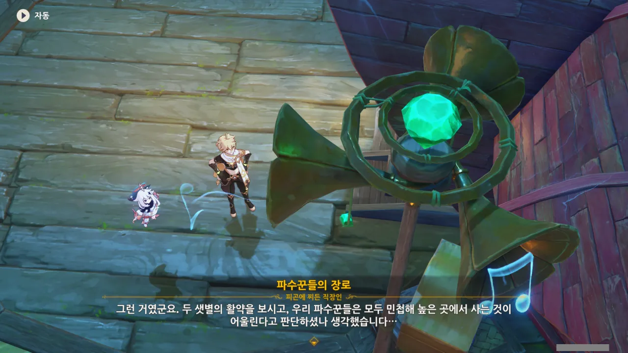 아하, 여기서 여행자와 페이몬이 등장한다. 처음엔 여행자가 건축가 역할을 맡을 줄로 예상했는데, 이번 연극에서 여행자와 페이몬은 '마을의 떠오르는 샛별", '마을 중 제일가는 파수꾼'의 역할을 맡는다.