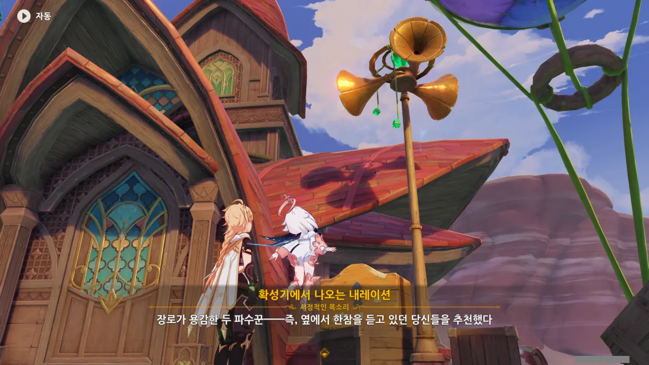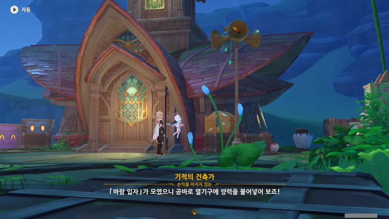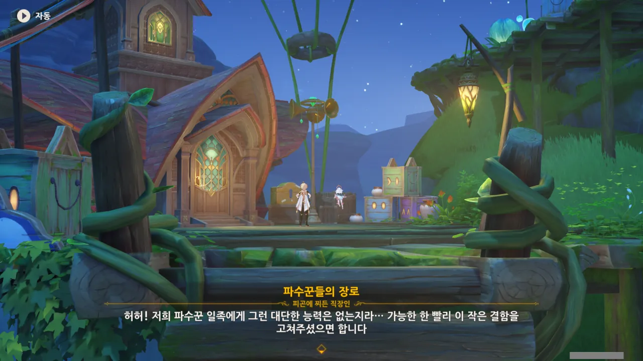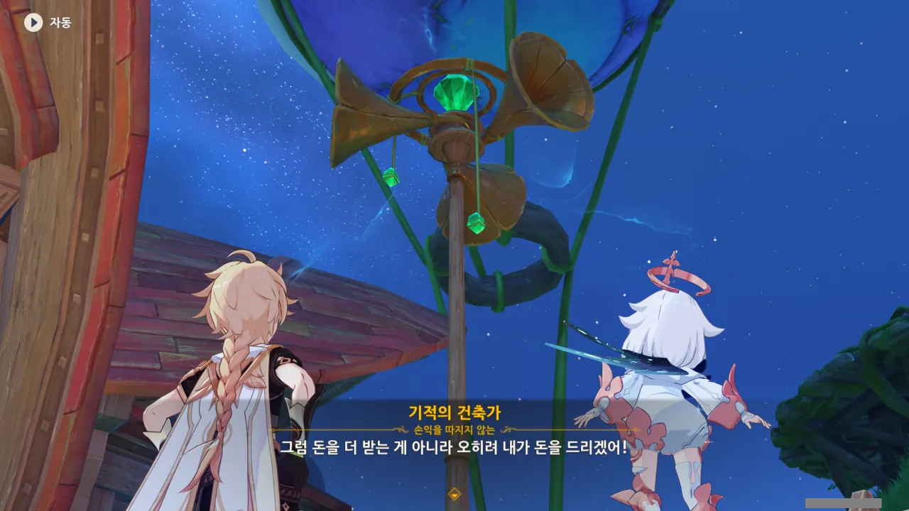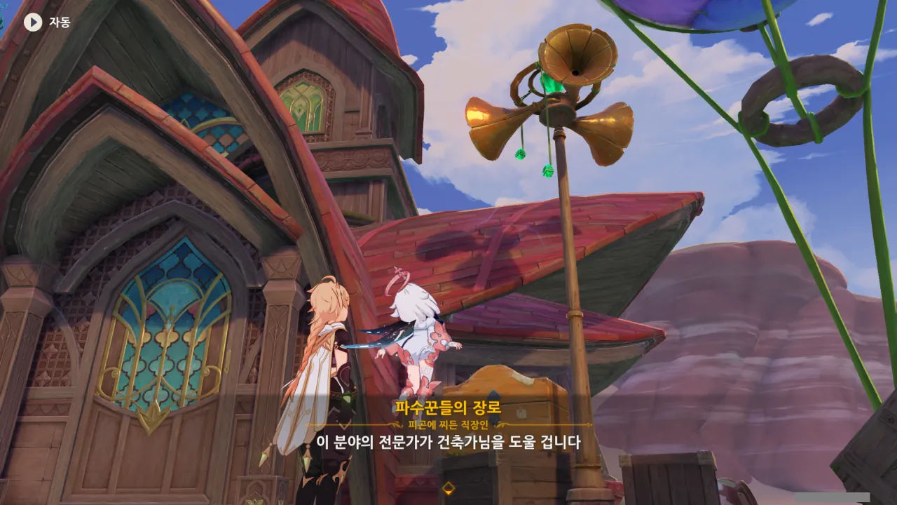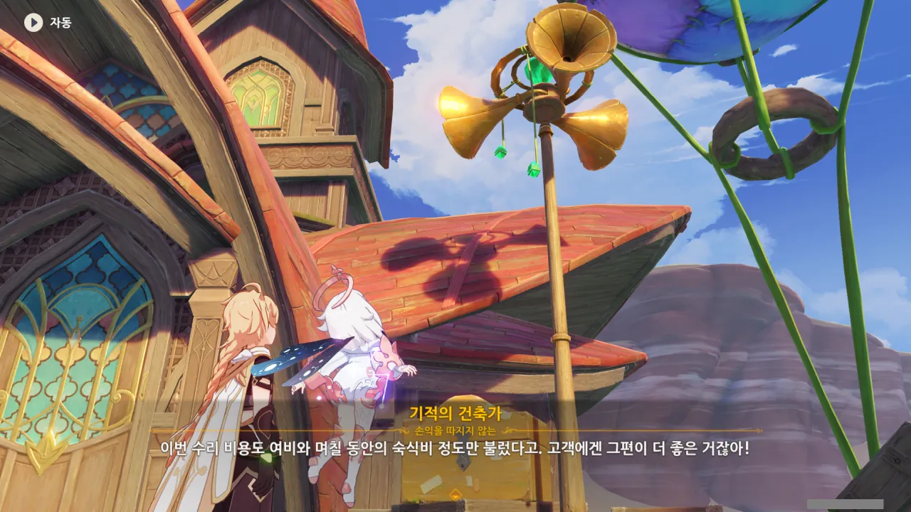 아하, 여기서 여행자와 페이몬이 등장한다. 처음엔 여행자가 건축가 역할을 맡을 줄로 예상했는데, 이번 연극에서 여행자와 페이몬은 '마을의 떠오르는 샛별", '마을 중 제일가는 파수꾼'의 역할을 맡는다.