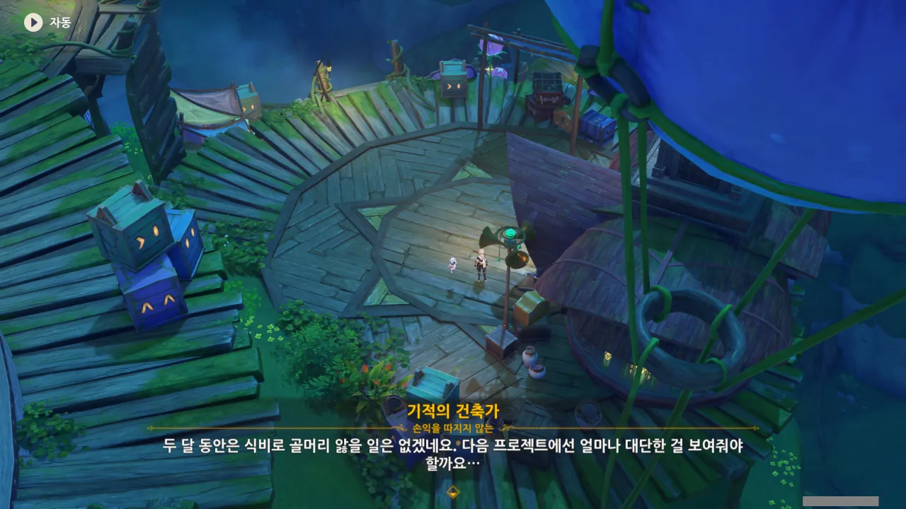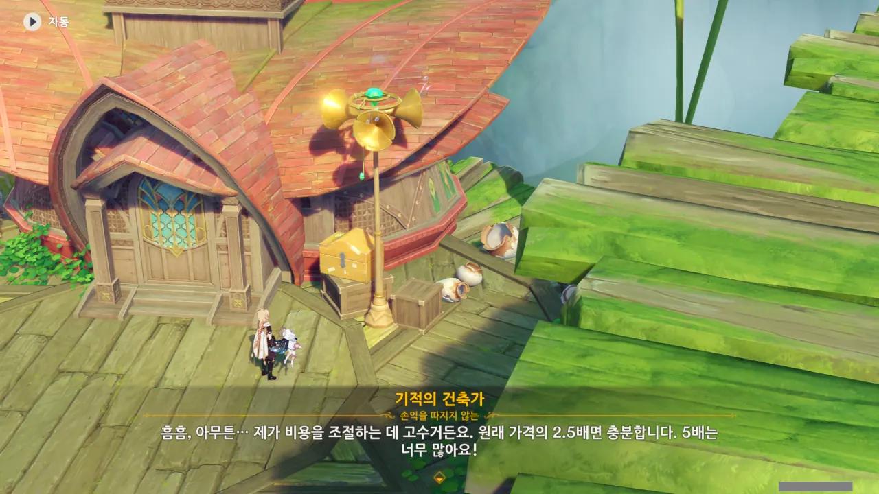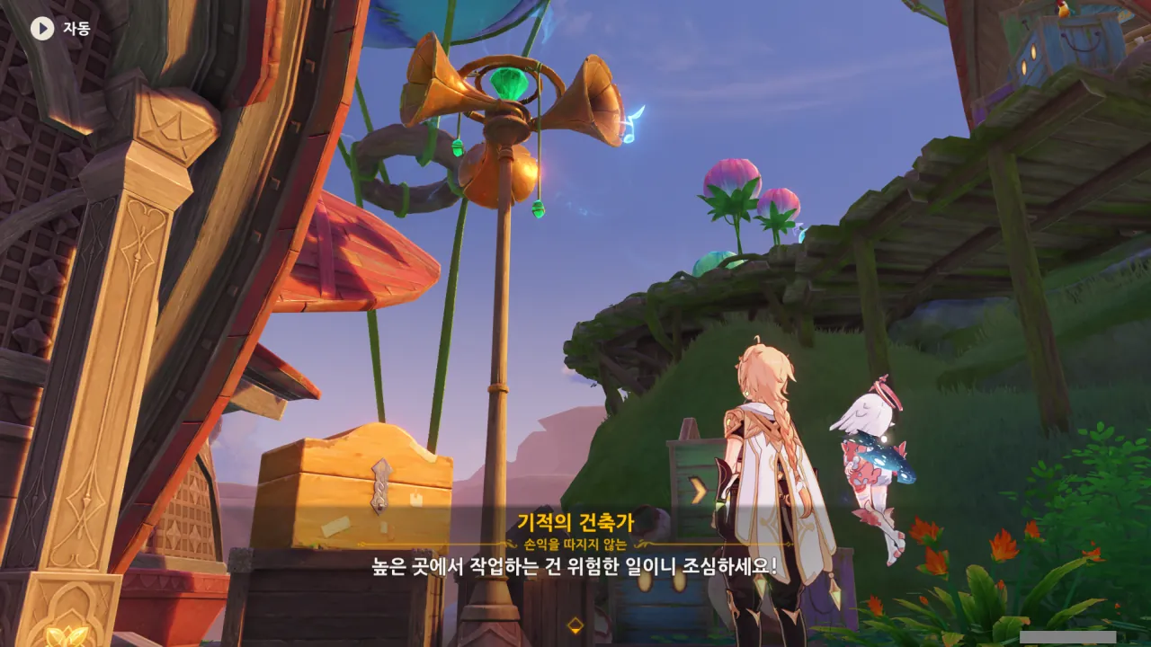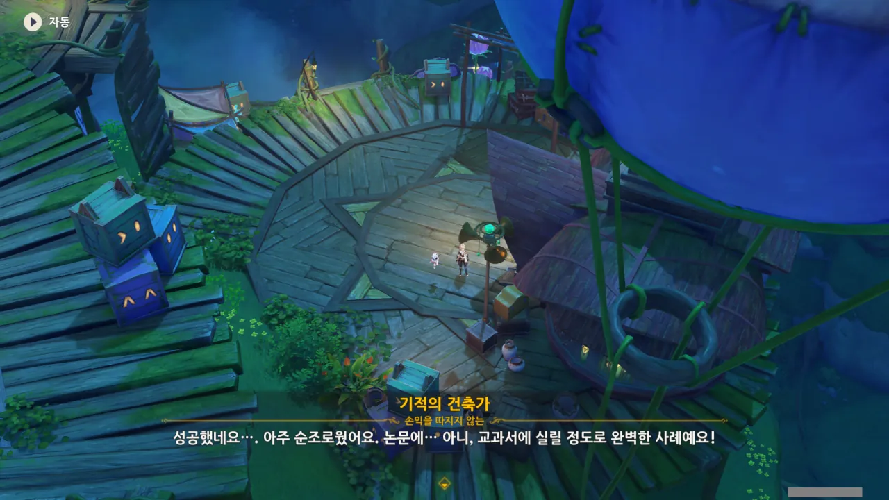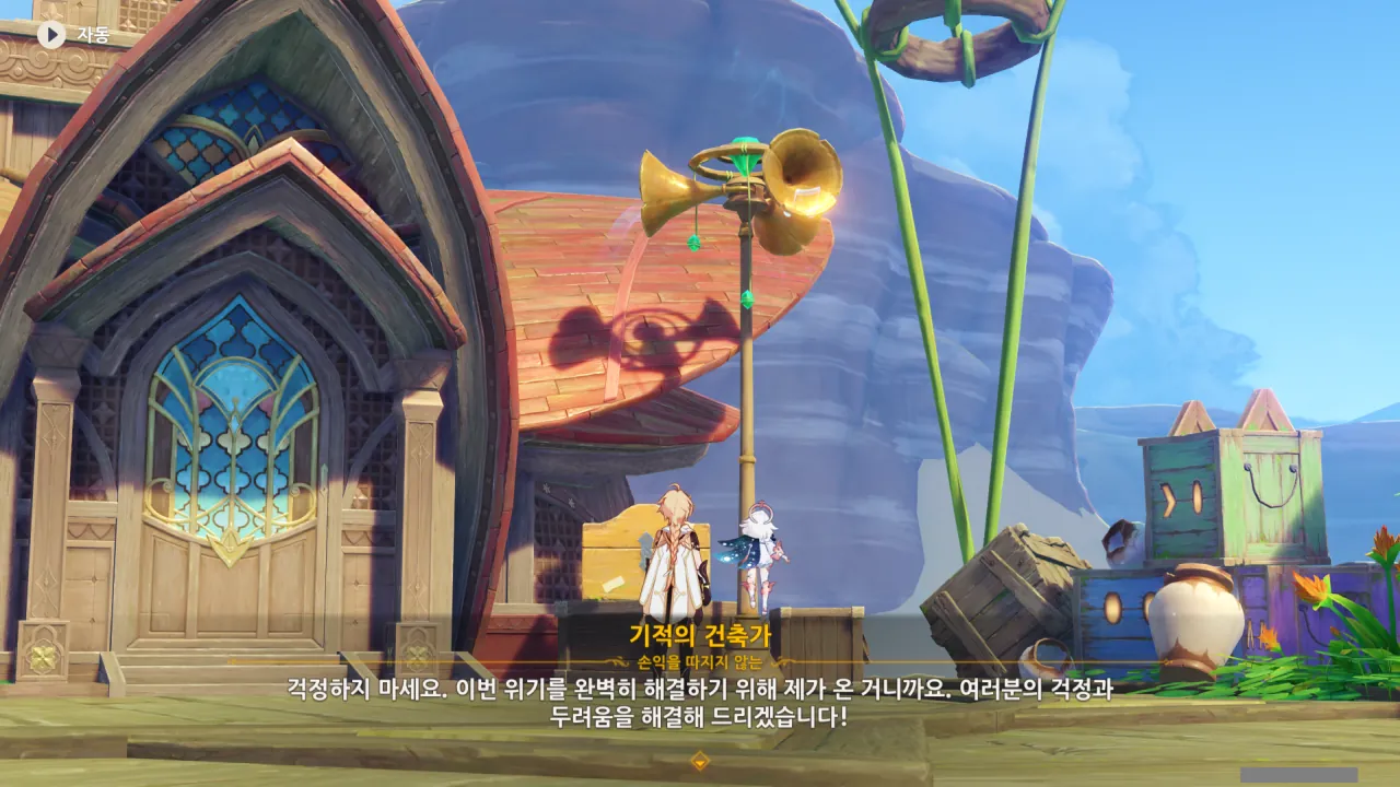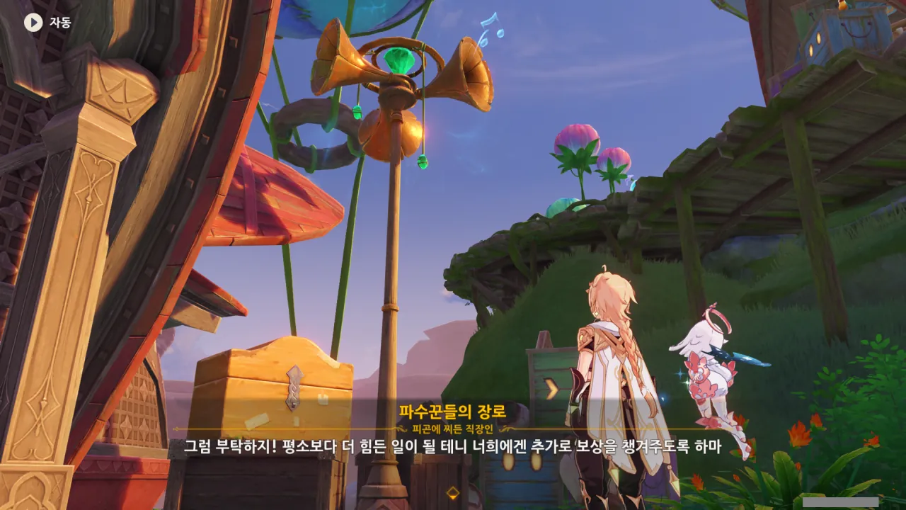 아하, 여기서 여행자와 페이몬이 등장한다. 처음엔 여행자가 건축가 역할을 맡을 줄로 예상했는데, 이번 연극에서 여행자와 페이몬은 '마을의 떠오르는 샛별", '마을 중 제일가는 파수꾼'의 역할을 맡는다.