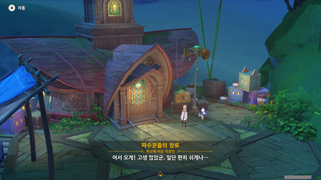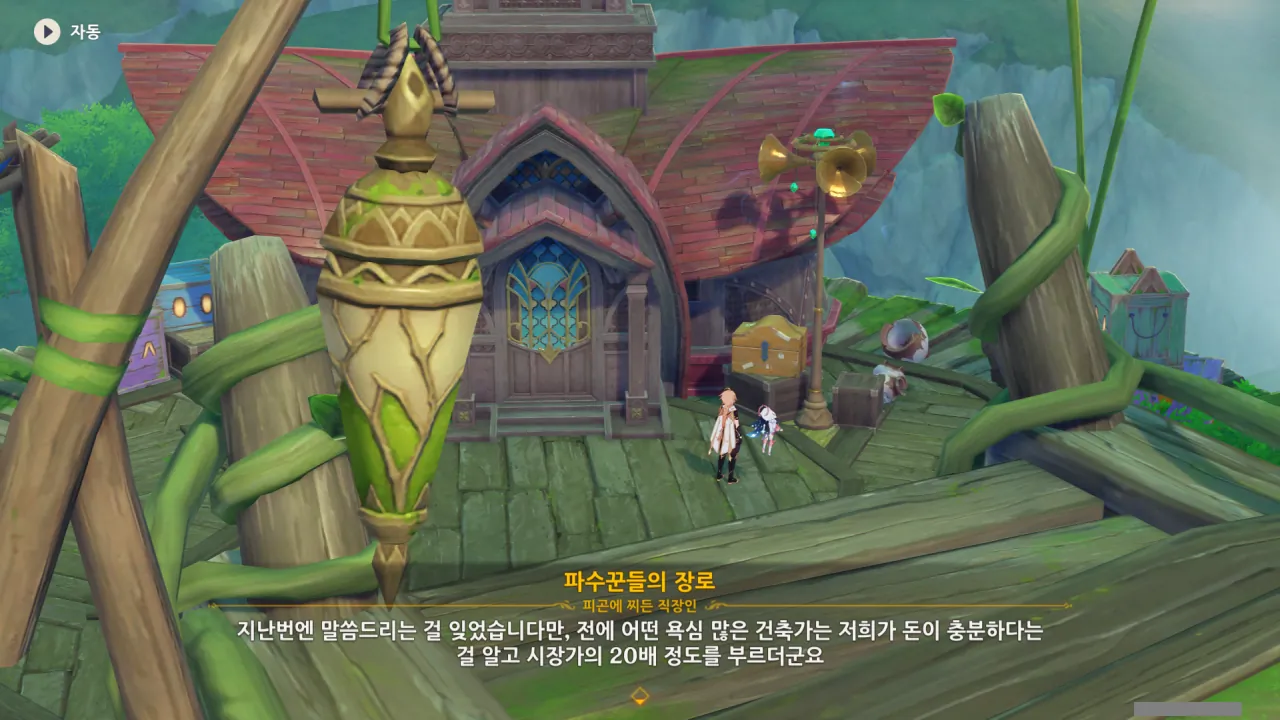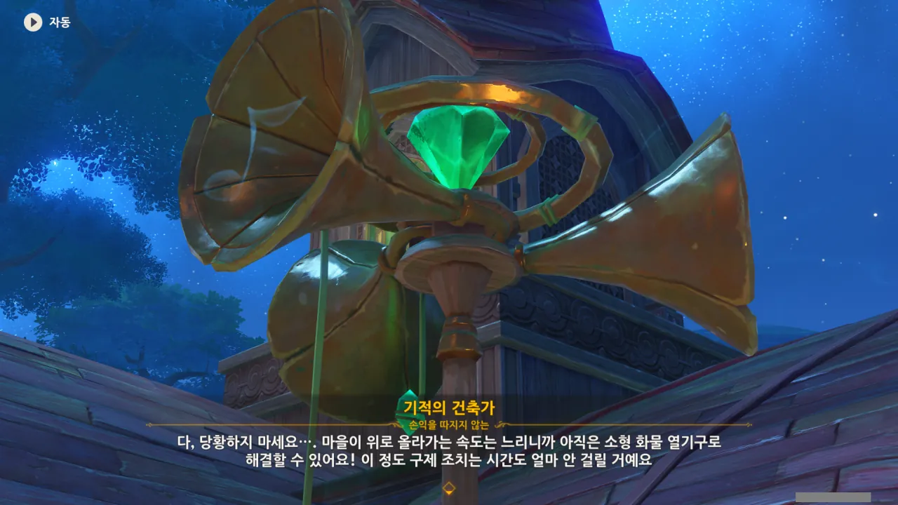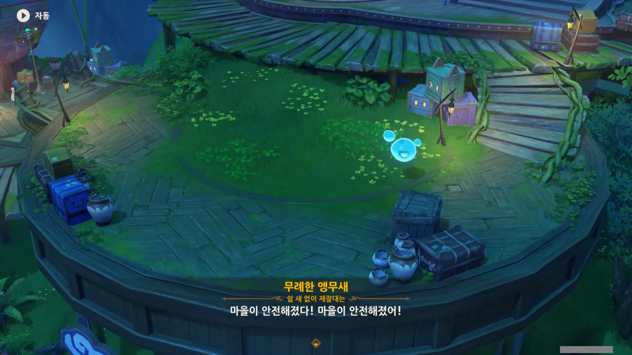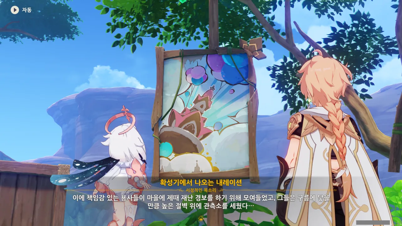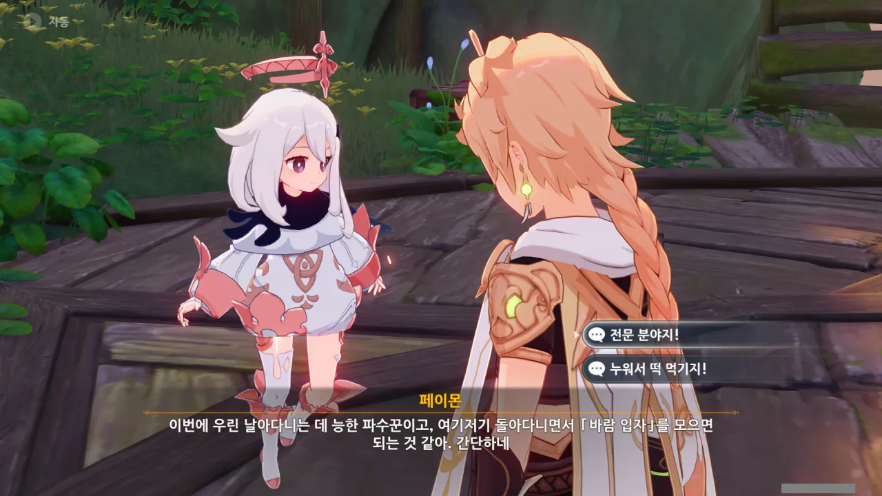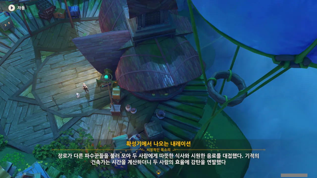 아하, 여기서 여행자와 페이몬이 등장한다. 처음엔 여행자가 건축가 역할을 맡을 줄로 예상했는데, 이번 연극에서 여행자와 페이몬은 '마을의 떠오르는 샛별", '마을 중 제일가는 파수꾼'의 역할을 맡는다.