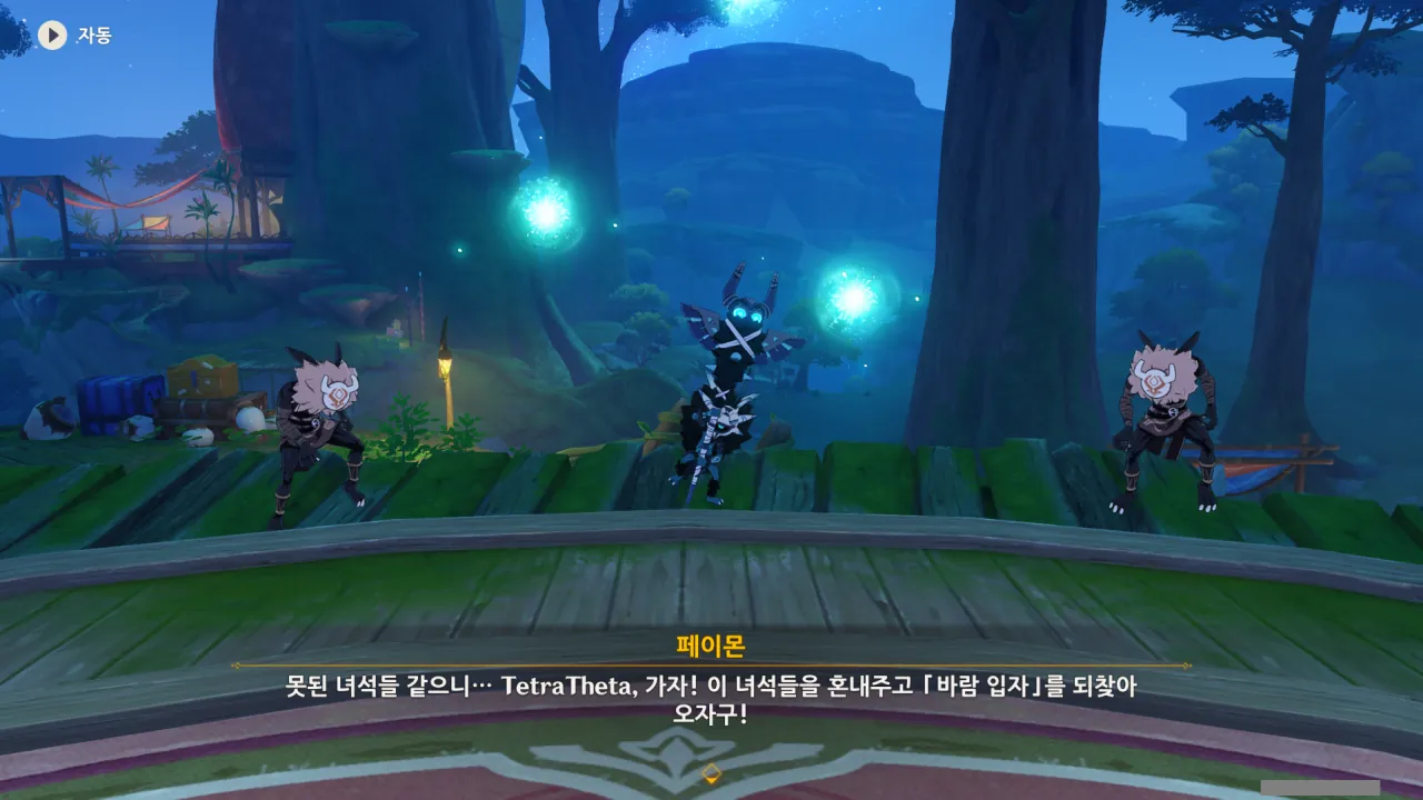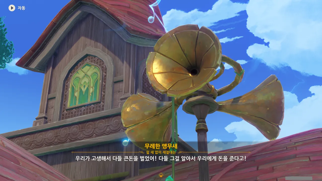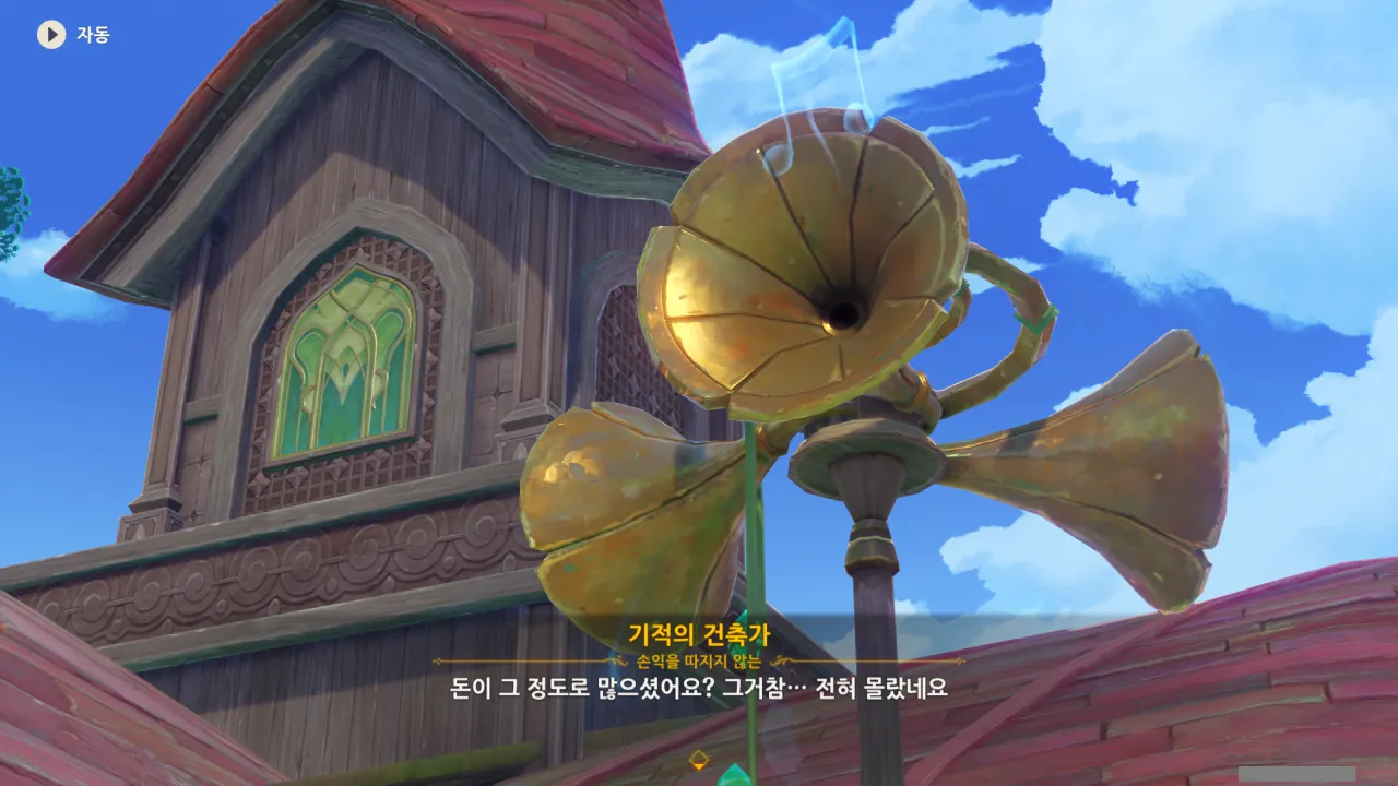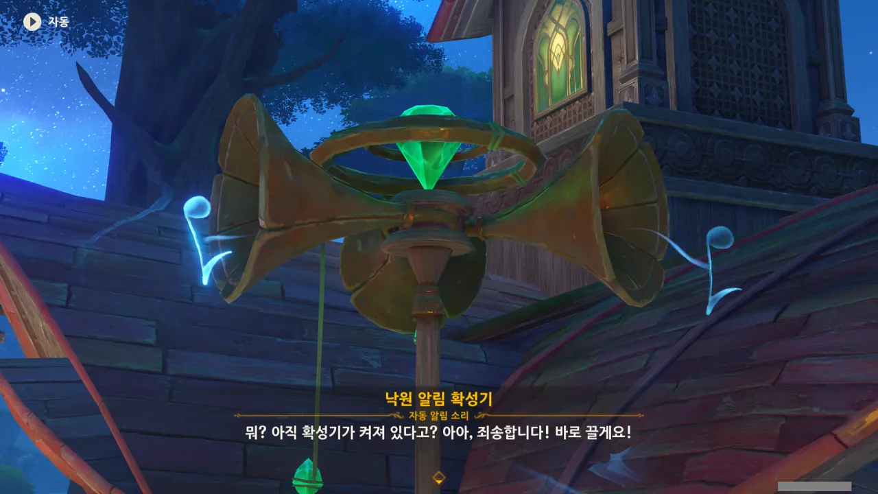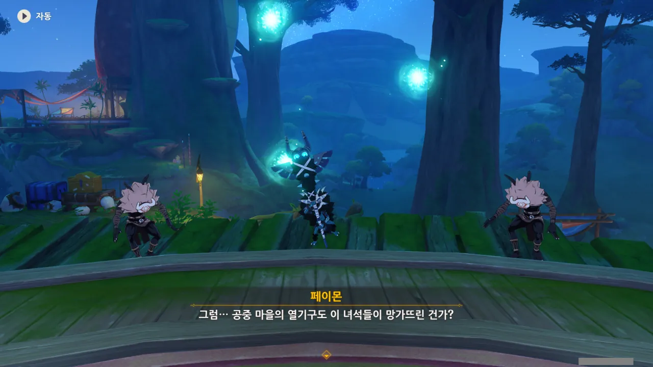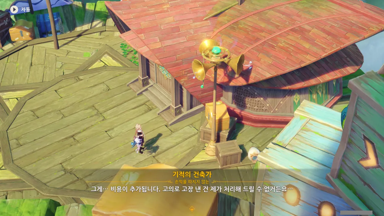 아하, 여기서 여행자와 페이몬이 등장한다. 처음엔 여행자가 건축가 역할을 맡을 줄로 예상했는데, 이번 연극에서 여행자와 페이몬은 '마을의 떠오르는 샛별", '마을 중 제일가는 파수꾼'의 역할을 맡는다.
