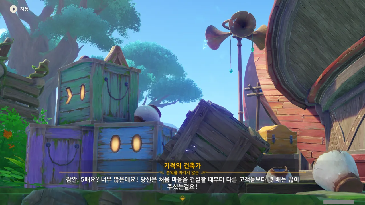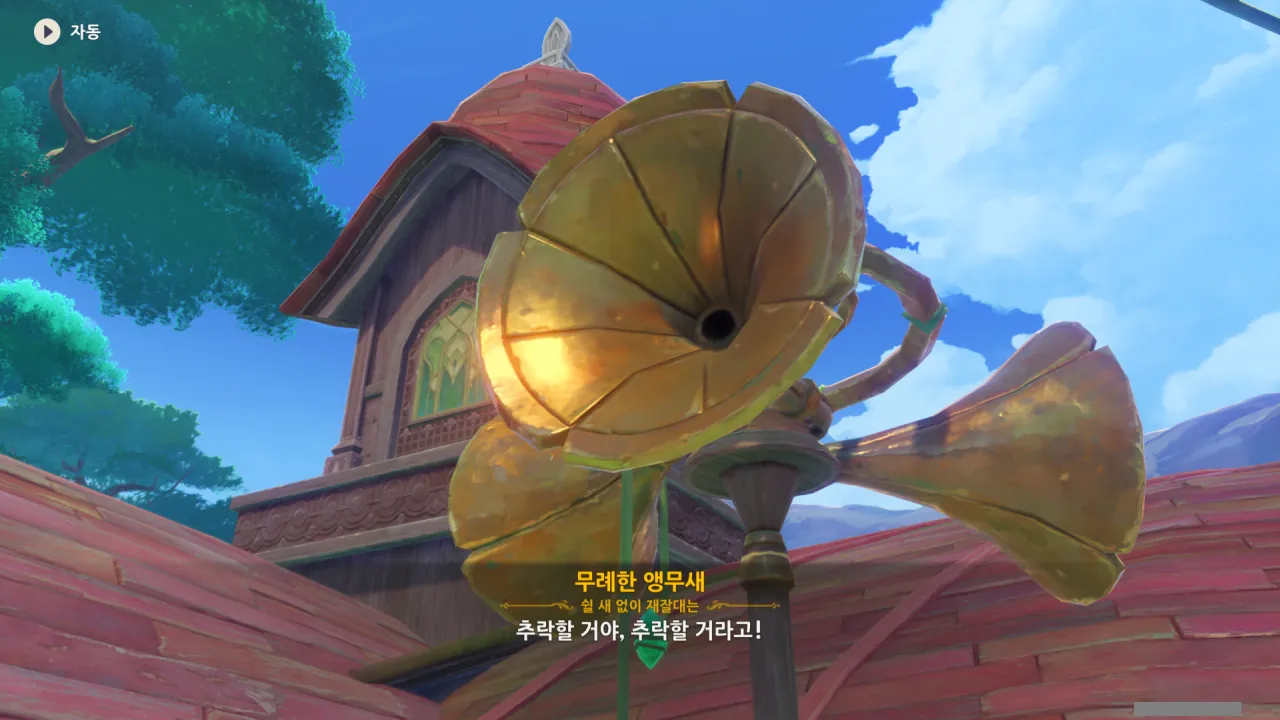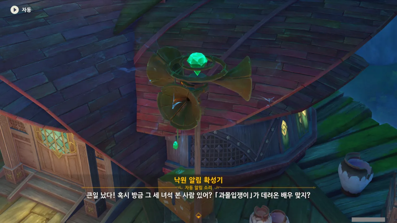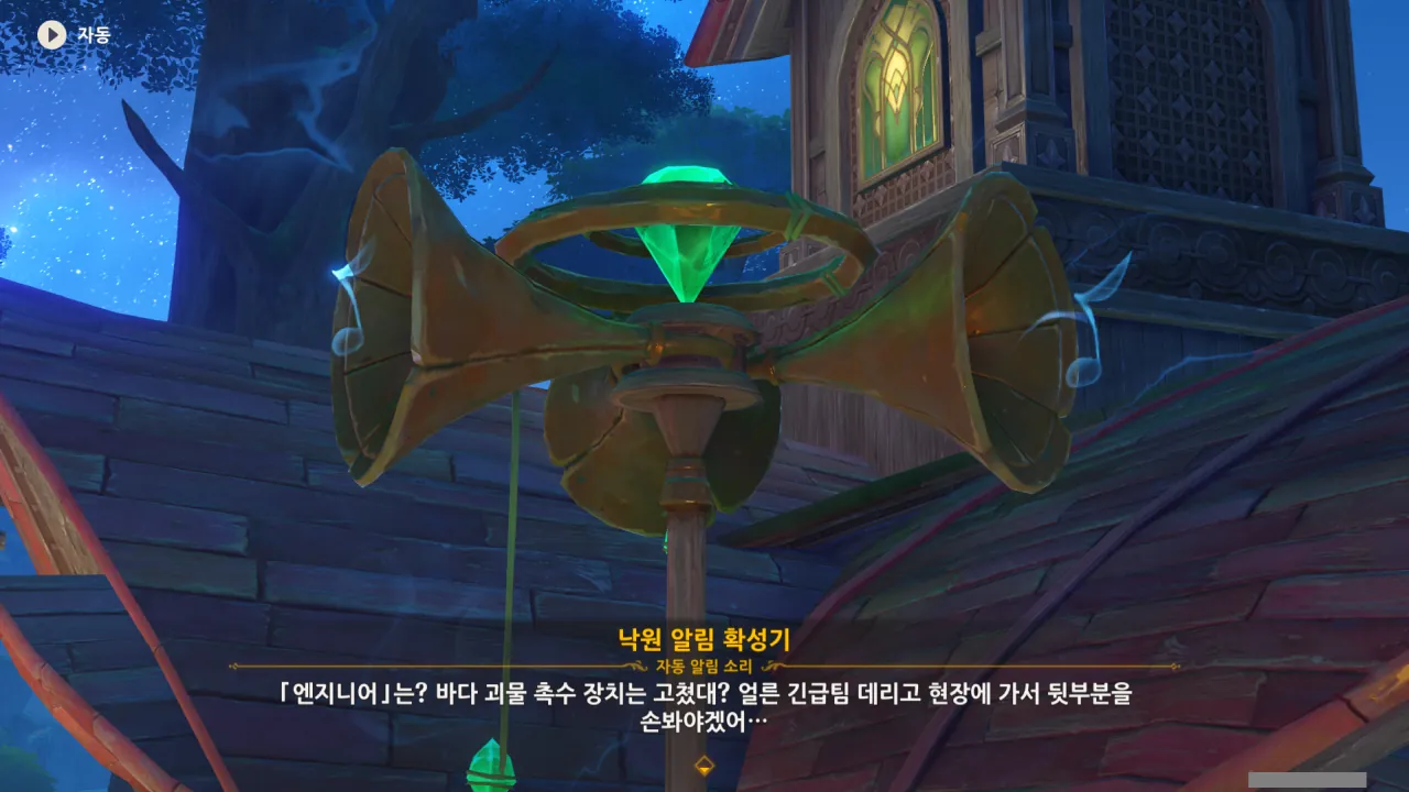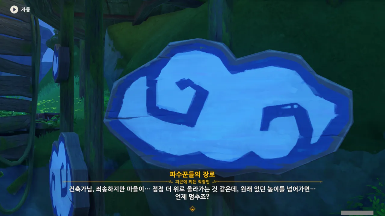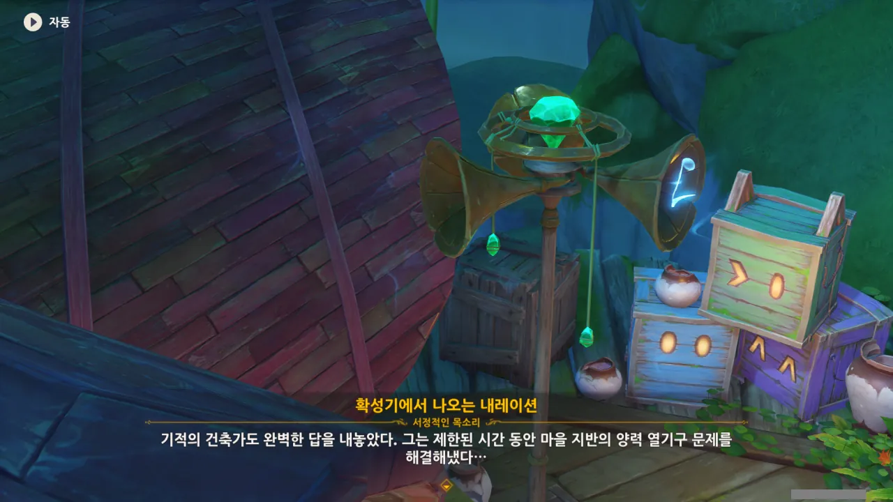 아하, 여기서 여행자와 페이몬이 등장한다. 처음엔 여행자가 건축가 역할을 맡을 줄로 예상했는데, 이번 연극에서 여행자와 페이몬은 '마을의 떠오르는 샛별", '마을 중 제일가는 파수꾼'의 역할을 맡는다.