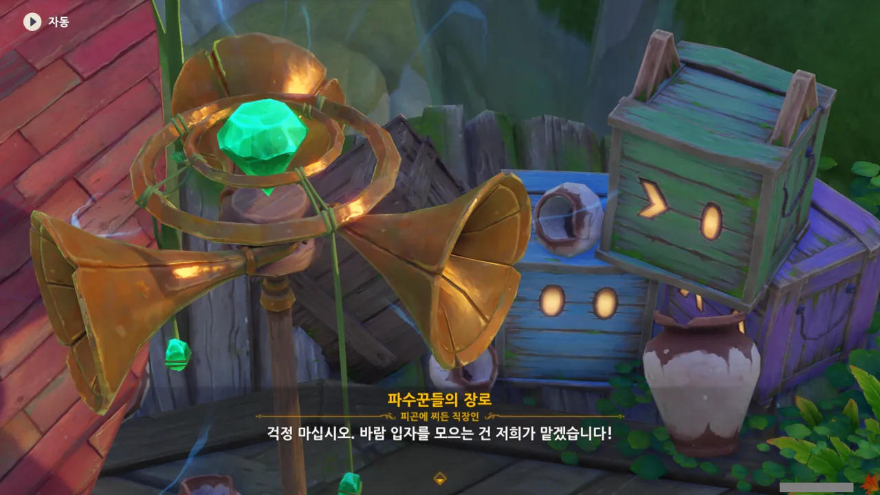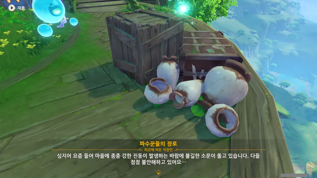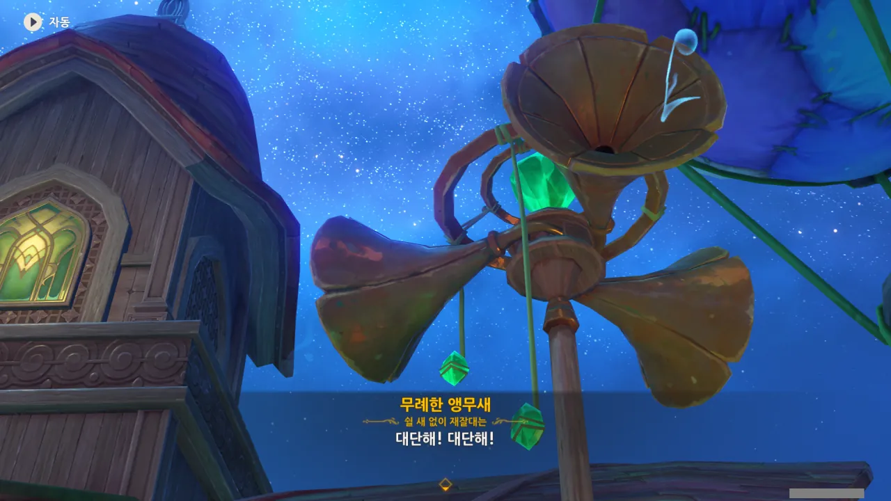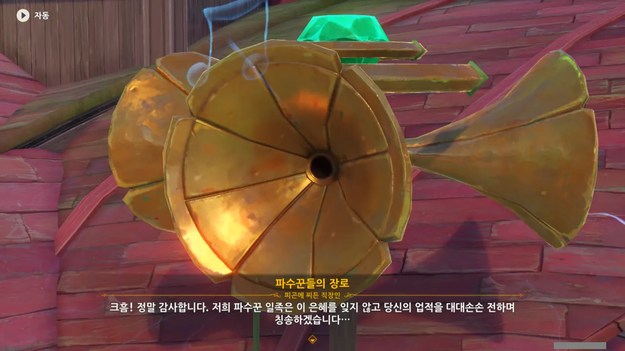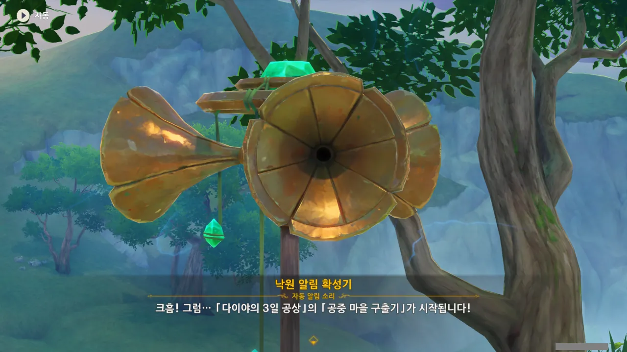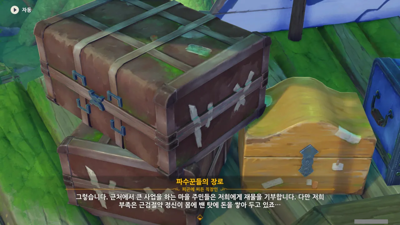 아하, 여기서 여행자와 페이몬이 등장한다. 처음엔 여행자가 건축가 역할을 맡을 줄로 예상했는데, 이번 연극에서 여행자와 페이몬은 '마을의 떠오르는 샛별", '마을 중 제일가는 파수꾼'의 역할을 맡는다.