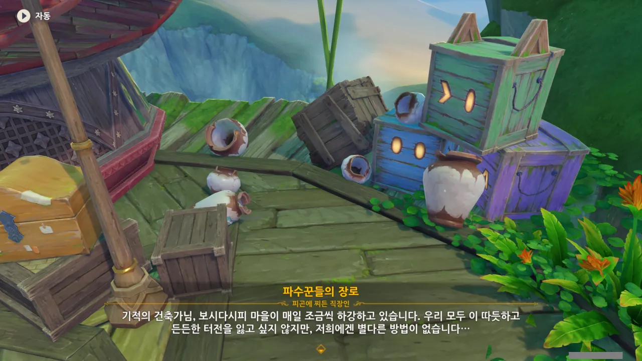 절벽 위에 살고 있으니, 물자 운송이 어렵다는 건 충분히 이해할 수 있다. 하지만 집이 왜 망가진단 말인가? 설마 폭풍 때문인가? 홍수가 절벽 위까지 올라오진 않을 테고…