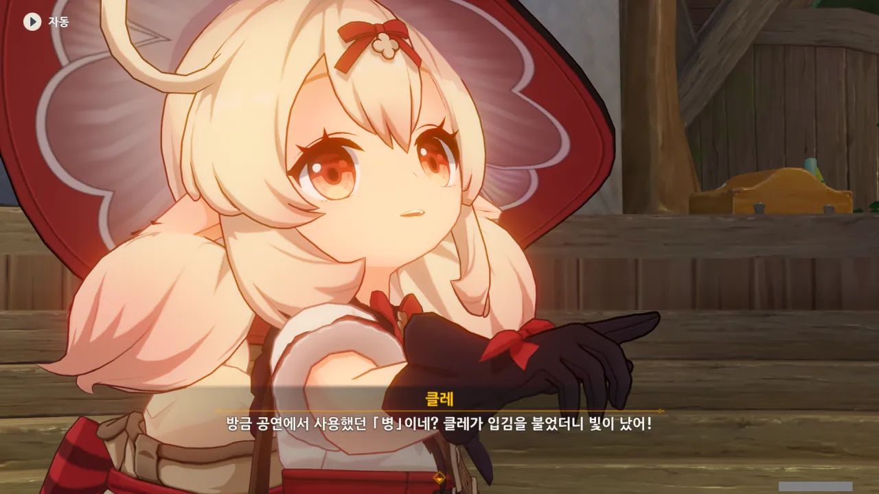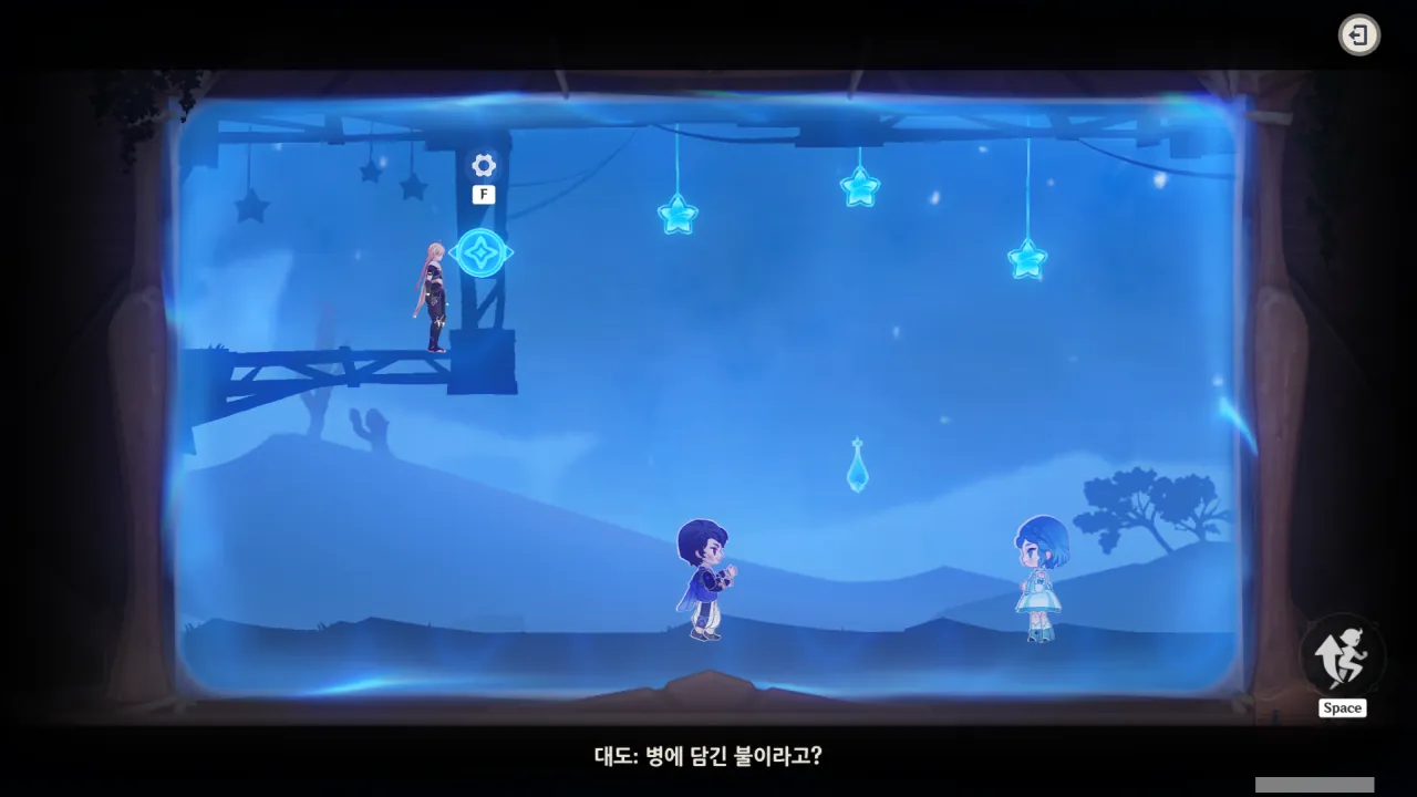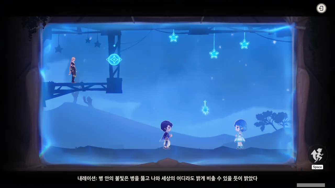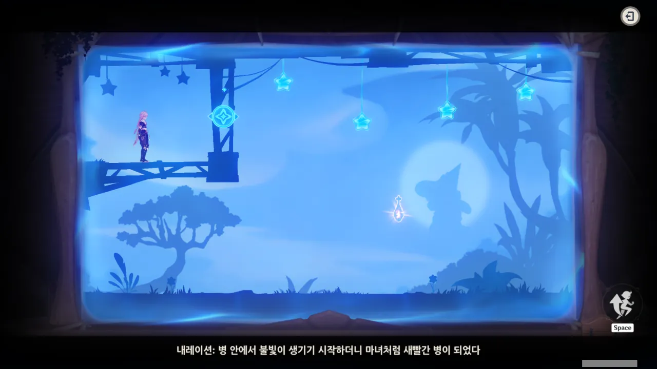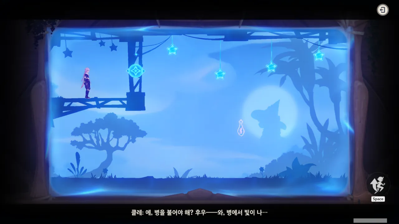 이런 걸 인터랙티브 연극이라 해야 하나? 클레가 병에 바람을 불어넣자, 정말로 병에서 빛이 난다.