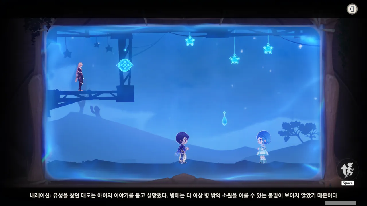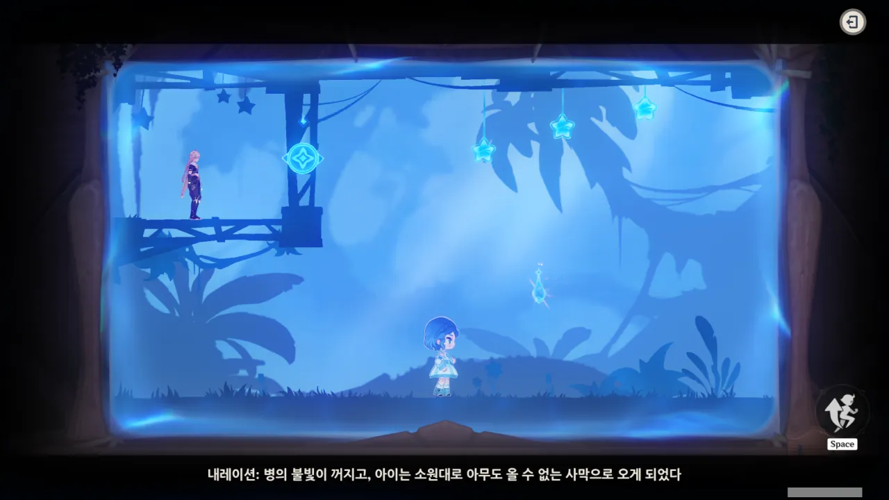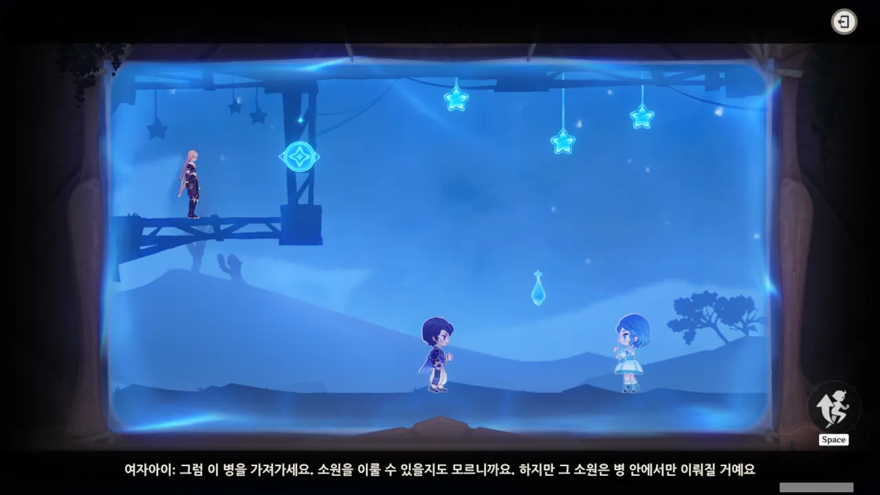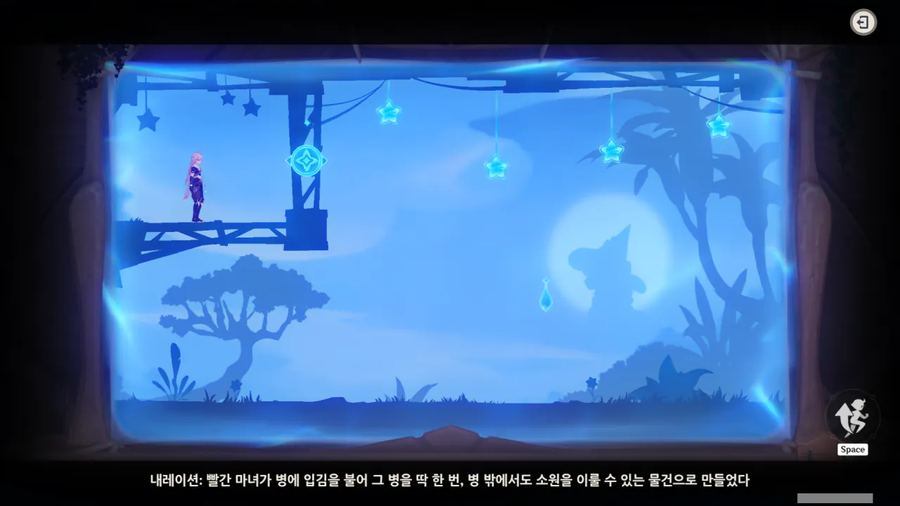 이런 걸 인터랙티브 연극이라 해야 하나? 클레가 병에 바람을 불어넣자, 정말로 병에서 빛이 난다.