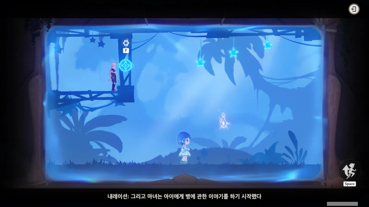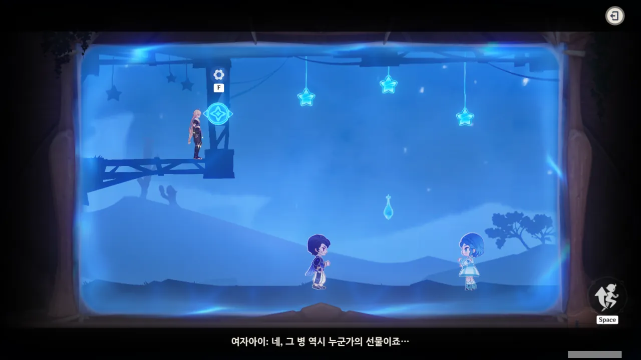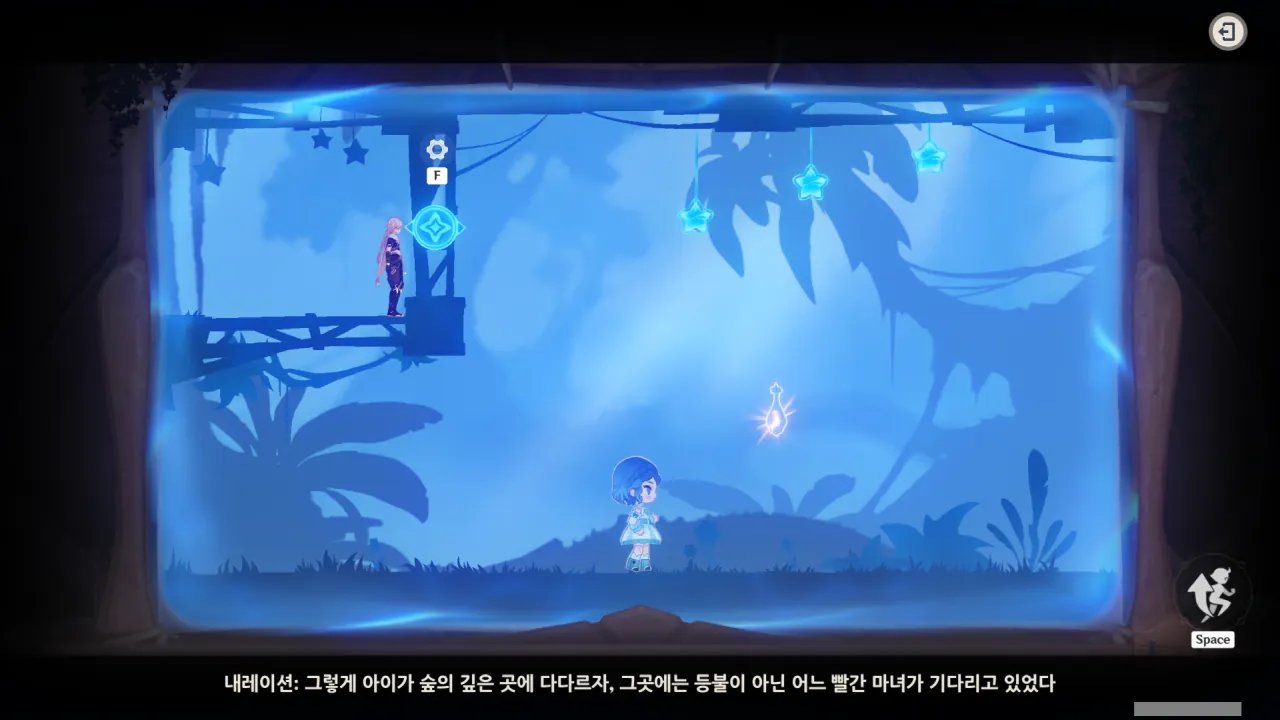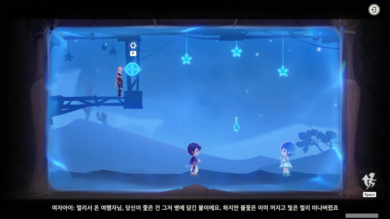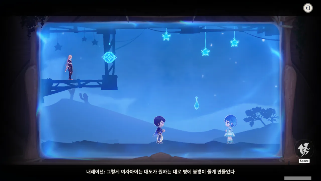 이런 걸 인터랙티브 연극이라 해야 하나? 클레가 병에 바람을 불어넣자, 정말로 병에서 빛이 난다.