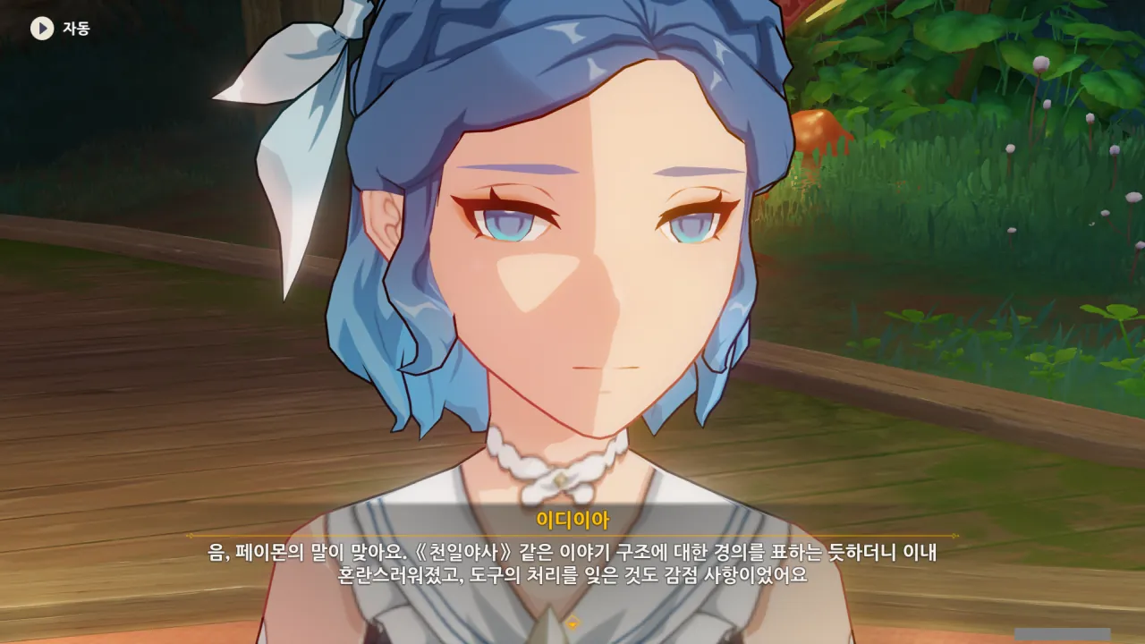 이야기가 해피엔딩으로 끝난 것 하나만큼은 좋았다고 평가하는 이디이아. 그래도 난 이야기의 중반까지는 괜찮다고 생각했는데, 이디이아는 엔딩 하나만 좋았다고 이야기하니, 이디이아가 더 혹평을 내린 셈이다.