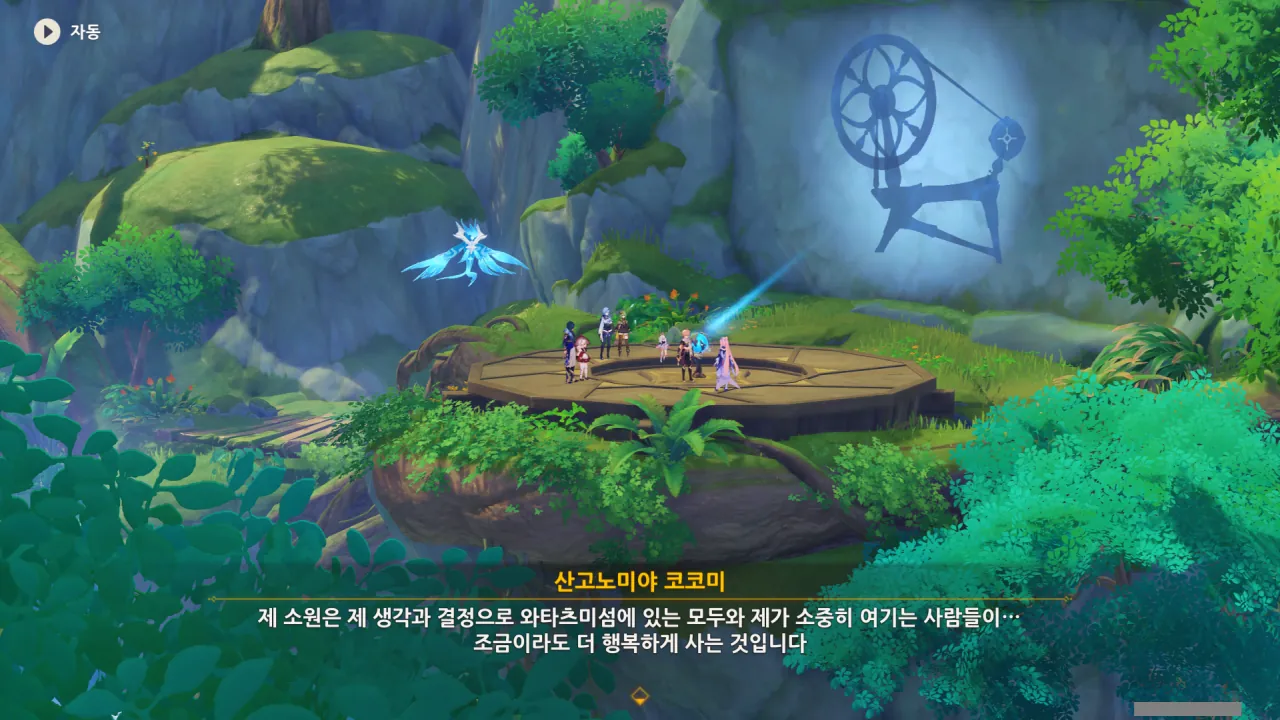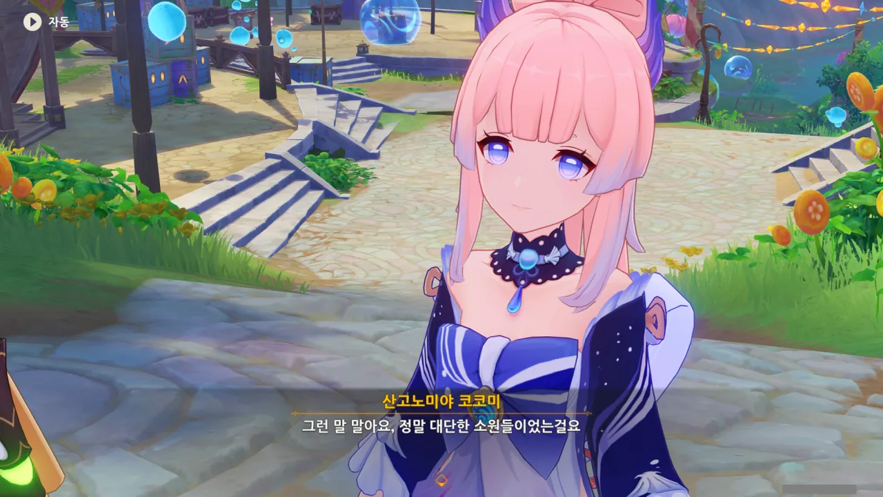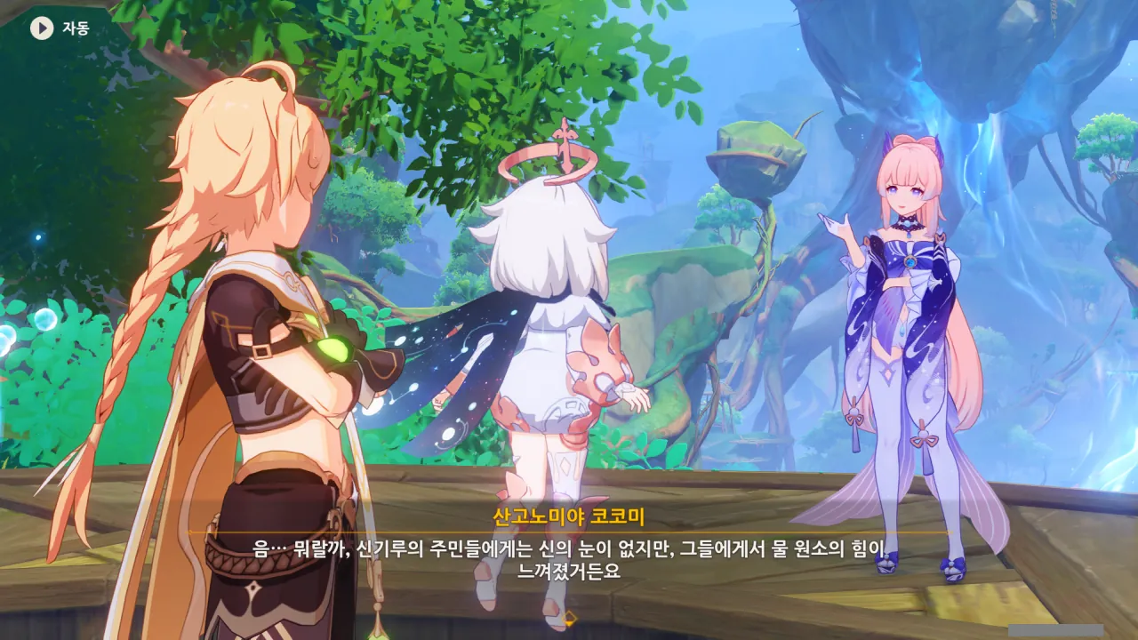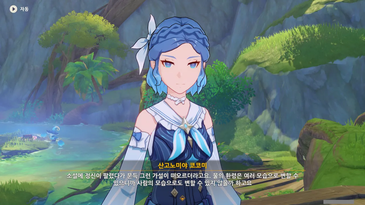 신의 눈을 갖고 있지 않지만 물 원소의 힘이 느껴지는 NPC들을 보며, 물의 환령은 여러 모습으로 변할 수 있으니, 저 NPC들은 물의 환령이 변신한 게 아닐까 하고 추측한 코코미.