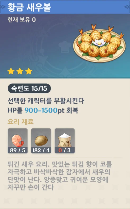 정교한 모양에 담백한 향기를 가졌고, 접시 위에 올려놓으면 간단해 보이는 요리이지만 그걸 만드는 솜씨는 섬세해야 한다. 각청이 좋아하는, 새우라는 해산물을 썼으며, 기름에 튀겼으니, 북두가 좋아하는 뜨거운 요리도 된다.